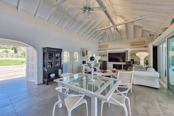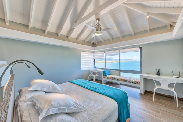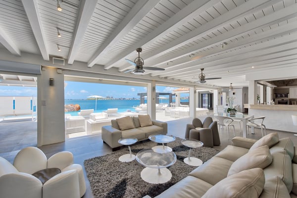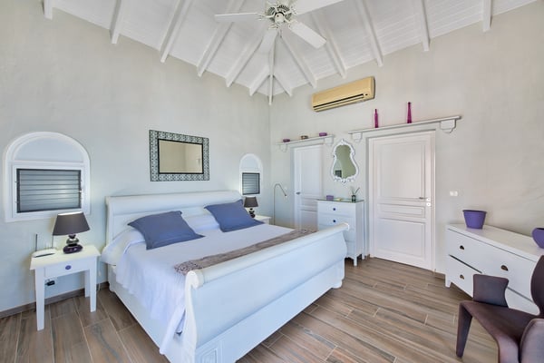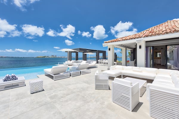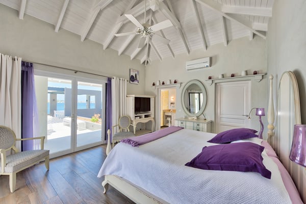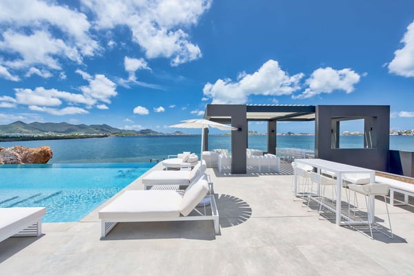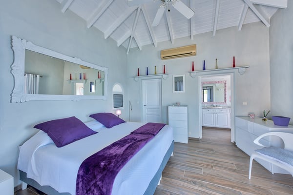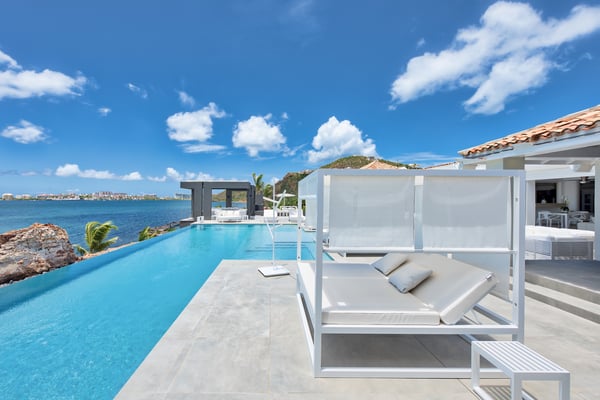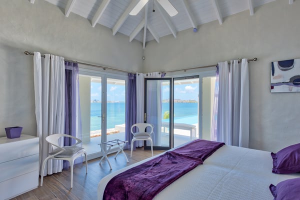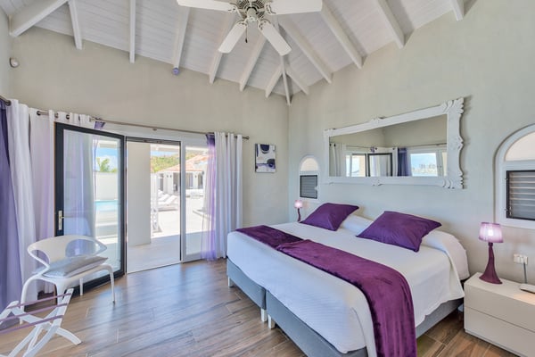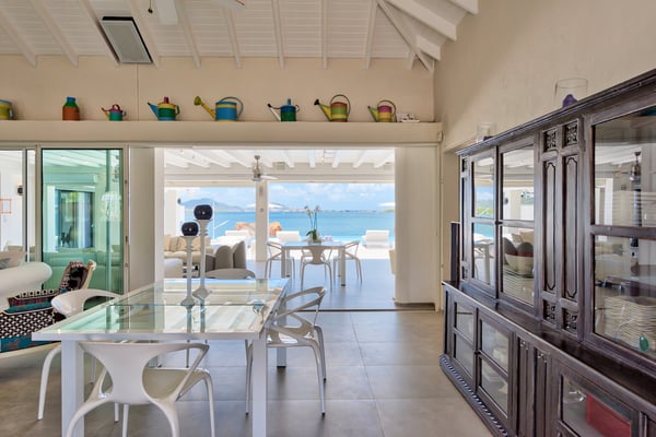 Villa Mirabelle is a stunning waterfront property situated on top of a hill, offering breathtaking views of the Simpson Bay lagoon in St Martin. This gorgeous villa is nestled in the midst of a tropical garden and boasts its own private beach. The villa's prime location allows for easy access to Baie Rouge beach, which is only 300 meters away and can be reached by a pleasant walk. The living room is equipped with a TV, air conditioning, and fans for your comfort, while the covered terrace is also equipped with fans, providing a cool and relaxing space to enjoy the surrounding beauty. Villa Mirabelle features four bedrooms that offer captivating views of the lagoon. Each bedroom is furnished with a king-size bed, a dressing area, and an en-suite bathroom, ensuring privacy and luxury for every guest. The fifth bedroom offers a garden view and its own en-suite bathroom. The villa's kitchen is fully equipped and opens onto the terrace, allowing you to enjoy the lagoon view while preparing meals. It offers everything you need to cater to your culinary desires. Villa Mirabelle is a delightful property for your next vacation in St Martin, whether you are traveling with family or friends. The villa can be rented as a three-bedroom, four-bedroom, or five-bedroom option, depending on your group size and preferences. Additionally, two aqua-bikes are at your disposal, offering a fun and unique way to explore the lagoon. Experience the beauty and tranquility of Villa Mirabelle, where you can create cherished memories on your St Martin getaway.