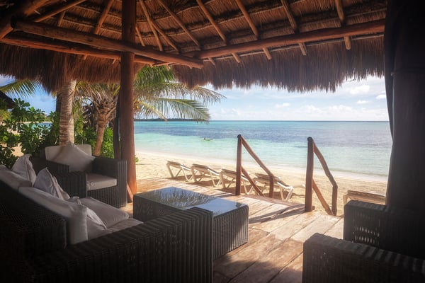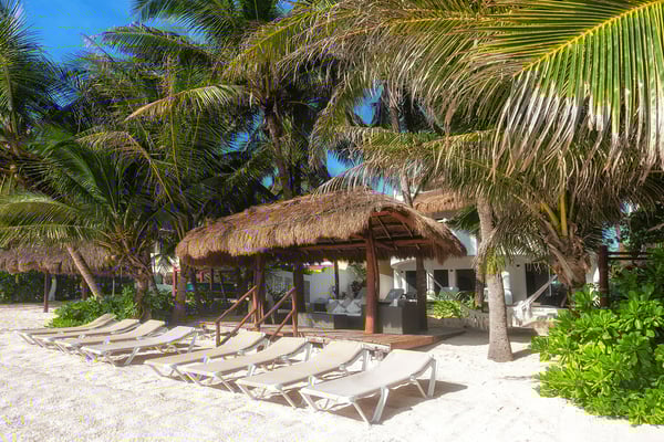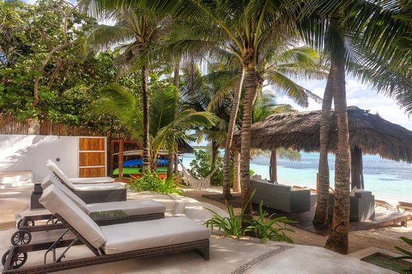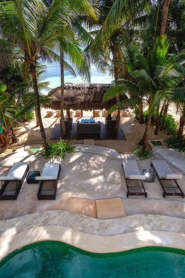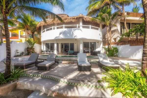 They say “Always aim for the Moon, because even if you miss, you’ll land among the stars.” If you are looking for the best family vacation, then it makes sense to aim high and choose villa Moonstar. Perched on the primary dune in the central part of Soliman Bay, this amazing five-bedroom beachfront villa is a dream vacation home for anyone who appreciates the beauty of the Caribbean, privacy and 5-star comfort. Staying true to its name, villa Moonstar boasts softly curved lines, an elegant décor and a relaxing ambiance. A large open floor space is divided between a cozy living area, a formal dining room and a welcoming fully-equipped kitchen. It’s very easy to feel yourself at home here, laughing and chatting with your family members over a savory home-cooked meal, making plans for the next day or just savoring the views of the pool area and the beach. Large glass sliders open up from the living and dining area to refreshing sea breezes and invite you to spend some time outdoors. Especially since the large, shady pool patio seems as if it has been designed around the concepts of utter enjoyment and relaxation. An outdoor dining area is perfect for enjoying your morning cup of coffee and greeting the sunrise. A built-in grill next to the pool inspires you to organize a cook-out party and drive the neighbors crazy with mouth-watering aromas of sizzling meat and honey-grilled shrimp. Meanwhile, numerous sun loungers and a beach palapa give you an opportunity to relax with a bottle of chilled “cerveza” and admire the aqua-blue waters of Soliman Bay. It’s also a pleasant surprise to discover that all 4 of the villa’s bedrooms feature the same stunning Caribbean views. The downstairs bedroom boasts an extra-large king-size bed and will appeal to those who like the idea of having a full entertainment center, including plasma TV, all to themselves. The two second floor king-size bedrooms come with spacious ensuite bathrooms and private access to a large furnished ocean terrace. An exterior stairway goes up to the beautiful palapa-topped rooftop master bedroom. This is probably the most romantic room, featuring a private furnished deck and elevated views of the Caribbean on one side and lush tropical jungle on the other. Looking out on the turquoise reef of Soliman Bay and light blue sea beyond will make you wish you lived here year-round and were faced only with decisions like “should I snorkel out to the reef, kayak, or just lie around by the pool?” But right now you just have to make one decision that counts the most – to book the amazing beachfront villa Moonstar and embrace an exciting vacation in the Riviera Maya!