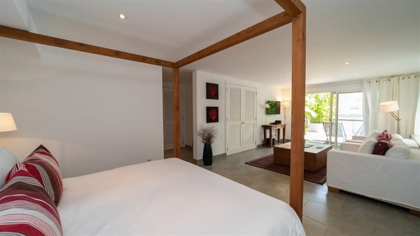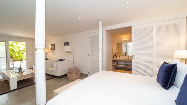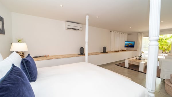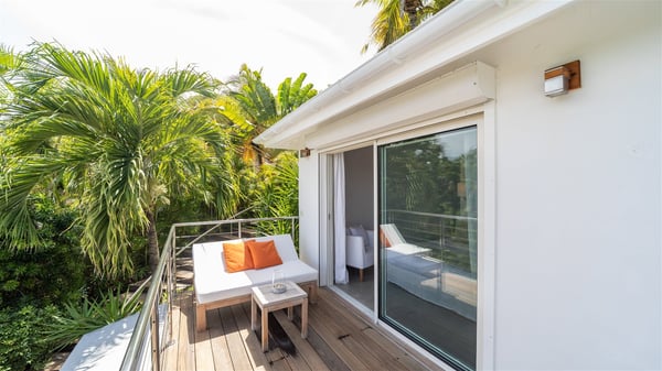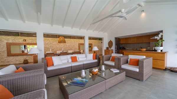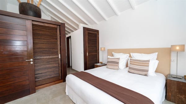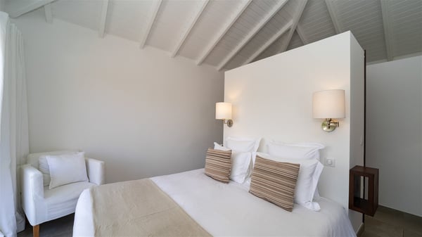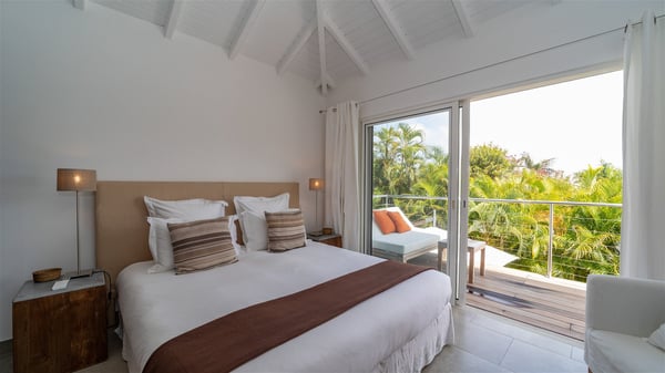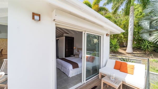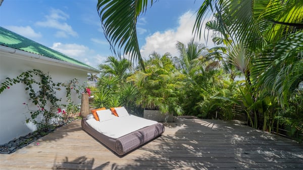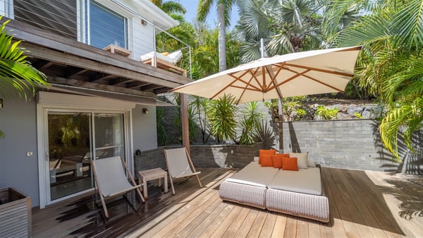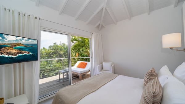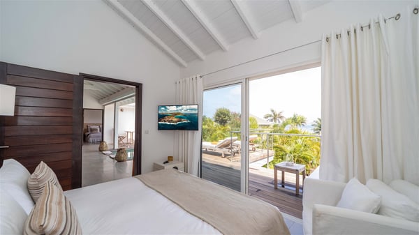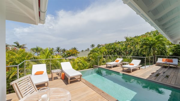 Ideally located in Pointe Milou, the charming rental villa Sakura offers an outstanding view over the ocean, the Lorient Bay and the surrounding islands. It is the perfect place to enjoy St-Barth's glorious sunsets in the evening. Take a breath in the soft and quiet atmosphere and enjoy the breezes as it moves the foliage. Spread out over two levels with privacy areas, the vacation rental villa Sakura is a great choice for friends or families travelling together. The spacious and airy living room opens onto the lovely terrace furnished with woven fibre sofas and armchairs covered with soft cushions, blending perfectly the natural woods and crisp white tones. At the back of the living room on the covered terrace bordered by a stone wall, the dining room features a large table that can accommodate up to eight people. There is a well-equipped kitchen made of wood and stainless steel; a gas barbecue is also at your disposal. The front terrace features a beautiful infinity swimming pool for delightful moments between sky and sea. On either side of the pool, there are comfortable lounge chairs facing the breathtaking panorama. A second terrace overlooks the lush tropical garden on the lower level of the villa. You’ll enjoy this very private and idyllic space furnished with deckchairs and large cream-coloured parasols. The vacation rental villa Sakura in St-Barths welcomes you in four spacious air-conditioned rooms. Each bedroom has a king or queen size bed and an en-suite bathroom. Two suites are located on the lower level with a view over the tropical environment and an access to their terrace, while the other two are on the same level as the living room and offer a spectacular ocean view. The very private rental villa Sakura is a peaceful and very welcoming place for an unforgettable stay in St. Barts.