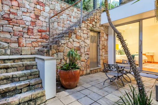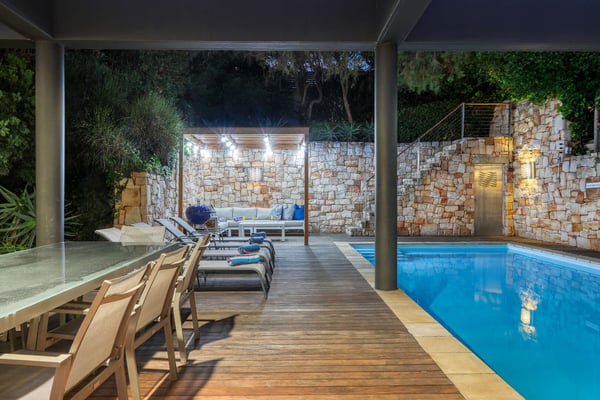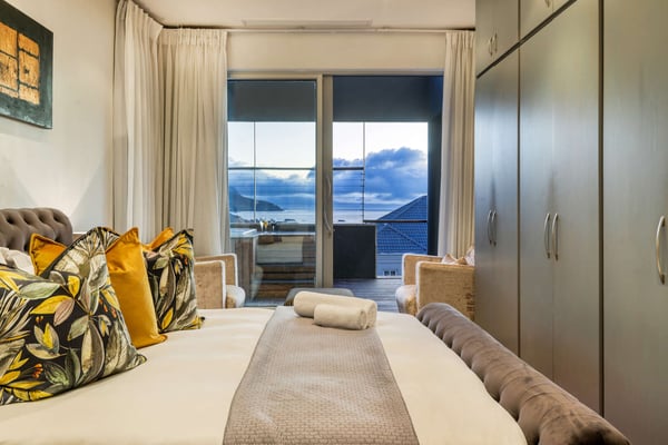 This impressive, large multi-level six-bedroom villa offers the discerning guest panoramic sea views, a good location as well as luxury and privacy. The villa consists of a main house and a flatlet which are accessed by a large flight of stairs from the street entrance. The two-bedroom flatlet consists of a cozy living area, a fully equipped kitchenette and a shared bathroom. The spacious main villa is split over two levels. Located on the lower level are the remaining four bedrooms, three of which are sea-facing and all lead out on a shared wooden deck with a Jacuzzi. The fourth bedroom leads out onto a courtyard area. The heart of the villa is upstairs, where you will find a spacious open-plan living area with wall-to-wall glass doors spilling onto the sheltered back terrace and the large sparkling pool. The dining area flows naturally onto the covered front terrace with the barbecue and comfortable outdoor furniture for those ample days of sunshine, sundowner sessions and wonderful sea and mountain views.