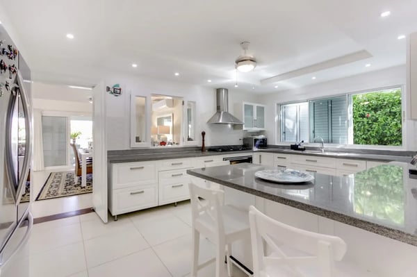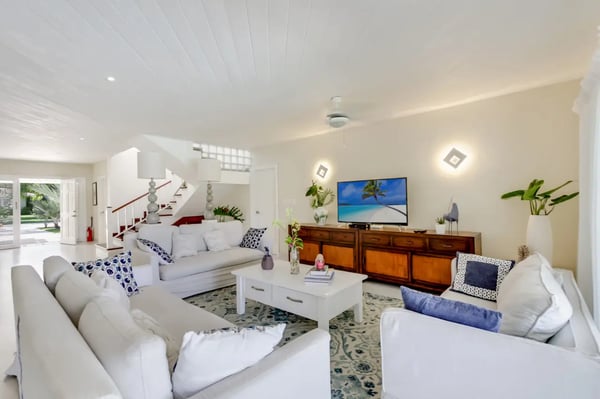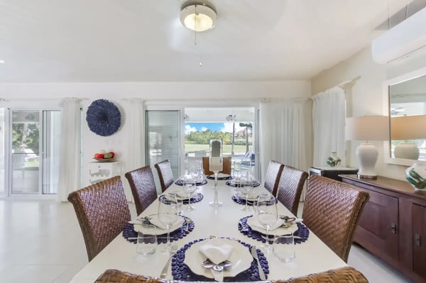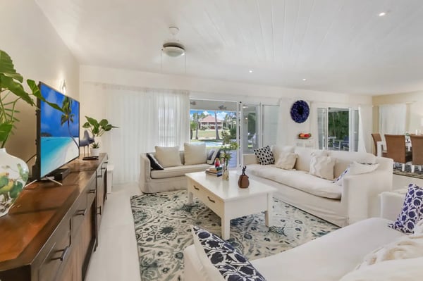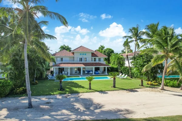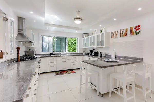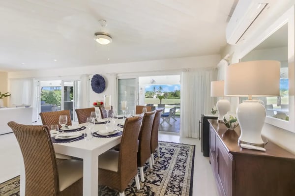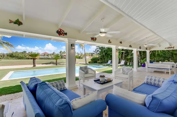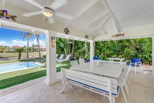 Located within the renowned Punta Cana Resort is Playa Blanca Beach Club, a premier beachfront resort. Guests will have access to all Club facilities including lounge chairs, restaurant ($) and bar ($). The spacious common area instantly welcomes you as you come into the villa and is the perfect place for entertaining, enjoying family dinners, or watching TV. There’s a comfortable sofa area with TV on one side of the common area, a dining area on the other, and access to the kitchen All the furniture in this villa has neutral colors of white and earth tones, mixed with the soothing blue colors of the ocean. The interior of the villa is very clean and clutter-free. Tortuga is a great and very safe neighborhood where most people leave their front- and terrace doors open to let the tropical breeze flow through. The kitchen is fully equipped with everything you need to cook and prepare delicious meals during your vacation. You can also hire a private chef ($) to cook for you and to make your vacation more enjoyable. Slide open the large terrace doors in the living- and dining room to access the outdoor terrace, pool area, and backyard which borders the golf course. The covered terrace with ceiling fans is furnished with an outdoor dining table and a sofa sitting area. Soak up the warm sun on one of the poolside lounge chairs and jump in the pool for a refreshing swim to cool off. The backyard has a nice green lawn and a view of the golf course.