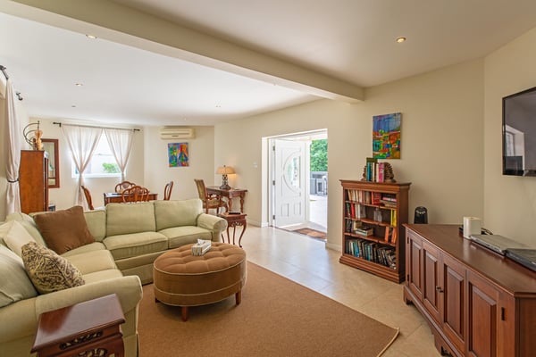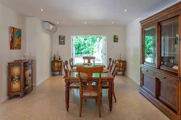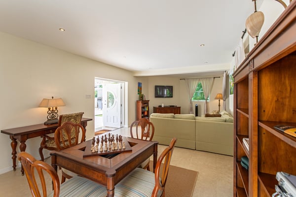 Its aesthetics are clean, sleek, and sophisticated. Its location is ideal and picturesque. Caira House is a 4-bedroom, 4.5-bathroom home sitting on an acre of land with neutral tones, recessed lighting, spacious air-conditioned rooms, and modern finishes. Walk into a fully furnished home that has ready functionality, luxury, and comfort. Enhancing this fabulous property is an outdoor entertaining area, complete with a full wet bar and barbeque. This home is just a 2-minute walk to Mullins Beach. Although the property abuts the main road, privacy and seclusion are guaranteed with spacious grounds which provide an envelope for the house and separation from ongoing traffic. Gorgeous, manicured grounds and a beautifully presented driveway all add to the curb appeal for this home.