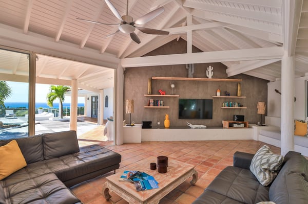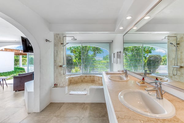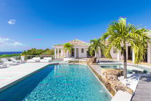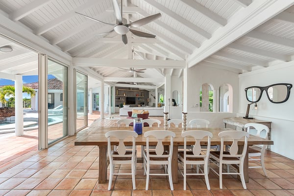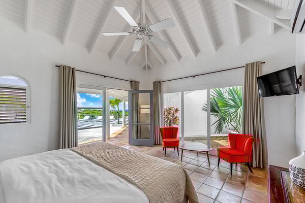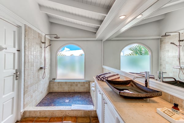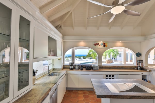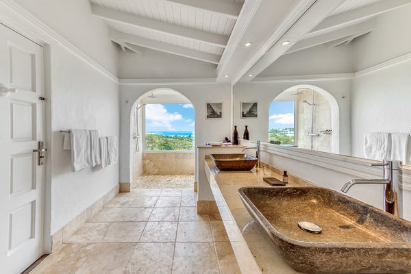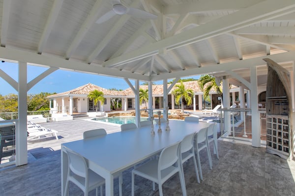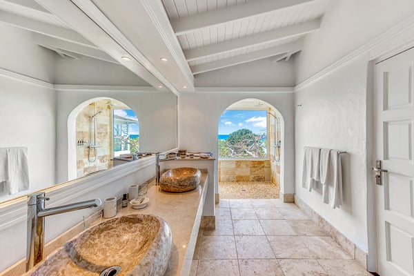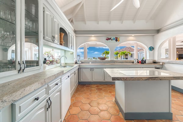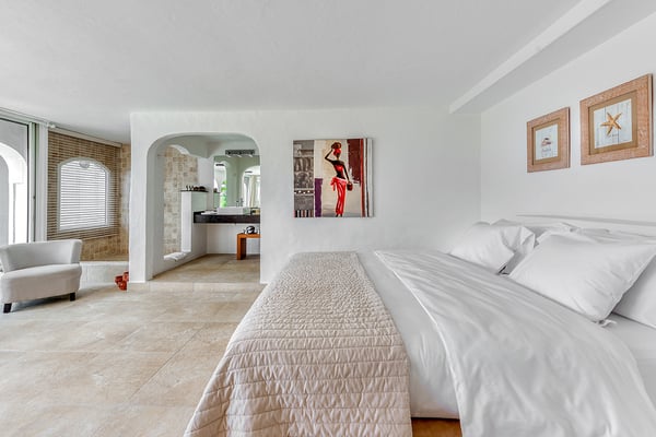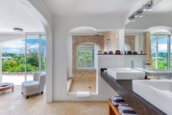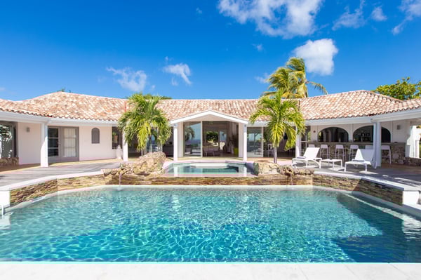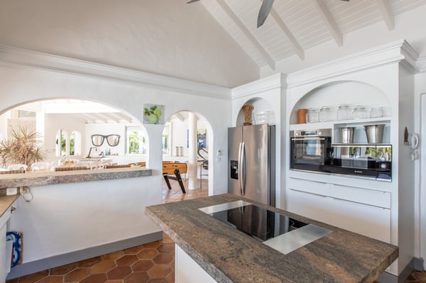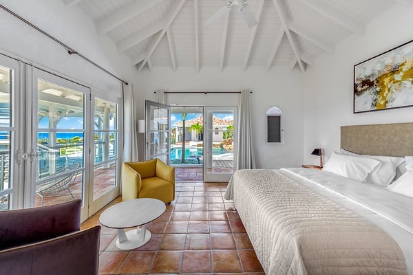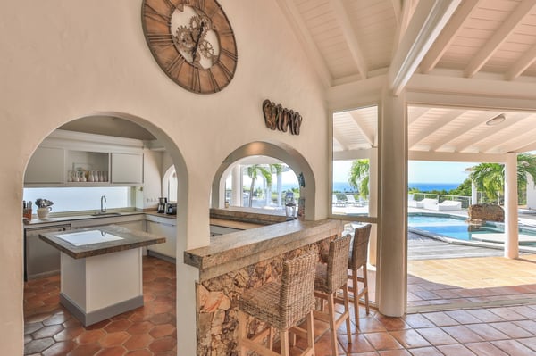The villa Belle Fontaine features an expansive deck with a stunning double pool. The larger pool is complemented by a smaller pool inset with a tiled table, creating a unique and inviting space for relaxation and enjoyment. Adjacent to the pool area, a spacious gazebo provides ample seating for lounging and dining, as well as a built-in BBQ for outdoor cooking. The large gourmet kitchen with its stylish design and large arched windows offers a breathtaking view and connects the kitchen to the terrace. It's a perfect space for culinary enthusiasts to prepare delicious meals while enjoying the beautiful surroundings. Villa Belle Fontaine boasts five spacious bedrooms, each of equal size. Three of the bedrooms offer sea views, while the other two overlook the garden. The spa-style bathrooms are beautifully designed with luxurious fixtures. You'll find large walk-in showers that overlook either the sea or the garden, and one of the bathrooms even features a private outdoor patio. Whether you're enjoying the vibrant sunsets, lounging by the pool, or savoring meals in the gazebo, Villa Belle Fontaine provides the perfect home for a memorable vacation in St. Martin. The villa can be rented as a four or five-bedroom option, allowing flexibility to accommodate different group sizes and preferences. Immerse yourself in the beauty of St. Martin, relax in the elegant surroundings, and create cherished memories with your family or friends at Villa Belle Fontaine.