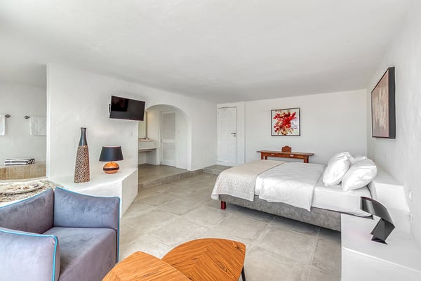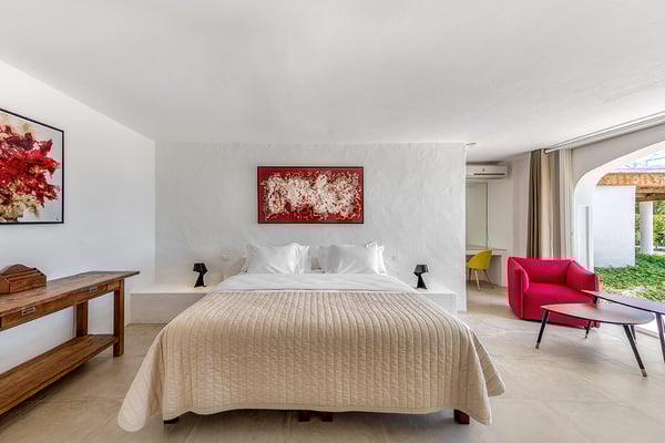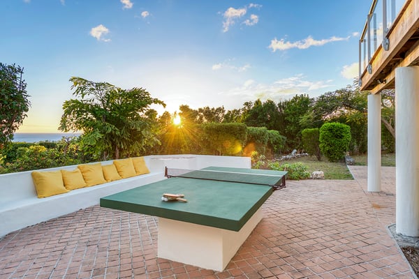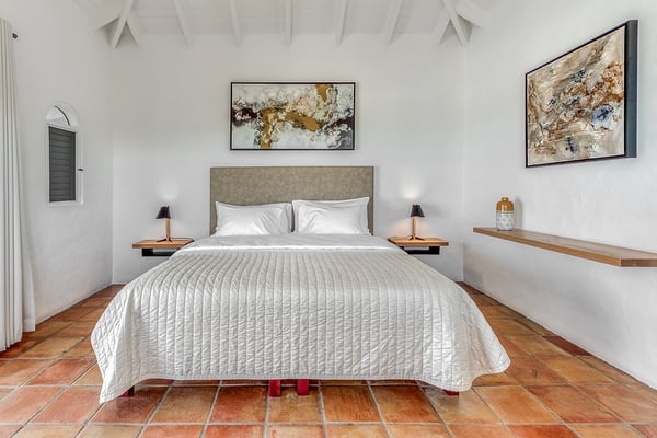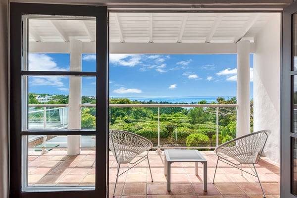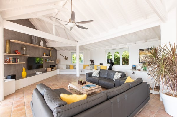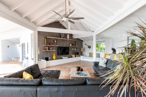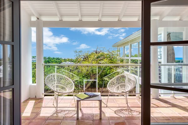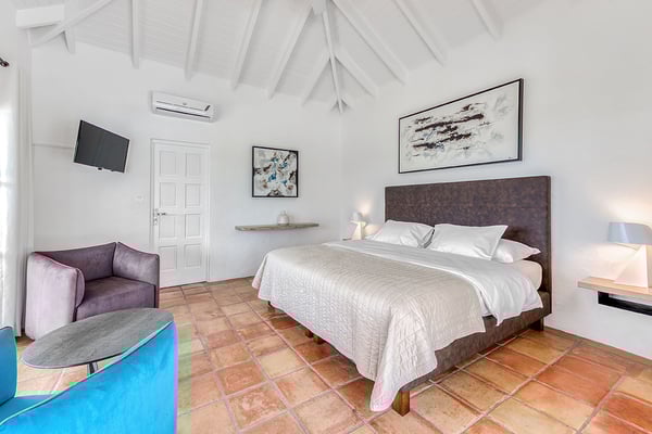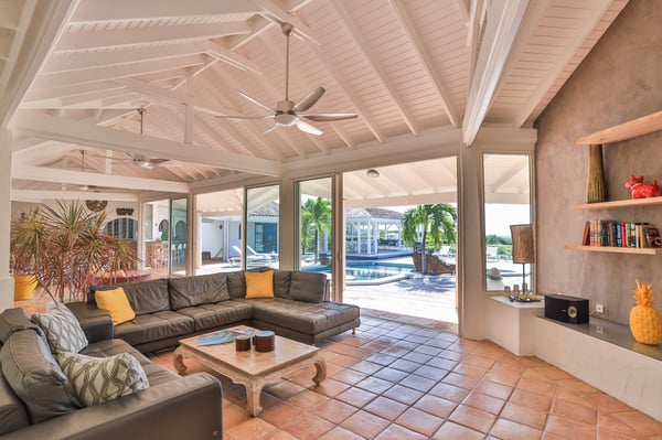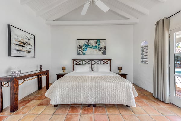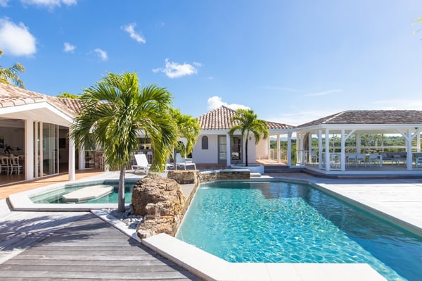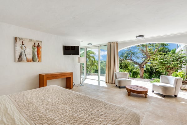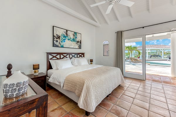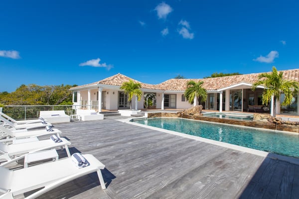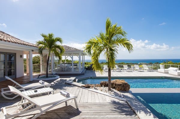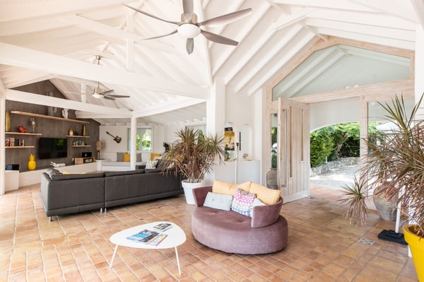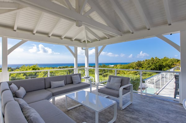 The villa Belle Fontaine features an expansive deck with a stunning double pool. The larger pool is complemented by a smaller pool inset with a tiled table, creating a unique and inviting space for relaxation and enjoyment. Adjacent to the pool area, a spacious gazebo provides ample seating for lounging and dining, as well as a built-in BBQ for outdoor cooking. The large gourmet kitchen with its stylish design and large arched windows offers a breathtaking view and connects the kitchen to the terrace. It's a perfect space for culinary enthusiasts to prepare delicious meals while enjoying the beautiful surroundings. Villa Belle Fontaine boasts five spacious bedrooms, each of equal size. Three of the bedrooms offer sea views, while the other two overlook the garden. The spa-style bathrooms are beautifully designed with luxurious fixtures. You'll find large walk-in showers that overlook either the sea or the garden, and one of the bathrooms even features a private outdoor patio. Whether you're enjoying the vibrant sunsets, lounging by the pool, or savoring meals in the gazebo, Villa Belle Fontaine provides the perfect home for a memorable vacation in St. Martin. The villa can be rented as a four or five-bedroom option, allowing flexibility to accommodate different group sizes and preferences. Immerse yourself in the beauty of St. Martin, relax in the elegant surroundings, and create cherished memories with your family or friends at Villa Belle Fontaine.