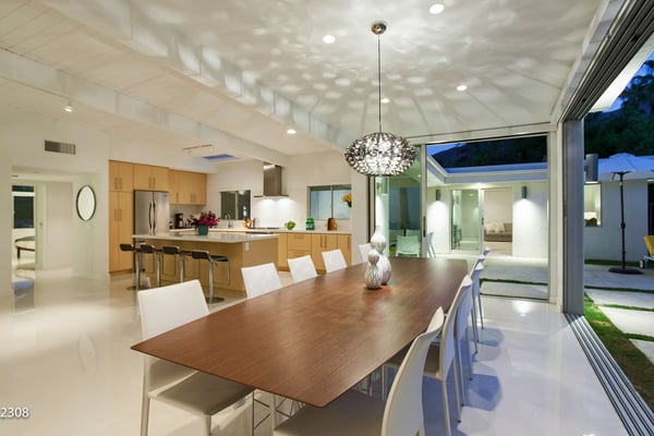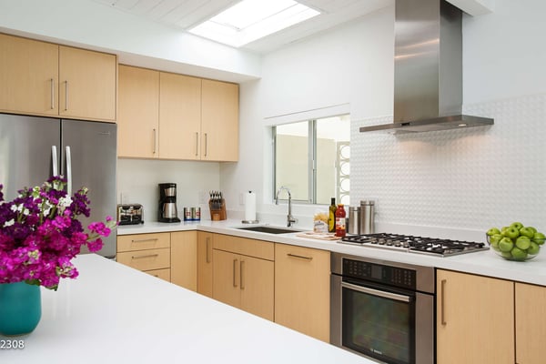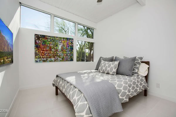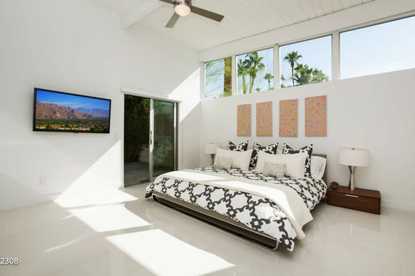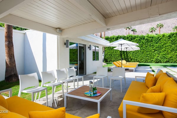 Constructed in 1960 and thoughtfully updated, this expanded floor plan Alexander home is situated in the heart of Vista Las Palmas, one of Palm Springs' most desirable neighbourhoods. Three of the bedrooms are located in the main house, with the fourth located in the poolside Casita. The primary suite features a California king-sized bed, custom blackout window treatments, en suite bathroom and, private patio. The other two bedrooms in the main house each offer custom blackout window treatments for the home’s signature clerestory windows. One of these bedrooms features a California king-sized bed, while the second offers a queen. The remaining bedroom in the casita houses a California king-sized bed, a kitchenette with bar sink, refrigerator and icemaker, as well as a private en-suite bath. La Paloma Palms brings resort-style amenities to this private Palm Springs vacation home. There is a covered patio between the main house and the casita, as well as a saline pool with an integrated tanning shelf and custom spa. Additionally, an outdoor living room has a propane grill and bar sink. Please note this home allows pets for an additional fee. Please be advised that dogs are not permitted in the pool. Permit #2308