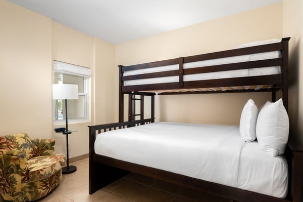 This 2 2-bedroom lanai Bungalow has a spacious, 625 sq. ft. private lanai -- perfect for outdoor entertaining. Accessed via sliding glass doors from the living room and master bedroom, the lanai features a BBQ grill, dining level fire pit and verdant landscaping. Guests especially appreciate relaxing on this private, outdoor patio. The full kitchen, with quartz countertops and stainless appliances, invites easy meal preparation. Spaciousness, tile flooring and a queen-sized sleeper sofa highlight the living room. A king-size pillow-top bed, Carrara marble double vanity and a glass shower highlight the master suite. A guest bedroom with twin beds or a twin over a queen bunk bed, a full guest bath, and a washer/ dryer have been thoughtfully included. Nestled in a tropical setting with just 24 bungalows surrounding a lovely courtyard pool and hot tub, this accommodation offers privacy and value. The 2 bedroom Lanai Bungalow is located in buildings 5, 6 & 7, a 2-minute stroll to the beach and dining.