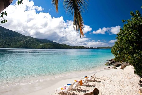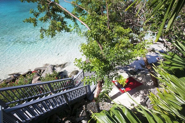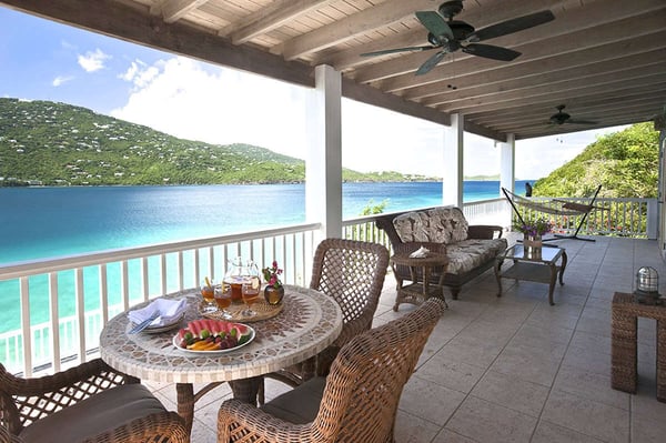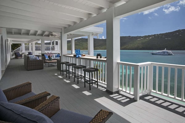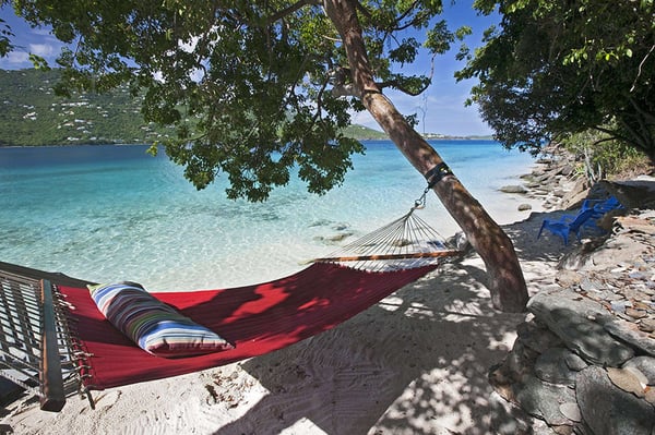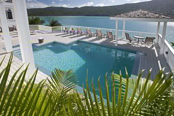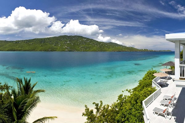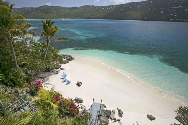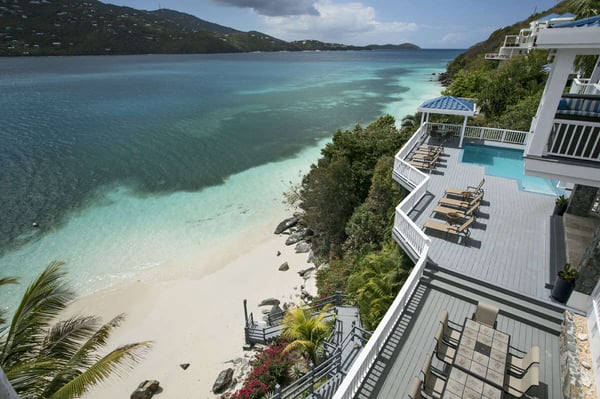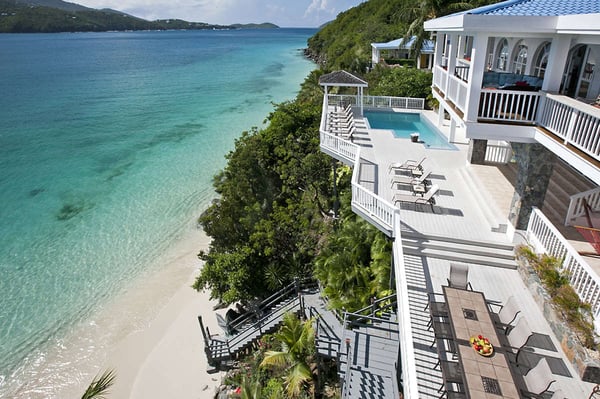 Sand Dollar Estate, the ultimate luxury vacation villa rental in St. Thomas, has a six-bedroom main villa, a three-bedroom romantic guest cottage, and two connecting bungalows. In total, the estate can accommodate 30 people, making it the perfect Caribbean location for vacationing with friends or family. It's all set on an exceptional 2.5-acre estate with its own pristine white sand beaches on Magen's Bay. Amid tropical trees and luxuriant blossoms, this U.S. Virgin Islands estate offers luxury and seclusion only steps away from the crystal blue waters of the sea. This luxurious private Caribbean villa rental is complete with every amenity, from powder white sand beaches, flat-screen TVs, WI-FI through-out the property, spa and exercise rooms, gourmet kitchens with top of line appliances... no details have been overlooked. Sand Dollar Estate, Little Sand Dollar, and the Bungalows are fully air-conditioned and furnished to exceptional standards. The interiors offer beautiful marble floors and a tasteful blend of contemporary and island decor. Soothing shades of taupe woods, creamy yellows and soft pastels provide a relaxing environment. Full-length windows capitalize on spectacular views of the blue waters of Magen's Bay - and the villa's white sand beach. Sand Dollar is the estate's largest villa property and it is built on several levels. The upper level opens to two expansive king bedroom suites each with its own large bath and deck with an outdoor shower. Each has a separate alcove with sofabed perfect for young children. Steps lead to the main level which offers a gourmet kitchen with granite countertops, two stoves and high-end appliances. Also on this level is an office with a wireless printer, modem, and computer, a spacious living area with a huge flat-screen TV and surround sound, and the third bedroom with a king-size bed and full bath. The main level opens to a spacious deck. A short flight of stairs leads down to the generous pool level and to three more air-conditioned bedroom suites, each with its own full bath and sitting area. This lower level of bedroom suites works well for families with young children, as all suites are built around a common gaming area.