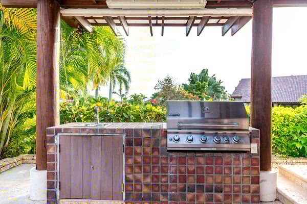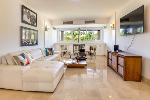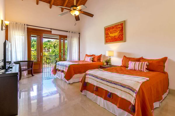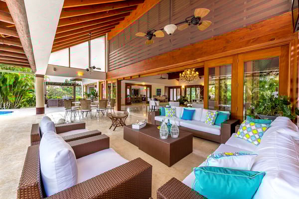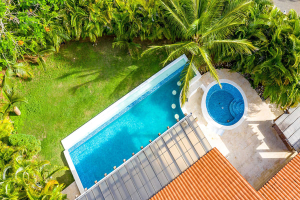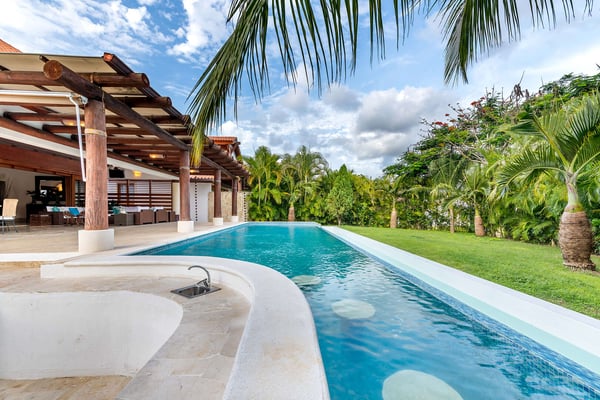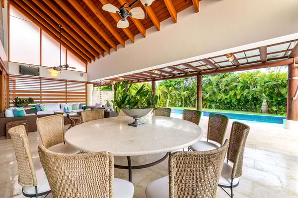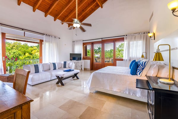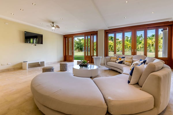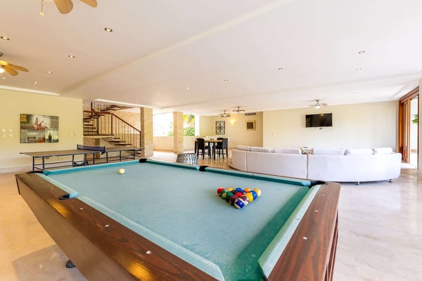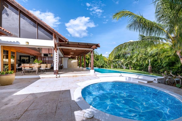 All guests must register with the Casa de Campo Concierge office, and for a small daily fee ($30 per adult per night & $15 per child per night), are granted access to resort areas and amenities. Casa de Campo Resort facilities and amenities include golf courses ($), the fitness centre ($), racquet center ($), restaurants ($) and bars ($). Contact Rental Escapes for more information about pricing. Casa Serena is a luxurious six-bedroom villa designed for comfort and elegance, offering the perfect balance of indoor and outdoor living. The main floor features a grand living area with high ceilings, a formal dining room, and an open terrace with a casual dining space. Outside, guests can enjoy a pool, Jacuzzi, and a barbecue area ideal for entertaining. This floor includes four bedrooms: two master suites, one with a private outdoor Jacuzzi and the other with an indoor Jacuzzi, along with two guest bedrooms. A fully equipped main kitchen, a cozy studio with a TV, and a sitting area complete this level. The lower floor boasts two additional bedrooms, a spacious living and game room with a Ping Pong table, a pool table, and a TV, making it perfect for recreation. This floor also includes two maids’ quarters with private bathrooms, a laundry area, and a service kitchen. The expansive backyard offers a trampoline, a volleyball area, and picnic tables for outdoor fun. One of Casa Serena’s most distinctive features is its wrap-around veranda, accessible from each bedroom, providing the perfect spot to enjoy morning coffee or relax while taking in the serene views. Casa Serena combines thoughtful design and modern amenities, creating a memorable getaway for families and groups.