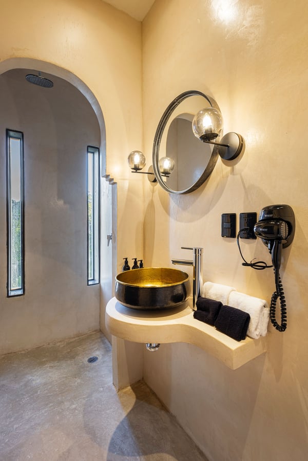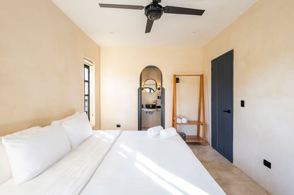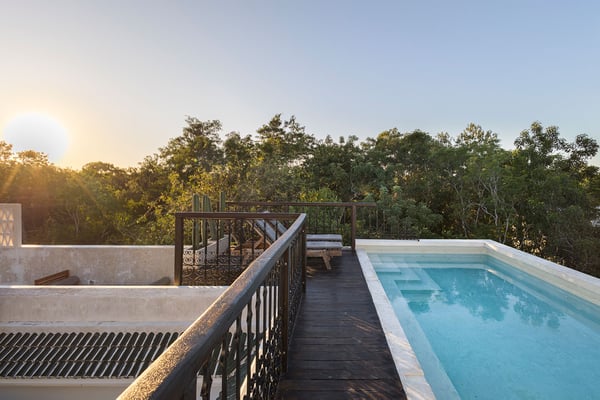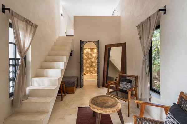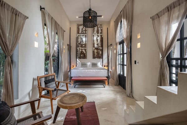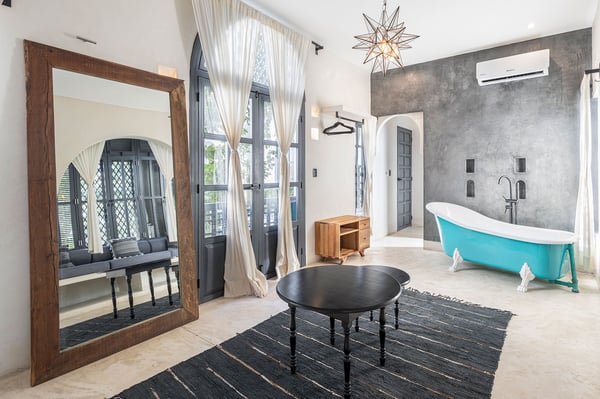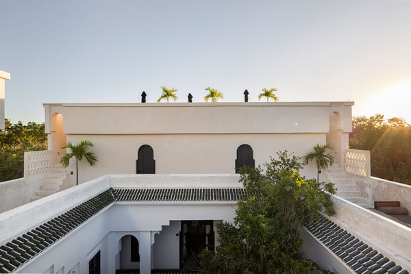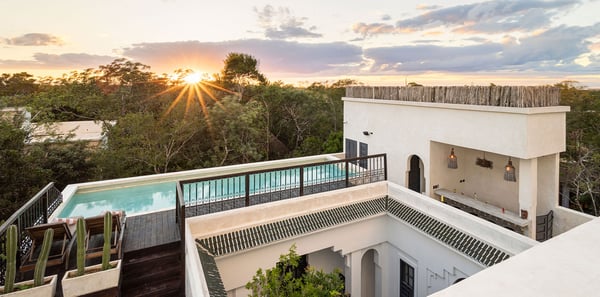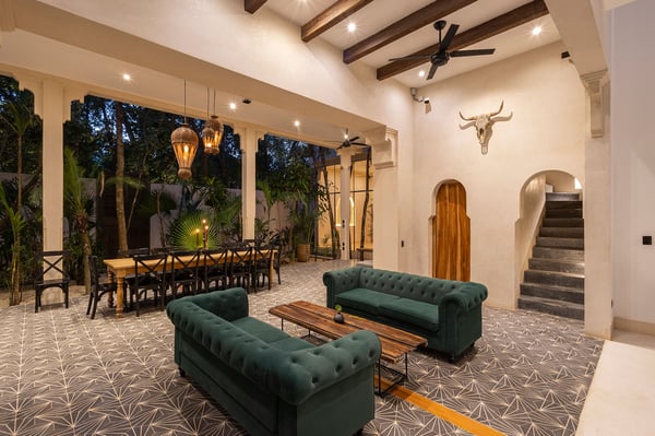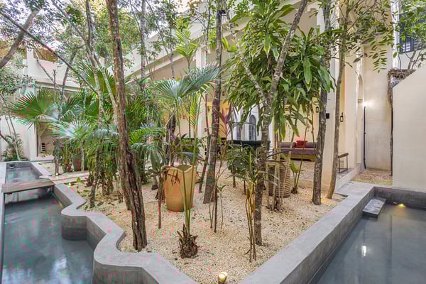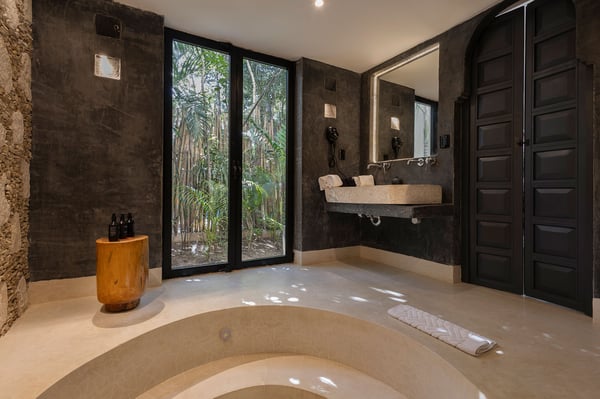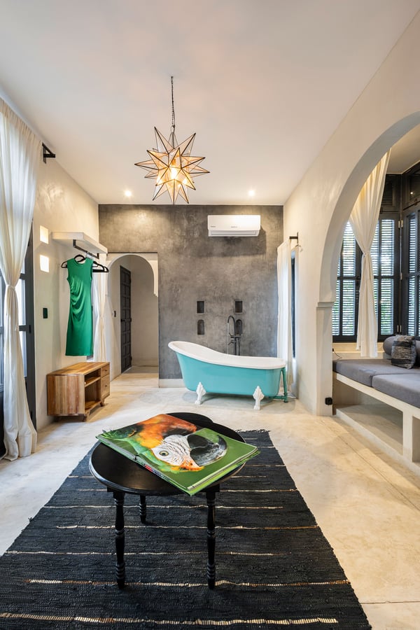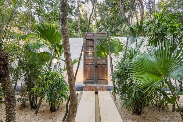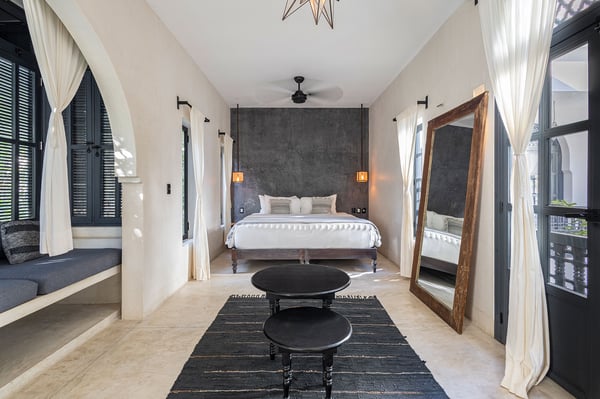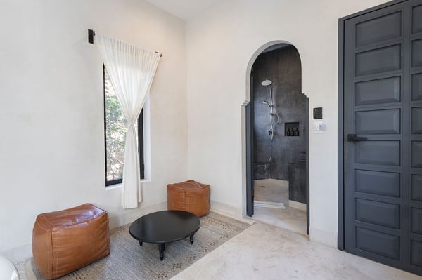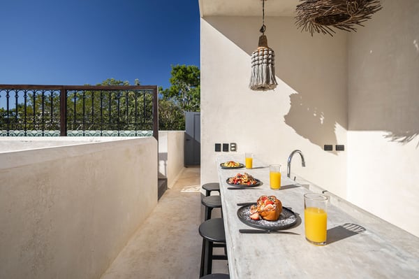 Picture a Moorish palace in the middle of the jungle. Now make it modern. With eight bedrooms, a patio jacuzzi, and a rooftop pool, Yum Kaax is an architectural and cultural fusion surrounded by Tulum’s green nature. Named after the Maya god of the forest, this home was built to connect with the lush environment. The interior design is a visual delight. Round Morrocan arches, earthy hues, and fine materials give the residence a regal feel, while the architecture allows for seamless indoor-outdoor transitions that will submerge you in the vibrant landscape. Each of the eight bedrooms has a king-size bed and private bathroom, six with tubs and some of them elegantly integrated into the suite. The common areas are equally refined. The large dining table is located just by the patio jacuzzi and the elegant gardens. On the rooftop terrace, you will find sun loungers, the main swimming pool, and an ideal spot to spend the evenings overlooking the canopy of the jungle. This private villa in Tulum is located in one of the newest residential areas in town, a quiet neighborhood just 5 minutes away from the city center and about 15 minutes from the beach.