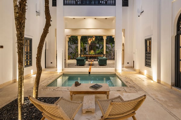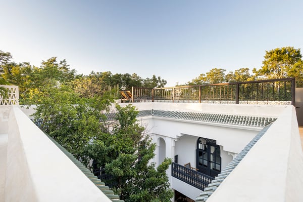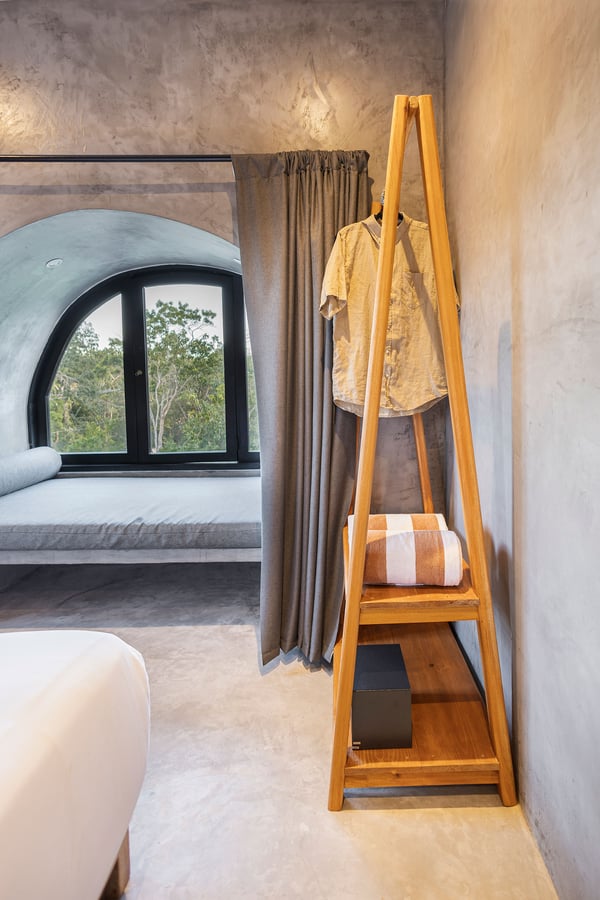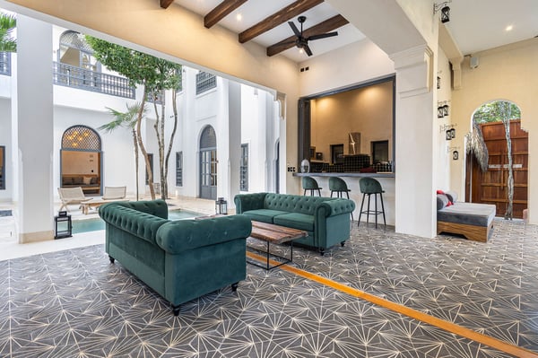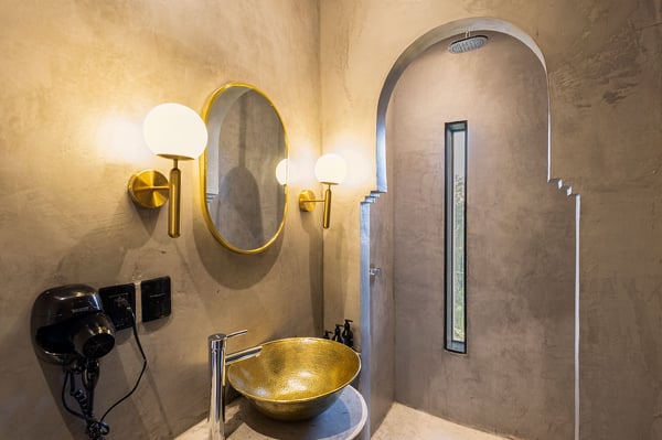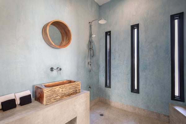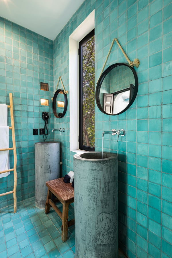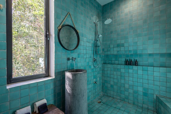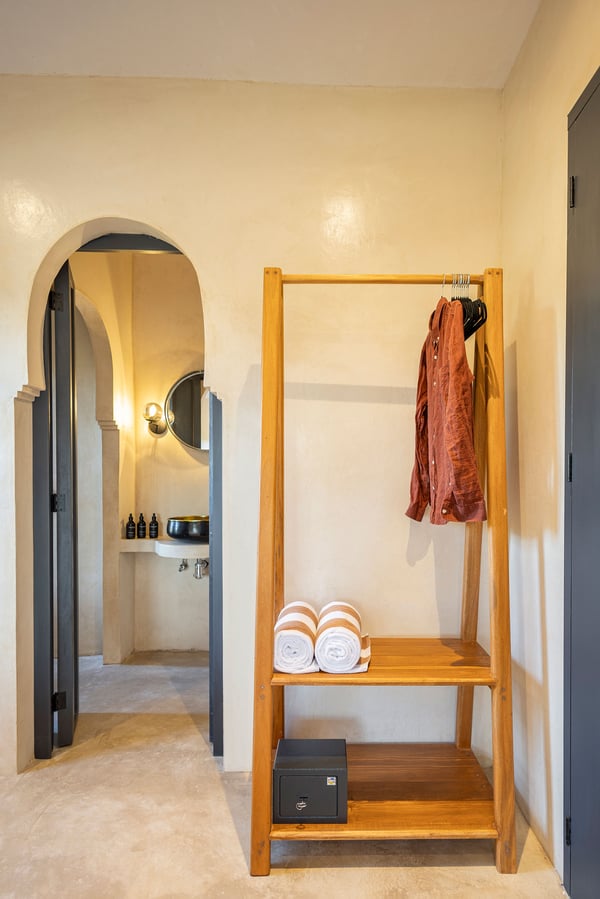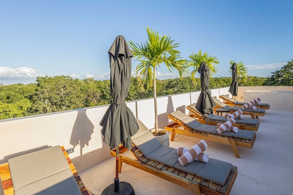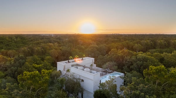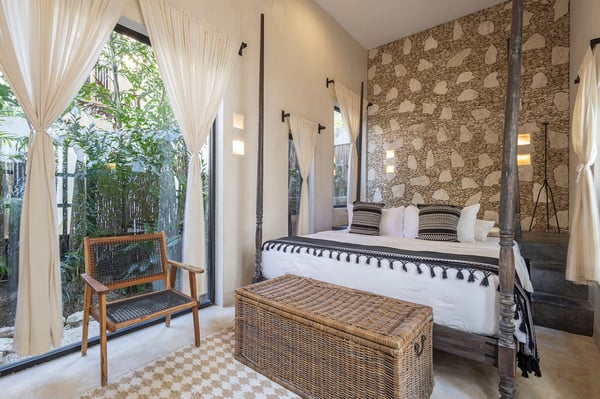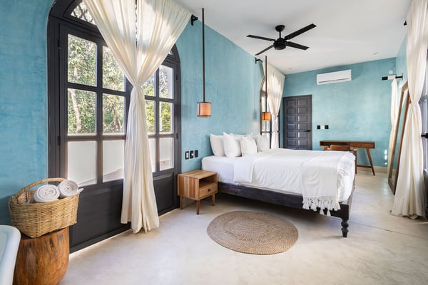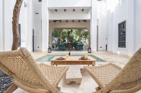 Picture a Moorish palace in the middle of the jungle. Now make it modern. With eight bedrooms, a patio jacuzzi, and a rooftop pool, Yum Kaax is an architectural and cultural fusion surrounded by Tulum’s green nature. Named after the Maya god of the forest, this home was built to connect with the lush environment. The interior design is a visual delight. Round Morrocan arches, earthy hues, and fine materials give the residence a regal feel, while the architecture allows for seamless indoor-outdoor transitions that will submerge you in the vibrant landscape. Each of the eight bedrooms has a king-size bed and private bathroom, six with tubs and some of them elegantly integrated into the suite. The common areas are equally refined. The large dining table is located just by the patio jacuzzi and the elegant gardens. On the rooftop terrace, you will find sun loungers, the main swimming pool, and an ideal spot to spend the evenings overlooking the canopy of the jungle. This private villa in Tulum is located in one of the newest residential areas in town, a quiet neighborhood just 5 minutes away from the city center and about 15 minutes from the beach.