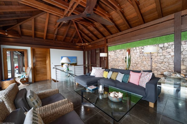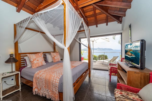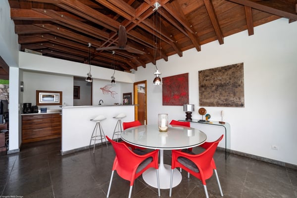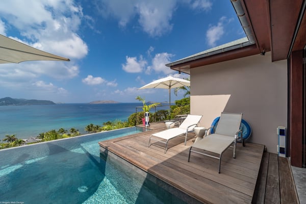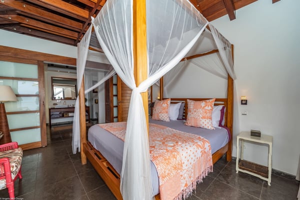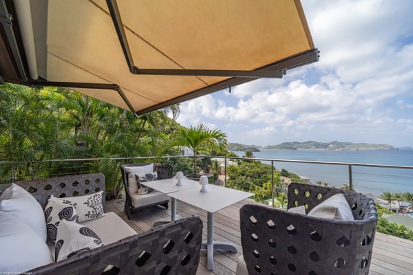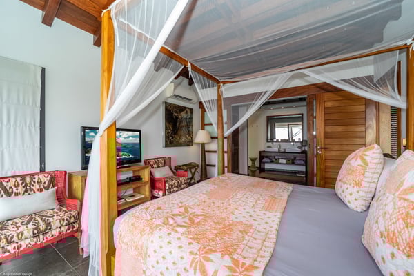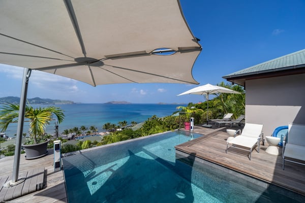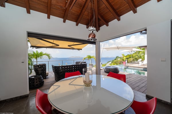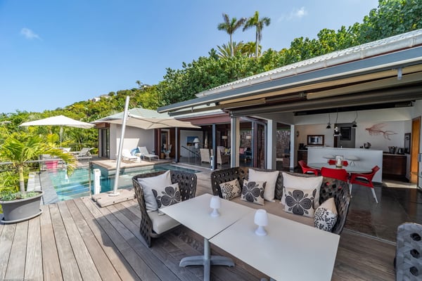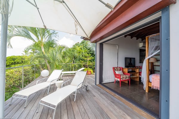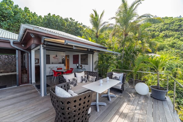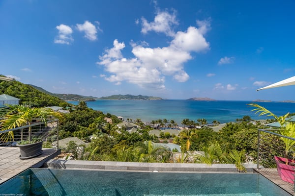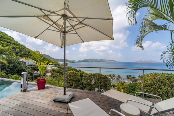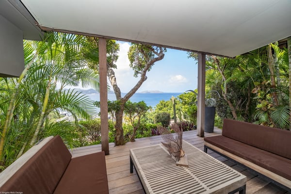 Ideally located in Pointe Milou, the charming holiday rental Villa Ids offers a spectacular view over the ocean, the bay of Lorient and the surrounding islands. It is the perfect place for enjoying the unforgettable sunsets of St Barths, where you can breathe in a most relaxing atmosphere right in nature's showroom of leaves. As it is built on two floors, privacy areas can be preserved, which groups of friends or families travelling together will appreciate. The modern living room is completely open to the terrace, so that you can enjoy the amazing view at any time. Under a vaulted ceiling providing a comfortable feeling of volume, the sellek decoration and the red and gray cushions give this space a cozy and refined atmosphere. The well-equipped kitchen with a breakfast bar is located in the extension of the living area. The red dining table and chairs bring dynamism and originality to the whole, for unforgettable moments of gastronomy and conviviality. A barbecue is also at your disposal to cook delicious meals under the stars. Take a few steps to the terrace with its breathtaking views. There is a beautiful swimming pool surrounded by sunbathing areas where you can enjoy the St Barths sun. A table with sofas and armchairs are set up at the end of the terrace, where you can have precious times in the morning or at the end of the day, facing the magical show of the glorious sunsets over the bay. Everywhere, the tropical vegetation draws a vegetal frame that dresses the villa in green nuances. Villa Ids in St Barts has two beautiful air-conditioned bedrooms with a nice ocean view. Both have king canopy beds with curtains. One suite is located on the main level near the living room and opens onto the terrace. The other bedroom is located on the lower level opening onto a private terrace with a coffee table and exotic wood benches to relax. This bedroom also has an office space perfectly arranged with a bench. Each bedroom has its own en-suite bathroom, including one with a very spacious outdoor covered shower. Villa Ids at Pointe Milou offers all the luxury and comfort you are looking for on your very private St Barths vacation.