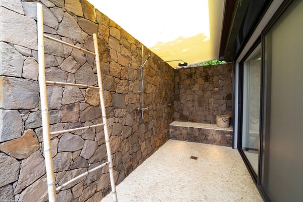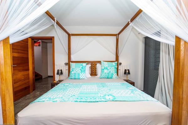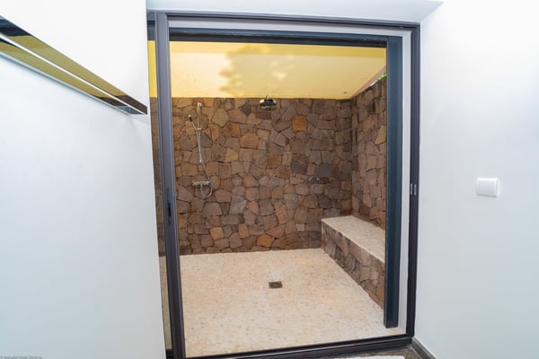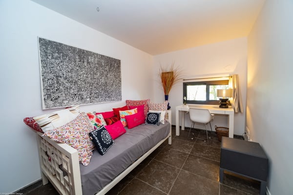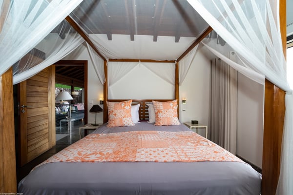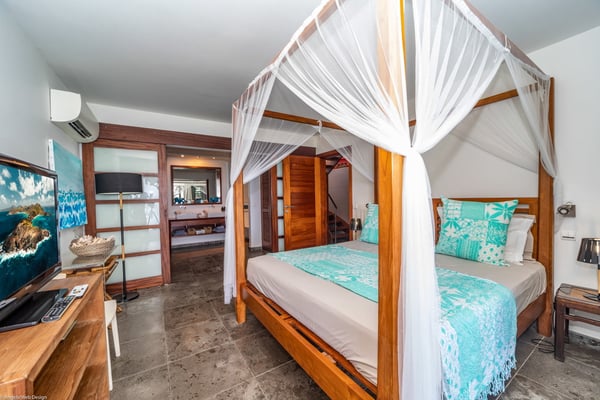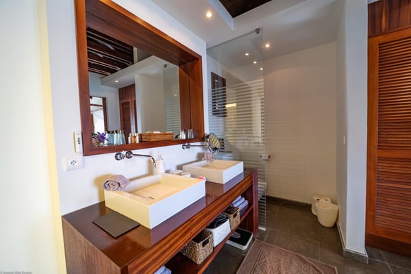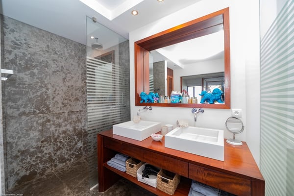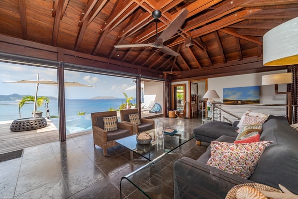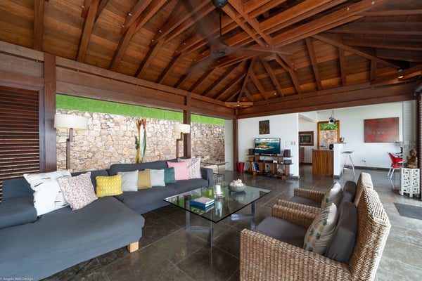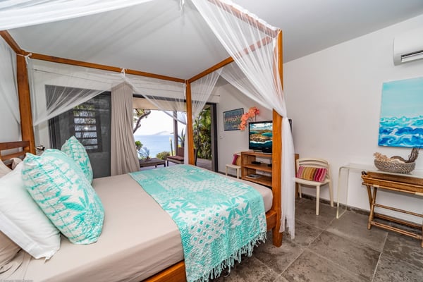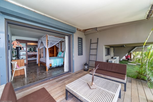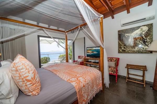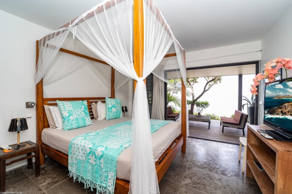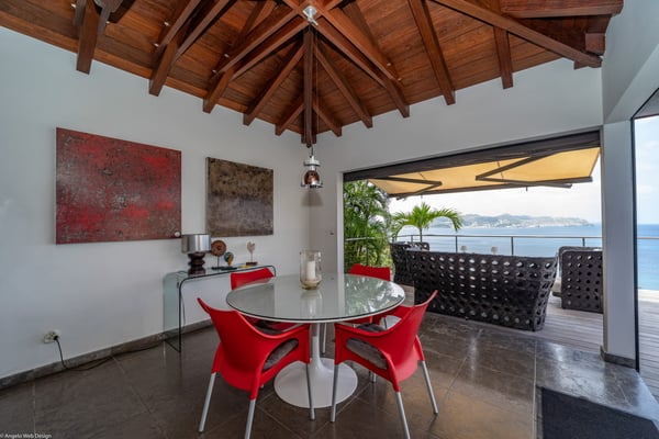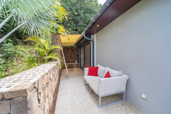 Ideally located in Pointe Milou, the charming holiday rental Villa Ids offers a spectacular view over the ocean, the bay of Lorient and the surrounding islands. It is the perfect place for enjoying the unforgettable sunsets of St Barths, where you can breathe in a most relaxing atmosphere right in nature's showroom of leaves. As it is built on two floors, privacy areas can be preserved, which groups of friends or families travelling together will appreciate. The modern living room is completely open to the terrace, so that you can enjoy the amazing view at any time. Under a vaulted ceiling providing a comfortable feeling of volume, the sellek decoration and the red and gray cushions give this space a cozy and refined atmosphere. The well-equipped kitchen with a breakfast bar is located in the extension of the living area. The red dining table and chairs bring dynamism and originality to the whole, for unforgettable moments of gastronomy and conviviality. A barbecue is also at your disposal to cook delicious meals under the stars. Take a few steps to the terrace with its breathtaking views. There is a beautiful swimming pool surrounded by sunbathing areas where you can enjoy the St Barths sun. A table with sofas and armchairs are set up at the end of the terrace, where you can have precious times in the morning or at the end of the day, facing the magical show of the glorious sunsets over the bay. Everywhere, the tropical vegetation draws a vegetal frame that dresses the villa in green nuances. Villa Ids in St Barts has two beautiful air-conditioned bedrooms with a nice ocean view. Both have king canopy beds with curtains. One suite is located on the main level near the living room and opens onto the terrace. The other bedroom is located on the lower level opening onto a private terrace with a coffee table and exotic wood benches to relax. This bedroom also has an office space perfectly arranged with a bench. Each bedroom has its own en-suite bathroom, including one with a very spacious outdoor covered shower. Villa Ids at Pointe Milou offers all the luxury and comfort you are looking for on your very private St Barths vacation.