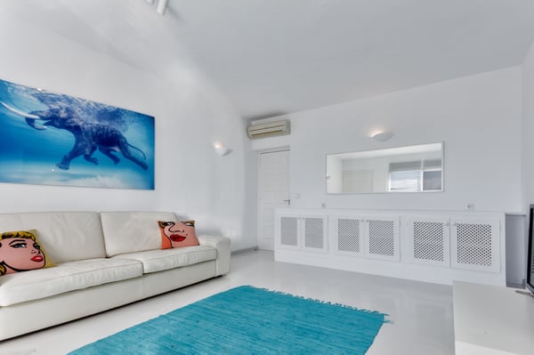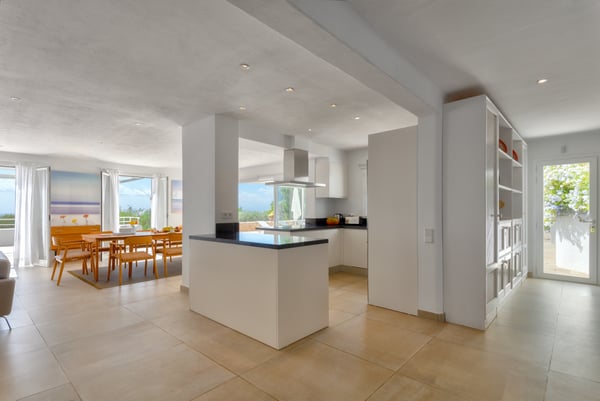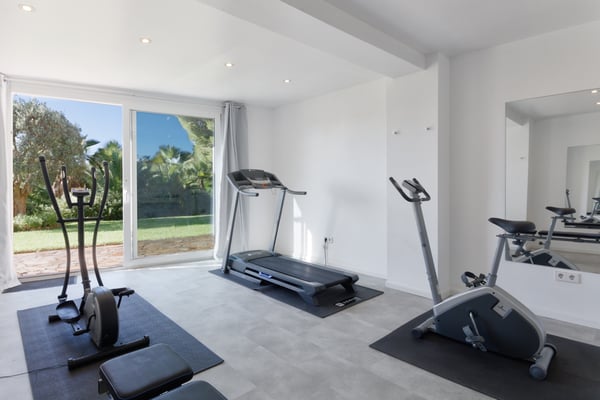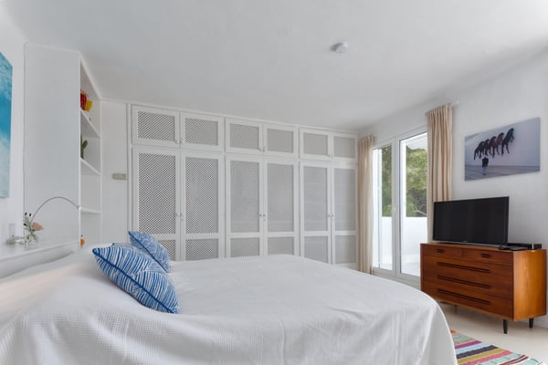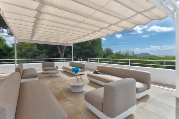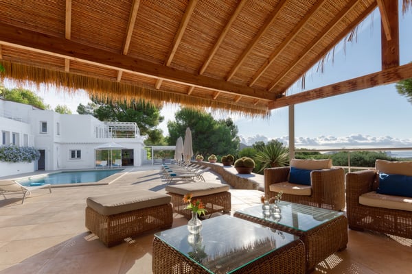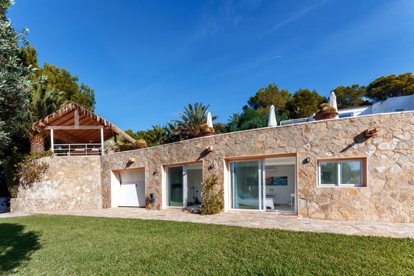 This stunning property is ideally situated near the sea, tucked behind the famous Cala Jondal beach, celebrated for its natural beauty and iconic venues like Blue Marlin and Tropicana. Conveniently, it is just a 10-minute drive from the airport and 15 minutes from Ibiza Town. Casa Puig Redo features expansive front terraces that offer breathtaking sea views. These terraces are outfitted with a luxurious outdoor lounge area, accommodating up to 20 guests—perfect for social gatherings and enjoying drinks in style. At the heart of the main terrace lies the swimming pool (10m x 5m), equipped with a child-safe security alarm. Adjacent to it, the outdoor kitchen and dining area boast a professional-grade gas plancha grill and a spacious teak dining table. This setup allows guests to savour delicious meals while taking in panoramic sea views or enjoying the serene glow of the illuminated pool and terraces after dark. A short distance away, a pergola shelters a large Balinese bed, providing a tranquil spot to unwind in the shade and admire the surrounding vistas. The beautifully landscaped garden features spacious terraces and a variety of trees, including olive, orange, mandarin, lemon, and vibrant mimosa. A charming pathway winds through the property, inviting leisurely strolls, while automatic lighting enhances the ambiance at night. Access to the estate is provided by two large automatic gates on either side of the property, and the parking area can accommodate up to six vehicles. The villa itself is filled with natural light and showcases stunning sea views throughout. Recently renovated by a renowned French decorator, the property exudes sophistication and charm. Its unique style incorporates 1950s vintage furniture sourced from premier French antique markets, plush Roche Bobois leather sofas, and high-quality Scandinavian furnishings. Ocean-themed artwork adorns the walls, adding a breezy, summery touch. On the ground floor, the villa boasts an open-plan design, seamlessly integrating a spacious lounge, dining room, and a fully equipped kitchen with expansive bay windows that frame the terraces and the sparkling sea. Additional amenities include a fully equipped gym with state-of-the-art equipment, WiFi, air conditioning, and a Sonos music system, ensuring comfort and entertainment throughout your stay. License Number: ETV-2333-E / ESFCTU000007010000651723000000000000000000ETV-2333-E9