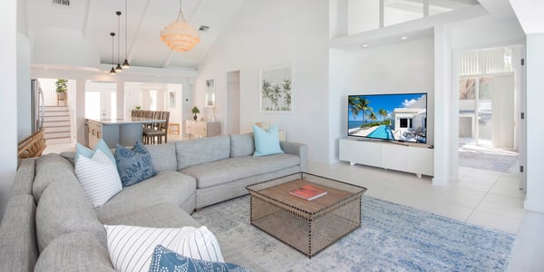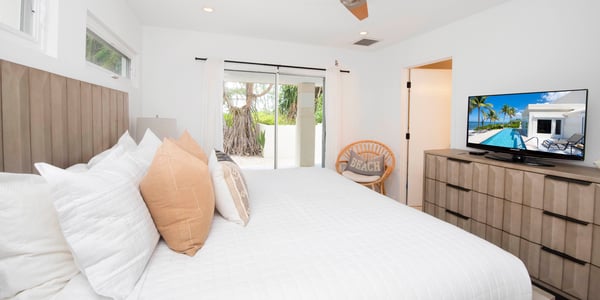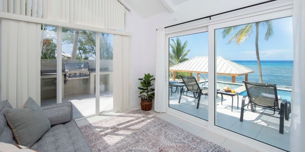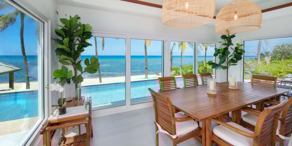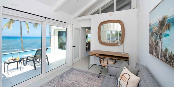 Envision is the new name for this recently renovated beach house on Cayman's North Side with backyard snorkeling, a sandy beachfront, plus a private pool with spa. Complimentary spa heat is provided from Thanksgiving to Easter. The home sits on an oceanfront lot with a vacant lot to the east and the North Side cemetery to the west. The cemetery is visible from the driveway. Tall foliage and a large buffer area block its view from other parts of the home. Reasonably priced for larger families, Envision is a two-level home featuring an open floor plan with a large family room on the lower level. Furnished with a comfortable sectional sofa and large television, guests will find plenty of space to spread out, relax, and enjoy the sweeping ocean views. Exposed beams and vaulted ceilings accentuate the views, filling the home with natural light. A small den sits off the family room furnished with a desk and sleeper sofa. It's a nice spot to curl up with a book for some quiet time or a daytime nap. Work-from-home professionals can retreat to the den to connect remotely with the office while vacationing in style. The new saltwater pool with spa overlooks a large sandy beachfront, leading to excellent snorkeling just steps from the back door. The beach offers plenty of sunning space with no immediate neighbors to the west and North Side's cemetery beach to the east. The beach is lined with palm trees and equipped with a beach cabana for shade plus seaside hammocks. A large oceanfront sun porch on the edge of the pool deck is the perfect place to dine or relax after a day of sun and surf. The dining table is usually set up with seating for 6-8 guests. The home's five bedrooms are spread across the upper and lower levels. The primary suite plus two bedrooms sit on the lower level with the remaining 2 bedrooms upstairs. The upper-level bedrooms are ideal for kids and teens due to their low ceilings. Beach Notes The entire island is only 22 miles wide from west to east, so you are never too far from anywhere on Grand Cayman. The beach at Envision offers great reef-protected snorkeling while also having a sandy beachfront adjacent to the North Side Cemetery Beach. The beaches on the North Side usually have plenty of white sand, but can also have some spots of rocky ironshore. With the abundant marine life we have in the water, you will want to wear pool shoes or fins for foot protection. The big draw to this area is its proximity to the Rum Point Club, a popular beach club open to the public with a barefoot beach, watersport rentals, food + drinks, plus pick-up beach volleyball games. Also nearby is the Kaibo, a beachfront dining destination with a casual bar and grill, a fine dining restaurant, and a breakfast cafe. Lastly, we have two large resorts in the east end, Morritt's and The Reef. Both offer manicured beaches as well as restaurants, beach bars, a modern grocery store, a liquor store, and souvenir shops. General Grand Cayman Beach Notes All beaches in Grand Cayman are technically “public” since the Crown owns up to the high watermark and the shoreline quality behind your property may vary seasonally. Be advised that the beach or water entry behind your property may vary slightly from the images on our website because of the weather. The next-door beach is also always available for your use. Ocean Debris and Sargassum Seaweed Beaches in Grand Cayman may also experience floating ocean debris and sargassum weed seasonally. Sargassum is a generally harmless floating seaweed that has increased in frequency in recent years. Sargassum is a harmless seaweed that has increased in frequency during the summer. The owners do make efforts to remove heavy sargassum and will have the beach raked before your arrival. We try our best to work around mother nature.