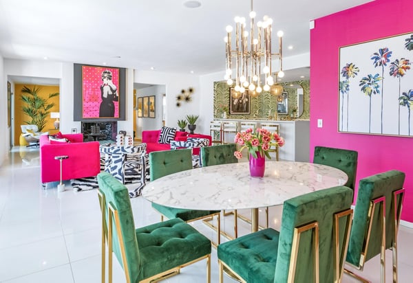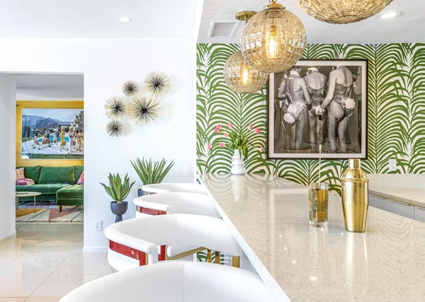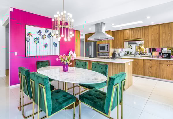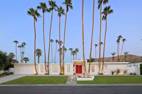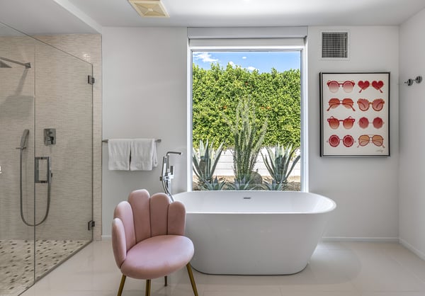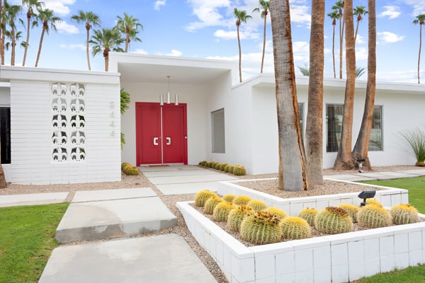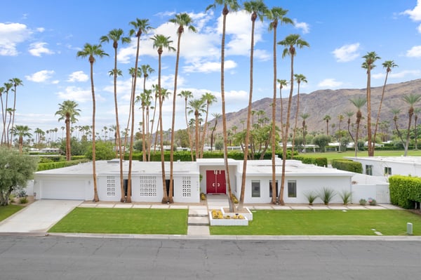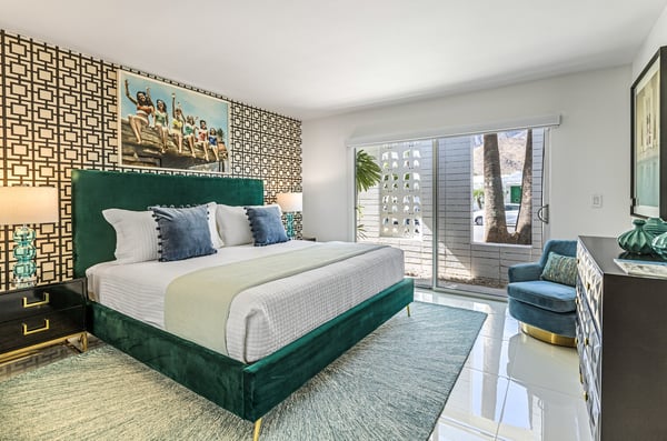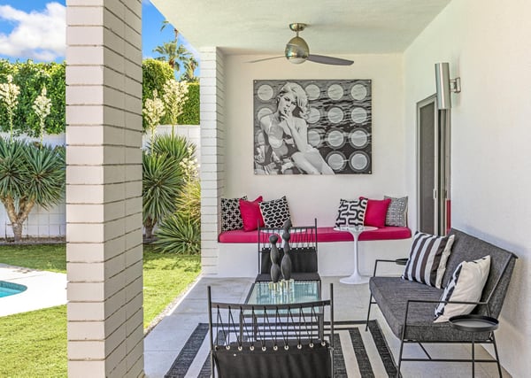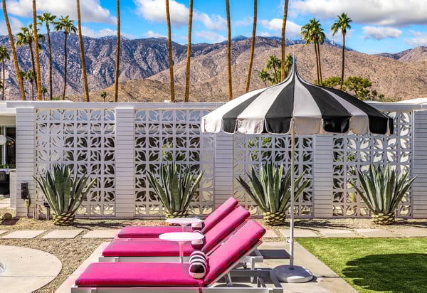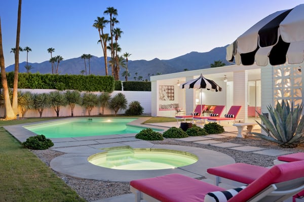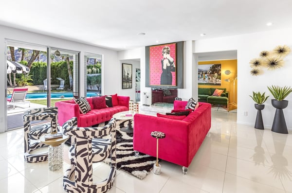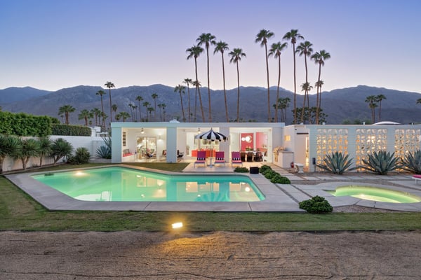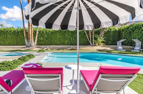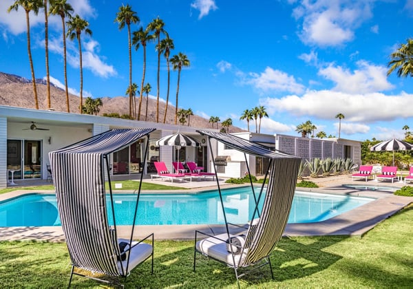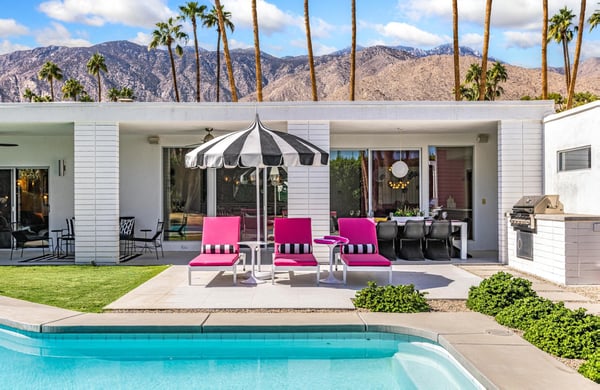Nestled in the Indian Canyons of South Palm Springs, Pink Paloma stands as an exquisite 5-bedroom, 4-bathroom home that sleeps 10, exuding a rich history and chic desert elegance. Constructed in the 1960s as part of the original development, the Main House and accompanying Casita have undergone meticulous maintenance and updates over the years to preserve the original character. Pink Paloma’s charm is unmistakable, with blooming shades of fuchsia found throughout this magnificent property. Immediately upon entering, guests are whisked away to an enchanting era of simplicity and joy, enveloped in the timeless elegance of mid-century modern furnishings and signature pink accents. The open floor design graciously welcomes streams of natural light into the great room through the nearly floor-to-ceiling windows, casting a luminous glow upon the modern art adorning the walls. The primary living area, ideal for entertaining, consolidates all the essentials in one location, including an exquisite green-gold bar room with a quartet of stools. A grand sitting area with 2 contemporary pink couches and a fireplace complements the refined living room graced with a green sectional sofa and lemon-yellow accents. The kitchen is a culinary haven with elegant wood cabinetry, sleek countertops, and premium Viking appliances. Host an intimate dinner party around the stylish 6-person dining table, or venture outside to dine alfresco with the built-in gas grill and firepit for roasting marshmallows. Four spacious king bedrooms round out the inside of this home, detailed with a mix of gorgeous interiors, private bathrooms, outside patio access, and more. Through sliding glass doors, luxury meets leisure in the ultimate Palm Springs outdoor oasis, adorned in pink with sophisticated black and white accents— featuring a sprawling backyard with a private pool, sitting spa, and covered patio with incredible desert-mountain views. The vintage Barbie-styled Casita offers the ideal private retreat, with a cozy living area, private bathroom, and a kitchenette. The ceiling fan ensures comfort, while the patio door provides easy access to the great outdoors. Less than a 10-minute drive from downtown, Pink Paloma offers easy access to award-winning restaurants, bars, art galleries, and more. An attached garage space is not for vehicles, but instead has been transformed into a vibrant, air-conditioned gym equipped with a Peloton bike and tread—no excuses at Pink Paloma. Entertain guests with the fabulous backyard and its luxurious amenities. Book today! Permit #5246