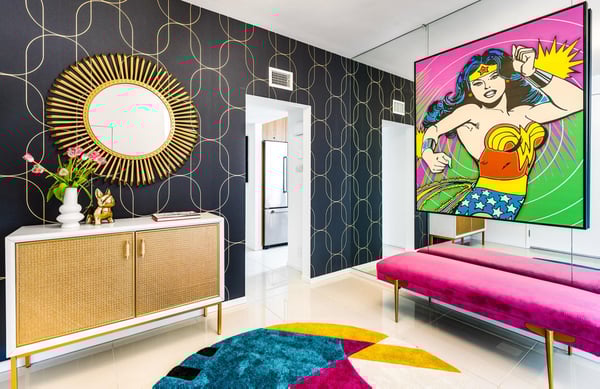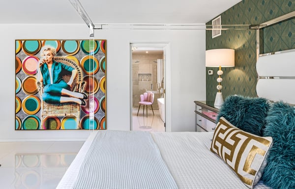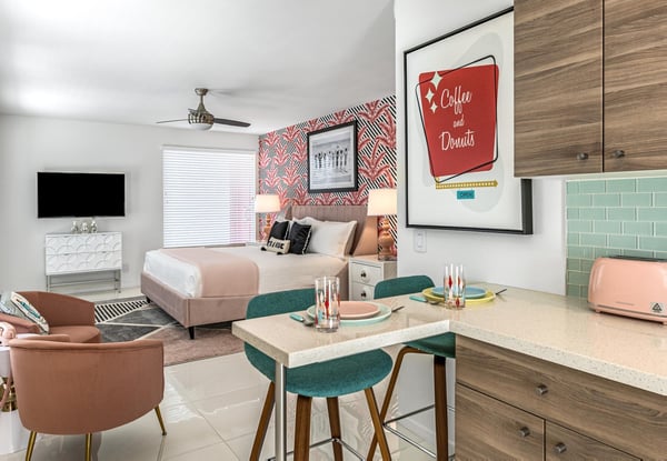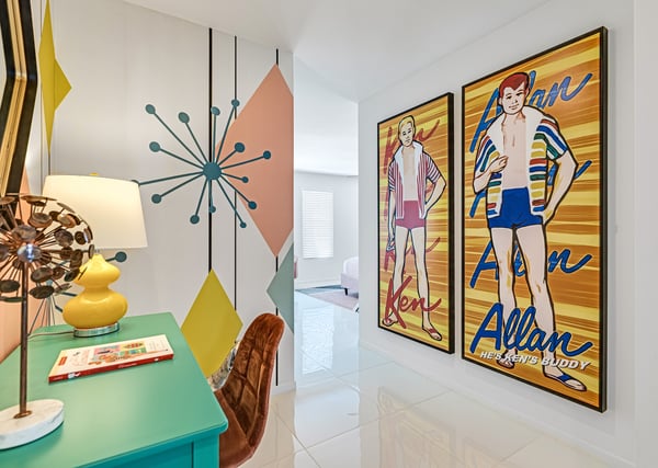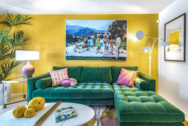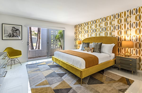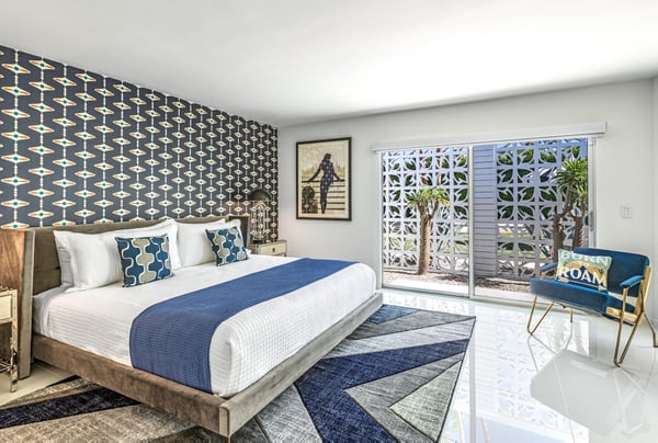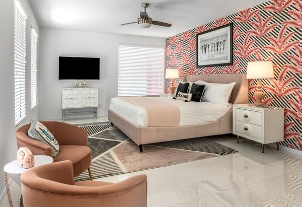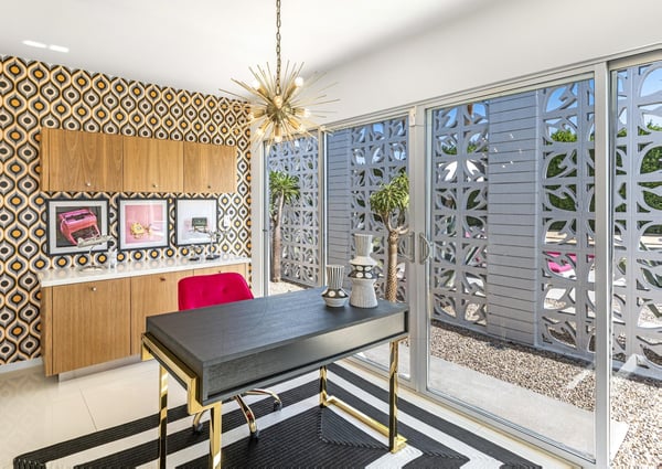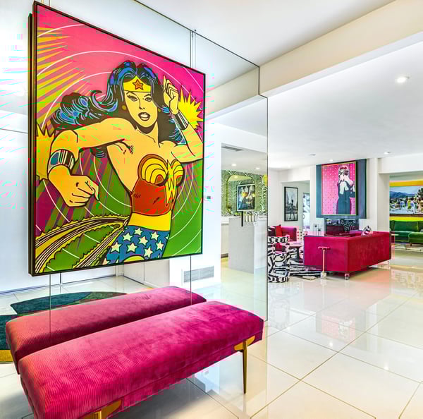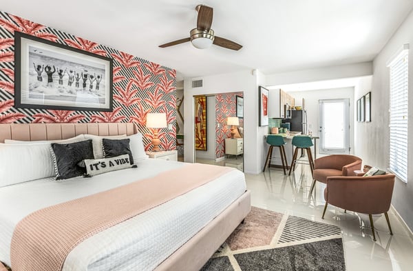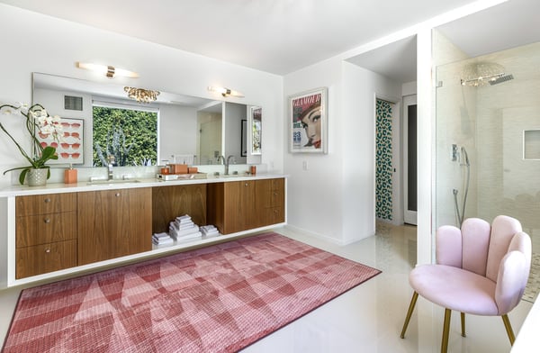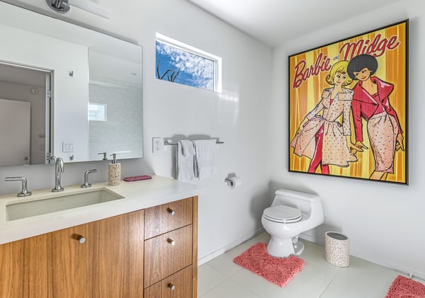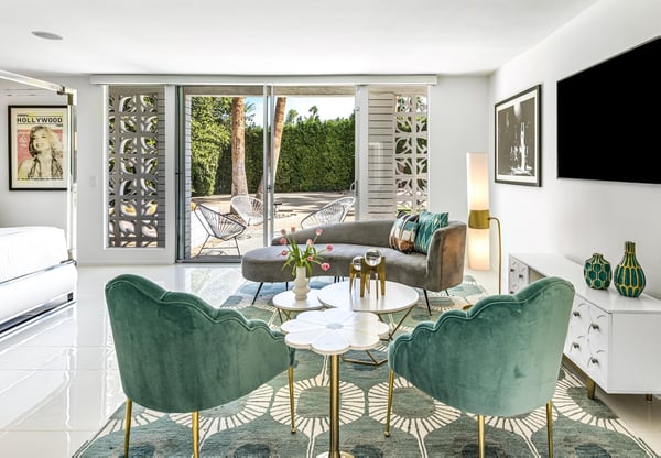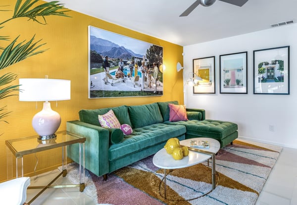 Nestled in the Indian Canyons of South Palm Springs, Pink Paloma stands as an exquisite 5-bedroom, 4-bathroom home that sleeps 10, exuding a rich history and chic desert elegance. Constructed in the 1960s as part of the original development, the Main House and accompanying Casita have undergone meticulous maintenance and updates over the years to preserve the original character. Pink Paloma’s charm is unmistakable, with blooming shades of fuchsia found throughout this magnificent property. Immediately upon entering, guests are whisked away to an enchanting era of simplicity and joy, enveloped in the timeless elegance of mid-century modern furnishings and signature pink accents. The open floor design graciously welcomes streams of natural light into the great room through the nearly floor-to-ceiling windows, casting a luminous glow upon the modern art adorning the walls. The primary living area, ideal for entertaining, consolidates all the essentials in one location, including an exquisite green-gold bar room with a quartet of stools. A grand sitting area with 2 contemporary pink couches and a fireplace complements the refined living room graced with a green sectional sofa and lemon-yellow accents. The kitchen is a culinary haven with elegant wood cabinetry, sleek countertops, and premium Viking appliances. Host an intimate dinner party around the stylish 6-person dining table, or venture outside to dine alfresco with the built-in gas grill and firepit for roasting marshmallows. Four spacious king bedrooms round out the inside of this home, detailed with a mix of gorgeous interiors, private bathrooms, outside patio access, and more. Through sliding glass doors, luxury meets leisure in the ultimate Palm Springs outdoor oasis, adorned in pink with sophisticated black and white accents— featuring a sprawling backyard with a private pool, sitting spa, and covered patio with incredible desert-mountain views. The vintage Barbie-styled Casita offers the ideal private retreat, with a cozy living area, private bathroom, and a kitchenette. The ceiling fan ensures comfort, while the patio door provides easy access to the great outdoors. Less than a 10-minute drive from downtown, Pink Paloma offers easy access to award-winning restaurants, bars, art galleries, and more. An attached garage space is not for vehicles, but instead has been transformed into a vibrant, air-conditioned gym equipped with a Peloton bike and tread—no excuses at Pink Paloma. Entertain guests with the fabulous backyard and its luxurious amenities. Book today! Permit #5246