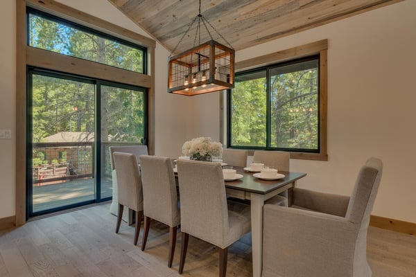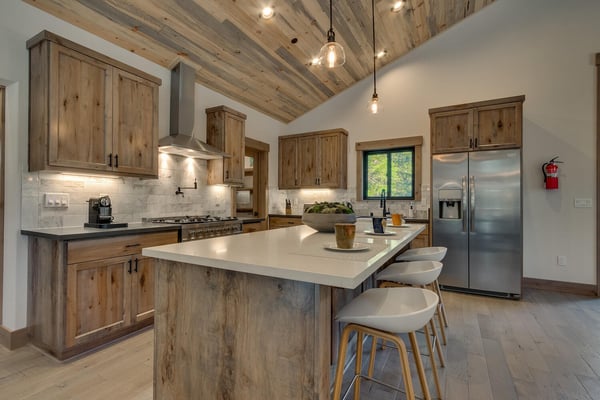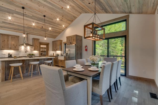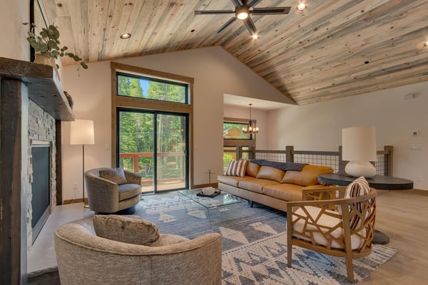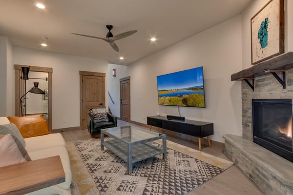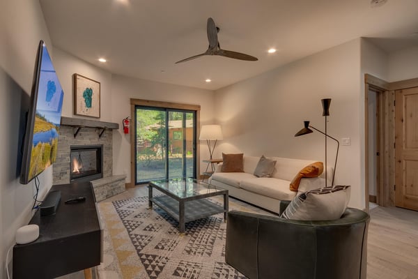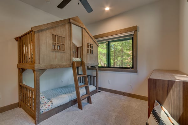 Once inside the home, you'll find the living area with a comfy sofa and a stone-clad gas fireplace perfect for quality time and family activities. A newly installed flat-panel television can be found mounted to the left. Adjacent to the living area is the kitchen and dining area with stylish wooden cabinets, stainless steel appliances, and a large kitchen island which the chef of the family will surely enjoy. Step outside the sliding doors and enjoy the cool breeze and when you’re ready to call it a night, you’ll have four bedrooms to choose from. Two of which are located on the second level including a primary suite with a king-size bed, a bathroom with a dual sink, a soaker tub, a glass-enclosed shower, and a walk-in closet. Two more bedrooms can be found on the lower level of the house and one has a fun bunk bed for the little ones. A roomy family room is also at this level with a flat-screen TV and fireplace.