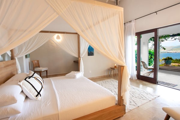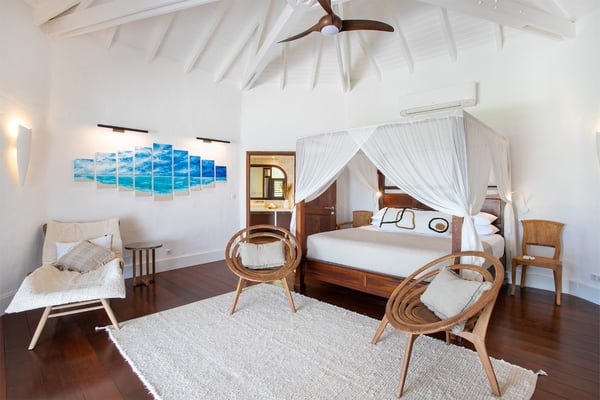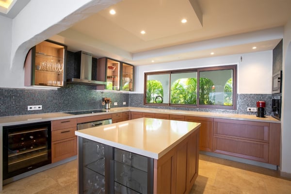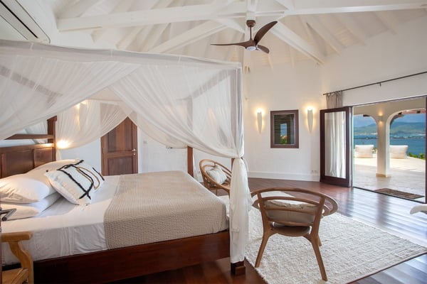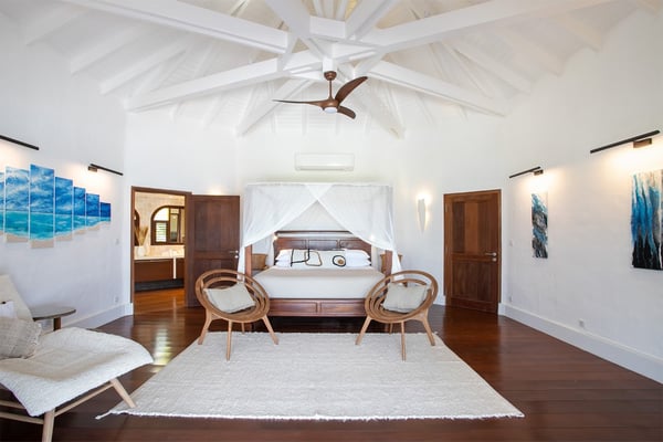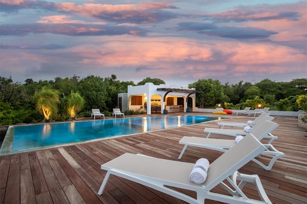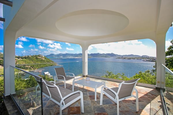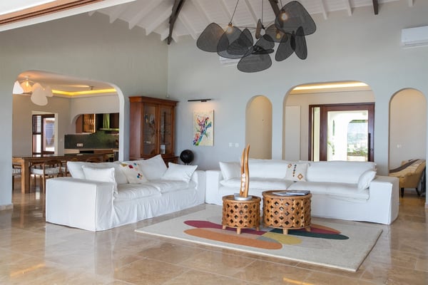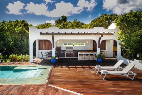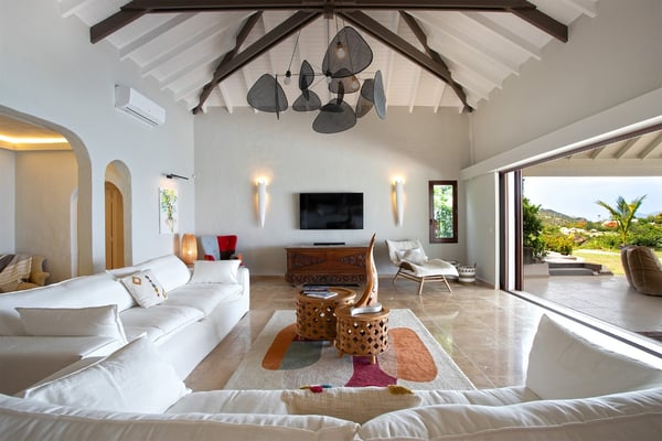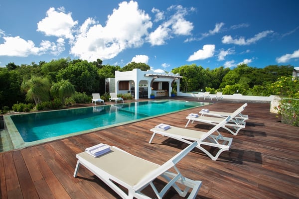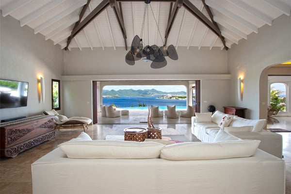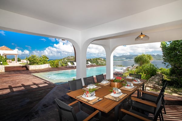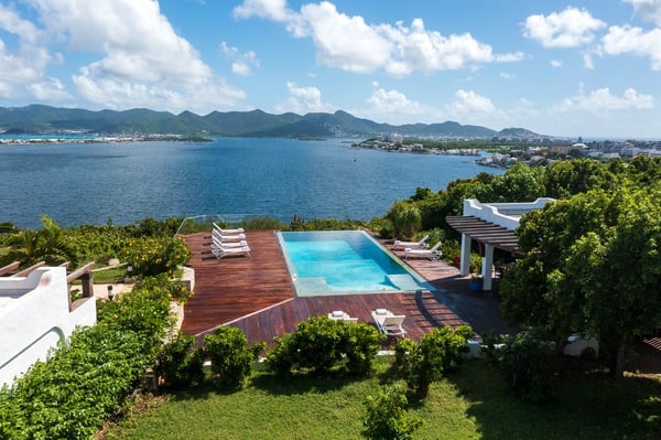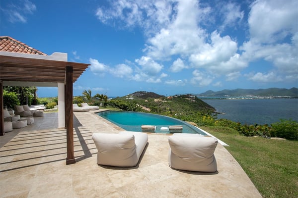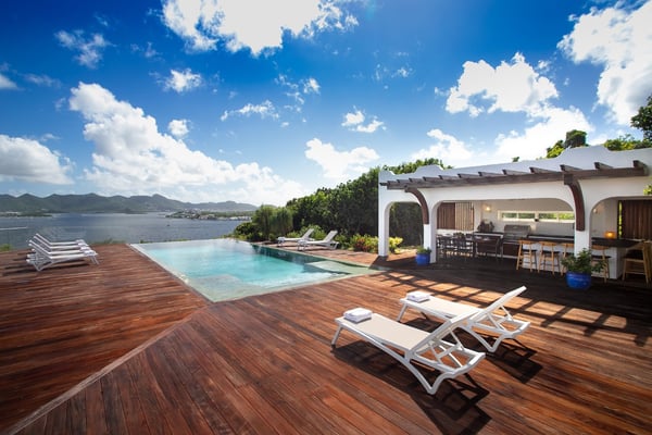 La Vue Folle, meaning “a crazy sight,” is an eye-catching villa that lives up to the name. The main entrance leads out onto the terrace, where guests face impeccable views of Simpson Bay Lagoon, unlike anything before. The backdrop of the water against the mountainous scenery captures a unique picture, no client has ever laid eyes on. This home features two pools, indoor and outdoor kitchens, and three luxurious bedrooms; nothing can quite match this home. The original Moroccan style of this property encourages an array of impressive amenities and decor that maintains the traditional bones of the house but with a modern twist. The interior is equally remarkable as the exterior, with a meandering floor plan that leads guests into their individual oasis with a deluxe common area in the center. This home is truly magnificent, and clients wishing to stay in this villa are in for a real treat. The exterior takes advantage of its prime positioning by highlighting Simpson Bay with an oval infinity heated pool acting as the stage for the view and a rectangular pool next to it; why have one pool when there could be two? A separate set of stepping stones, leading from the driveway, extends to an outdoor kitchen that is situated next to the rectangular pool. This creates the perfect place for hosting an event, while being separate from the main villa. The kitchen includes a barbeque, a breakfast bar, and a dining table beneath a dome structure acting as a culinary cocoon from the sun. Adjacent to this structure is a hidden alcove for reading a book or sparking a conversation among friends. A concealed flight of steps, between the pools, leads visitors to a viewing area in which they can observe the sunset while sipping champagne. The additional outdoor dining table is located closer to the home, suited for cooking a casual meal or perhaps hiring a private chef to further embrace the scenery. The interior structure of the home is just as enchanting by attracting guests with the high ceilings and the seamless flow from room to room. As clients enter, there is a glass door entrance that leads to the substantial living space. This room includes comfortable sofas and a large TV, along with speakers, ideal for listening to music while remaining out of the sun for an air-conditioned experience. The kitchen is set to the right of the living room through an arched entryway. The L-shaped kitchen is accompanied by a central island, an induction stove, glass cupboards, and even a pantry for storing food. Directly in front of the kitchen is a beautiful wooden dining table with a carved mandala shape in the center, lit up by a contemporary lighting fixture for savoring a wonderful dinner. The three bedrooms stem from the heart of the home, with one room having an exterior entrance and the other two attached to the property itself. The rooms feature king-size beds, spectacular en-suites, and an individual outdoor terrace with spacious closets to store clothes in. The primary bedroom has interior and exterior access with a vast ensuite bathroom that includes a jacuzzi with a view, double sinks with harmonious mismatched tiles, and an indoor and outdoor shower for the preferred bathing method. All the bedrooms include comfortable seating to unwind in the cozy atmosphere. The second bedroom is attached to the left of the living space and includes the main king-size bed with a niche set of bunkbeds for accommodating children in the home; for further details on this, contact our Villa Specialists, as this three-bedroom home could be adapted for additional clients. This bedroom also includes a private outdoor oasis with an arch of leaves around it. Lastly, the third bedroom is accessed through its exterior entrance near the front. By walking in, clients are faced with a mini set of stairs to the right, acting as an additional corner for children. Continuing further will reveal a low-laying bed with spectacular tall ceilings and an additional indoor and outdoor shower to fulfill the natural sense of this villa. La Vue Folle lives up to its name, offering unparalleled views of Simpson Bay Lagoon, a luxurious interior, and captivating outdoor spaces. With its Mediterranean influence, well-equipped kitchen, and lavish bedrooms, this villa strikes a perfect balance between luxury and comfort, providing an extraordinary retreat for those seeking an unforgettable experience.
