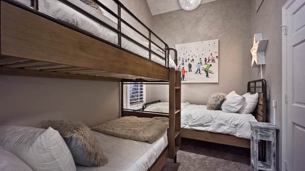 Ski Butlers offers you the best rental experience in the industry. No more lines. Ski Butlers is a full-service ski and snowboard company that delivers the equipment to you. Contact a villa specialist for more information. Time Flys Lodge is a stunning home in a prime location close to the slopes, for the perfect Steamboat vacation. This stunning residence combines contemporary elegance with chic and stylish decor that appeals to all tastes. This modern home offers luxurious comfort and great convenience for your ski vacation. Located a short walk from the Thunderhead ski lift, with views of the mountain and valley all around you through the large windows and from the decks. The cozy great room offers a place to relax in front of the large gas fireplace with stunning stone surround, while you take in a movie on the big screen TV or soak in the views. Barn wood accents and classy furnishings and artistic lighting give this space plenty of wow factor. A corner table with seating for five is great for a game night. An elegant dining area with seating for 10 is the perfect setting for family or group dinners and provides easy access to a beautiful deck with seating, a firepit, and stunning views of the ski mountain and valley beyond. A showstopper gourmet kitchen is fully equipped and surrounds a huge central island, offering an abundance of counter space for 5-star entertaining. Modern and classic white cabinets complement stainless steel appliances that include a 5-burner gas stove, oven, microwave, and dishwasher. The island has seating for six people for a great breakfast option or additional seating for dinner guests. The kitchen has spectacular views through the large windows that face the mountain. A beautiful primary king suite is on the main floor and features extra high ceilings and mountain views from the large windows. The primary ensuite has dual vanities, a 6-head shower, and a large, freestanding soaking bathtub to help you relax after a day in the outdoors. Upstairs, a beautiful office and reading area includes a desk and printer, convenient for remote workers. Also on this upper level is a king room and large bathroom with dual sinks, a shower, and a large soaking bathtub. Through the bathroom is a bedroom that will sleep three with a twin bunk bed and twin bed. On the opposite side of the office area is another bedroom with a king bed and a private ensuite bathroom with a shower. On the lower level lives a fifth bedroom with queen bunk beds and an extra queen, sleeping up to six people. The adjacent open-plan bunk room and family room feature another four built-in queen bunks neatly outfitted with individual lighting and charging stations. The family room is a fun gathering spot with a large 75" TV and couches for ultimate movie nights or sporting events. From here you walk out to your private covered hot tub where you can look up at the mountain and relive your day's adventures. With easy walk-to-ski access or shuttle service to the base area from the door, this home offers ideal convenience for skiers. There is a heated ski room for storing equipment and boot dryers to ensure you start off your day on the right foot. This home enjoys complimentary use of the shuttle, mid-November through mid-April, using the convenient shuttle app to schedule pickups. This home does not have air conditioning. Colorado's cool summer nights will keep this home comfortable by opening windows after the sun goes down, and then closing the windows and blinds during the day. Utilizing the overhead fans, if available, keeps airflow moving, and additional floor fans can be found in many bedroom closets. Can't live without it? A/C units may be available for rent for an additional fee.