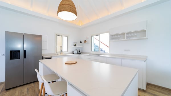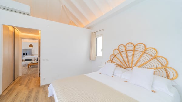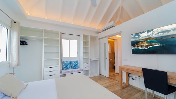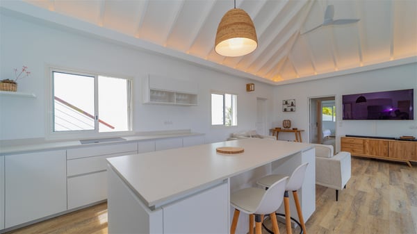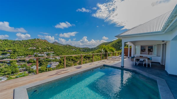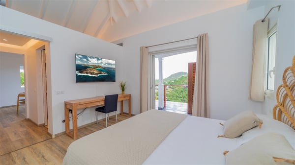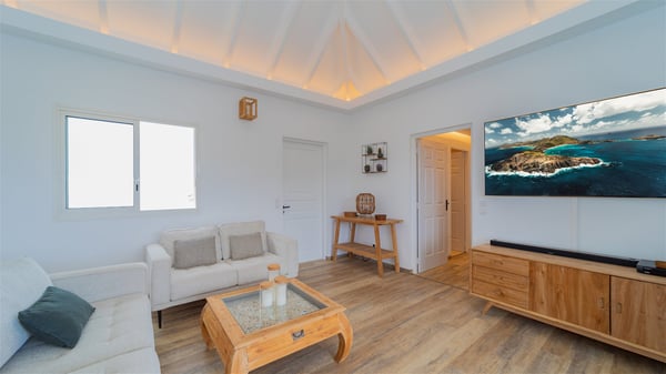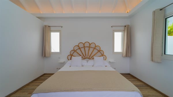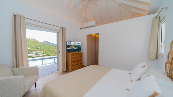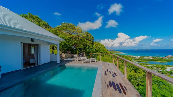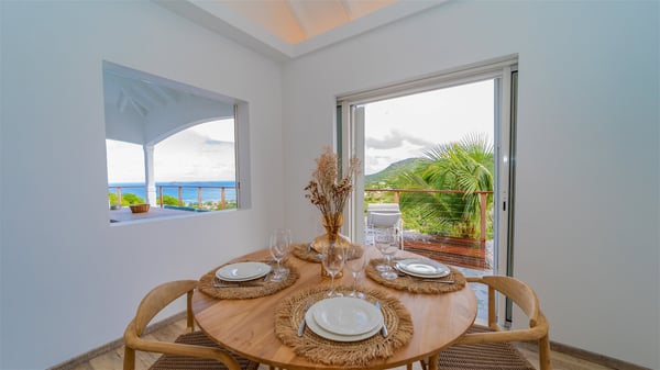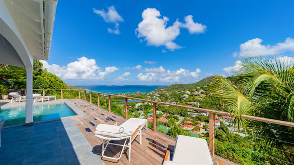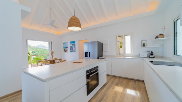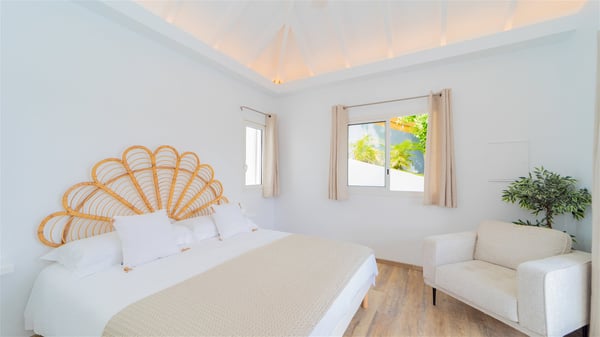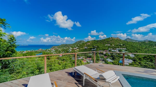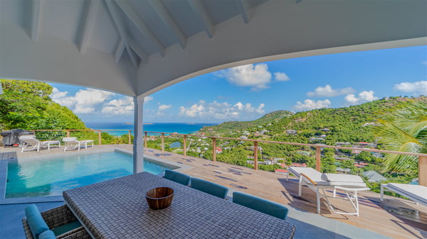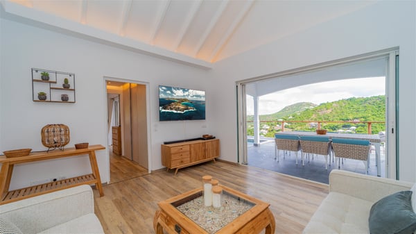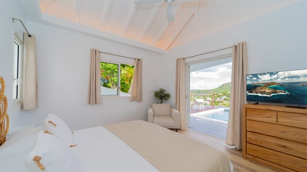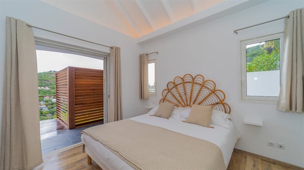 The vacation rental Adal is a charming property located in St-Jean in the Caribbean rolling hills. Overlooking the crystal-clear waters, this two-bedroom vacation home with heated pool offers a bright and modern decor, in the gentle tropical breeze. Surrounded by lush vegetation, villa Adal welcomes guests for an unforgettable stay for four in St-Barths. Built over one single level accessible via a staircase, villa Adal features beautiful indoor and outdoor spaces. In the natural light of St-Barths, you’ll find the comfy lounge area with two fine sofas and an HDTV, illuminated by the wide opening onto the terrace with ocean view. In the soft decor with blonde parquet, the dining room can accommodate four guests around the table, close to the well-equipped kitchen with a striking white central island and stools. The whole is chic and sleek, perfect to relax in utmost calm and luxury. At the front, Adal’s terrace opens onto an amazing panorama of the lush Caribbean vegetation and the ocean with turquoise-blue to deep-blue shades. Under the covered area, you'll find the outdoor dining room, which can accommodate up to six guests for pleasant al fresco dinners in the tropical breeze; a barbecue is also available to cook under the stars at the end of the terrace. On the left-hand side, the lovely heated pool sparkles in the sunlight, next to the deckchairs facing the stunning view in a very private atmosphere. It's the perfect place to sip an evening cocktail and enjoy the breathtaking panorama of St-Barths. The holiday rental Adal consists of two air-conditioned bedrooms with king-size beds, TVs and private bathrooms. Comfortable and well-appointed, they are located on either side of the living room, and both open onto the terrace, where you’ll love breathing in the gentle trade winds at any time. The decor is refined, with white and blonde-wood hints creating a peaceful atmosphere. In the heart of St-Barths hills facing the infinite ocean, the villa rental ADAL is the ideal place for a fantastic stay for four in the Caribbean.