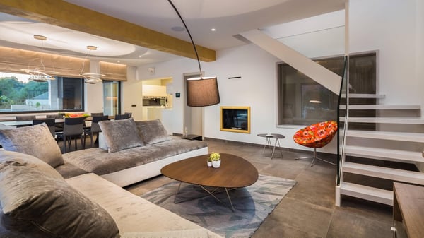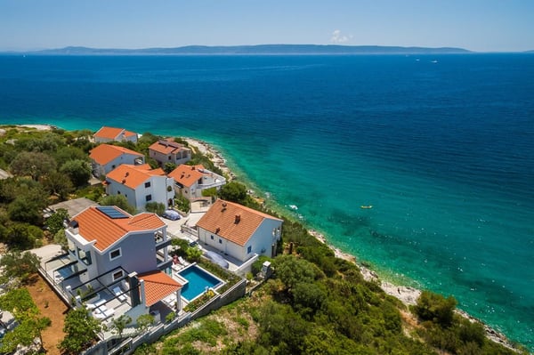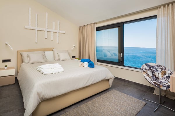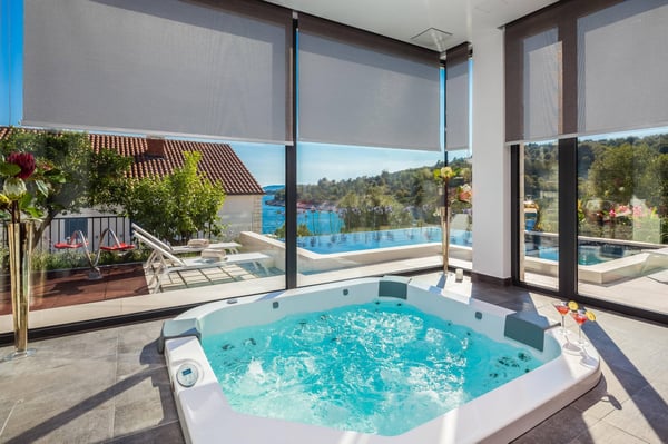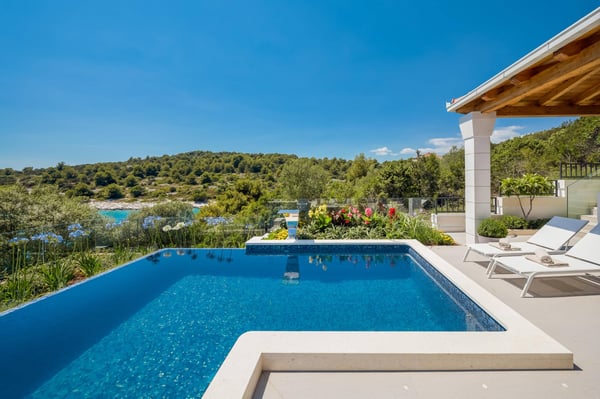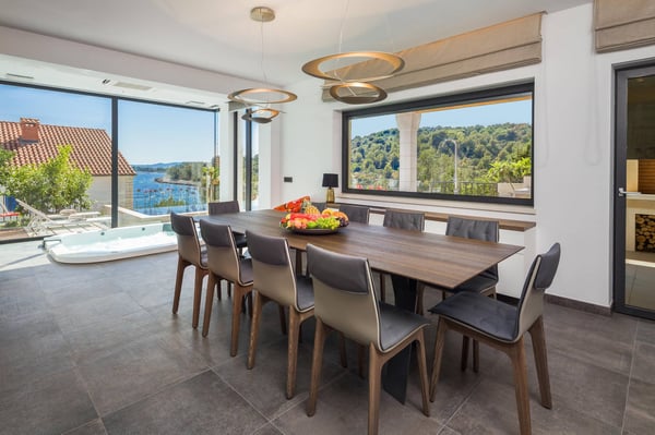 Luxury Villa Sunset is a brand new villa with four bedrooms that combines the elegance and luxury of a five-star property, making your stay an unforgettable experience. Private infinity heated pool with a stunning sea view, Jacuzzi, gym, sauna, garden, private parking, and children's playground make this villa a perfect choice for a holiday in Croatia. Villa Sunset is located in a small, quiet bay on the island of Ciovo, only 3 kilometres from the historical town of Trogir and just 30 metres from the small beach. The unique Mediterranean surroundings provide this private villa with a sense of tradition combined with contemporary elegance and luxury. Villa offers four uniquely designed double bedrooms with en-suite bathrooms to accommodate eight guests. All four bedrooms have a fantastic sea view, and two offer private terraces. Two additional guests can sleep in the living room on a sofa bed. Each bedroom was named after one of the islands visible from the villa's terrace and designed in the island's Mediterranean spirit. The open-plan dining area connects with a fully equipped, modern kitchen, an outdoor patio, and a barbecue area. The bright and elegantly designed living room and sitting area offer lovely views of the peaceful bay and have a Jacuzzi bath in the living room extension. Guests can access the terrace and the heated swimming pool with a large outdoor dining table for ten persons and a shaded pergola from this area. There is an outdoor shower by the pool. The terrace area surrounding the pool and the upper lounge terrace features luxurious and comfortable sunbathing loungers, an LCD TV, and a sound system. Villa Sunset also features a modernly equipped gym and a sauna. Guests have five parking places within the property and a private entrance to the villa.