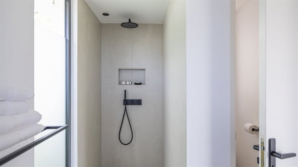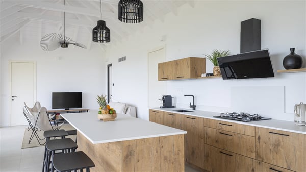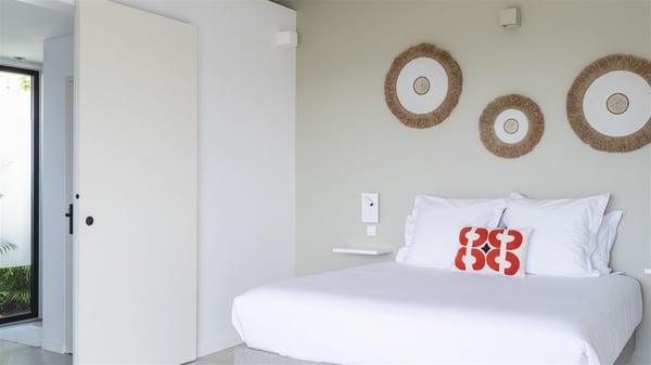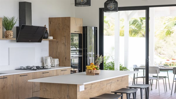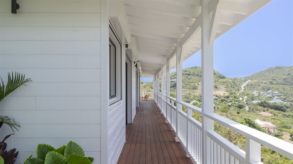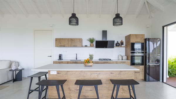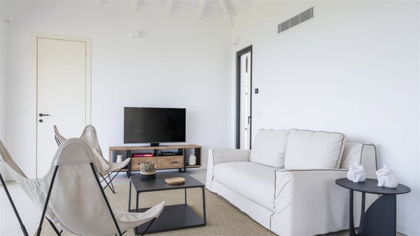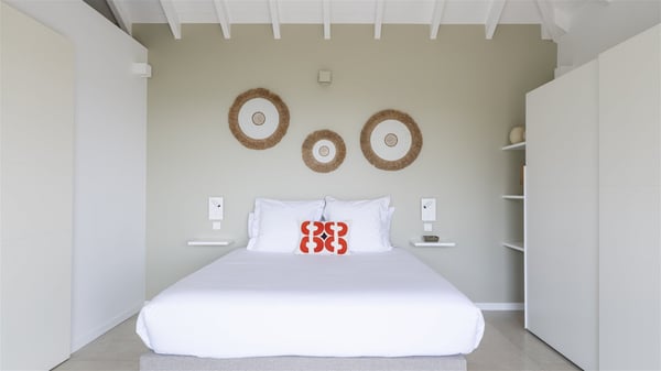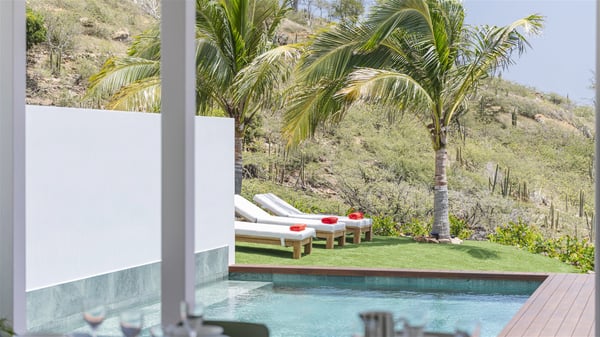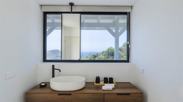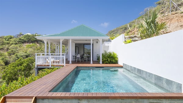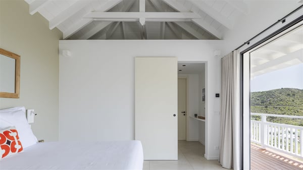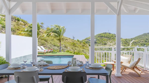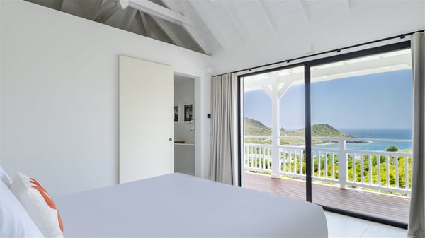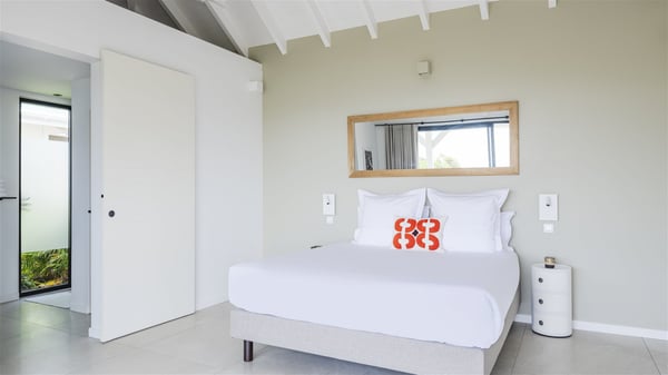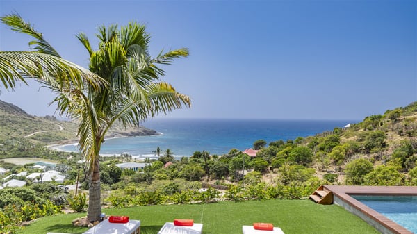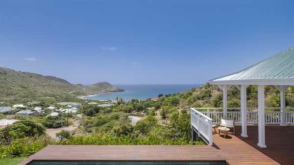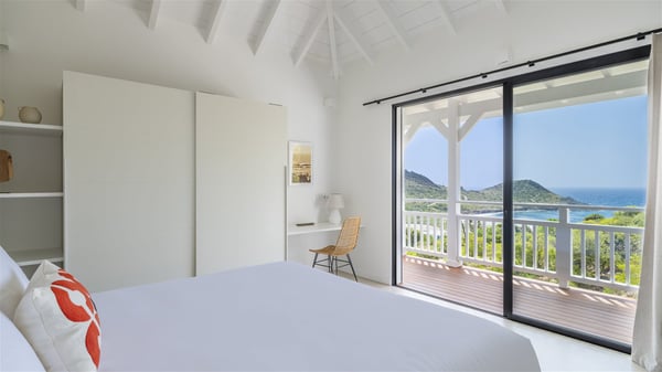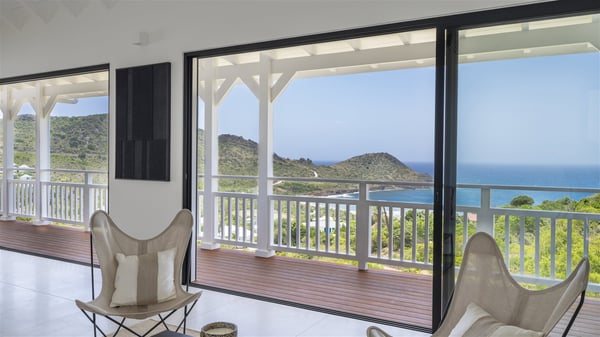 The vacation rental Amalur is a charming property with stunning views over Toiny Bay. Comfortable and very private, this two-bedroom property with a lovely heated pool welcomes its guests into bright spaces amidst the rolling green hills. Featuring high-end amenities and a fantastic terrace facing the sea, Villa Amalur is the perfect place for a memorable stay with family or friends in St. Barths. Designed on one level facing the ocean view, the holiday rental in St-Barths Amalur welcomes the soft glow of the Caribbean. Its spacious living room is furnished with fine areas dedicated to relaxation in utmost comfort. In the lounge area, you’ll find a comfy sofa and two armchairs facing the glass window overlooking the ocean. Nearby, the kitchen is well-equipped and features a bar, a dining area, and stools around a central island. There are large openings leading to the covered balcony running along the facade at the front and to the side terrace with an alfresco dining area and swimming pool. Under the high vaulted ceiling, the ambiance is relaxing and serene, for delightful moments in the quiet Caribbean. Accessible from the living room, Villa Amalur's main terrace features a sparkling heated pool bordered by a green lawn furnished with sun loungers shaded by palm trees. From here, the view over the bay is amazing, amidst the beautiful nature of St. Barths. Under the covered part of the terrace is the outdoor dining area and a small seating area with wooden armchairs covered with cushions and a coffee table. This is the perfect spot to relax and sip a cocktail in the mild Caribbean air. At the front of the living room, a long, covered terrace offers an exceptional view over the hillside and the infinite, deep-blue ocean. Villa Amalur consists of two bedrooms with king-size beds, closets, and private bathrooms. Both open onto the front terrace, offering the gorgeous spectacle of the ocean and its reflections. The touches of woven fibre items bring a pleasant, sweet feeling of authenticity, in a cozy and very private atmosphere. Ideally located in Toiny facing the bay, the vacation rental Amalur is the privileged place for an unforgettable getaway for four in St-Barths.