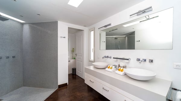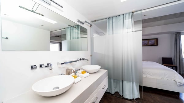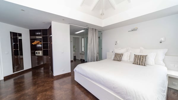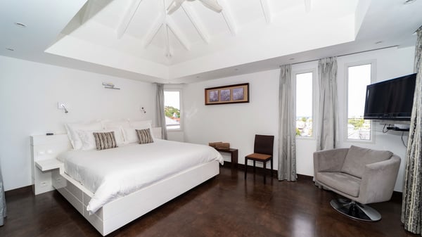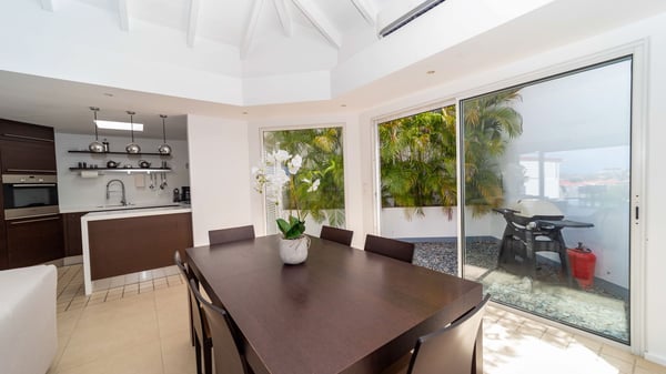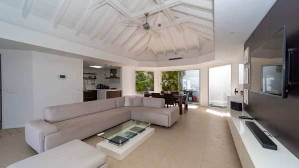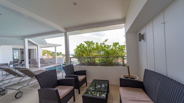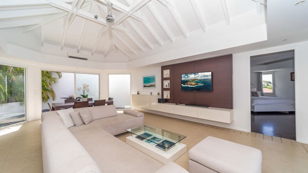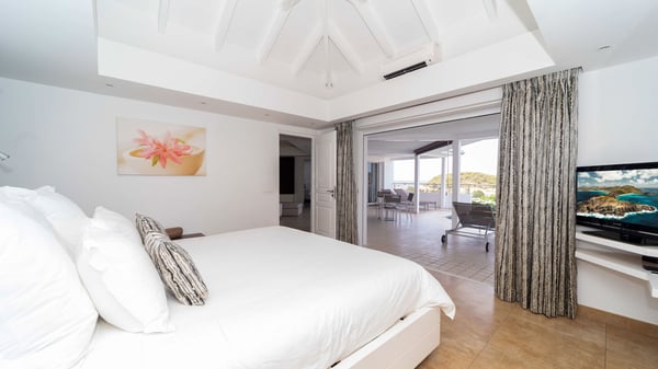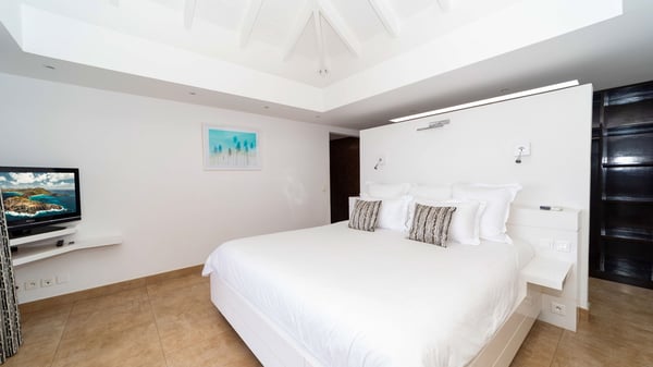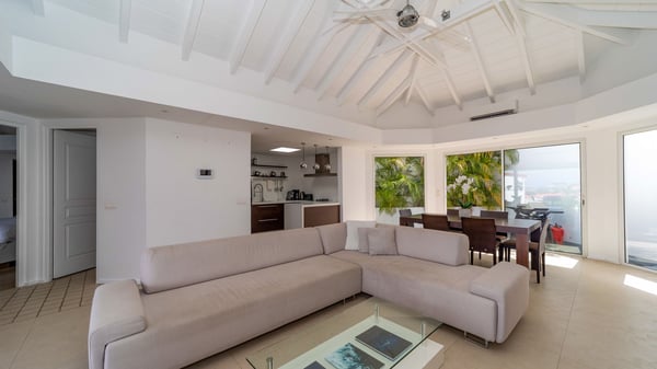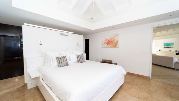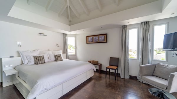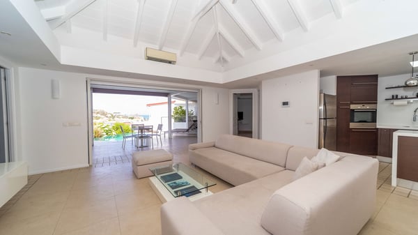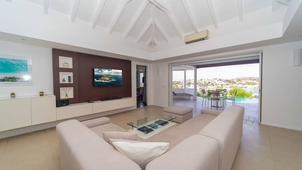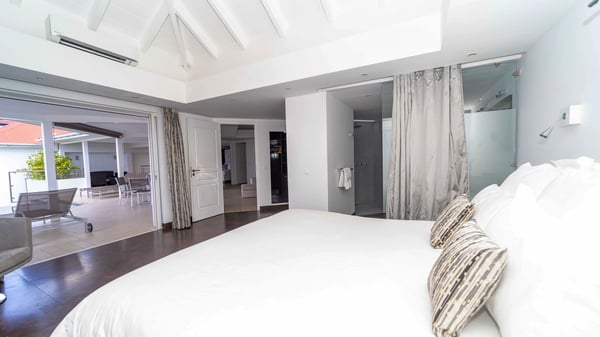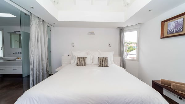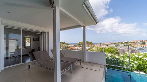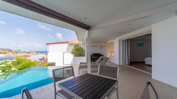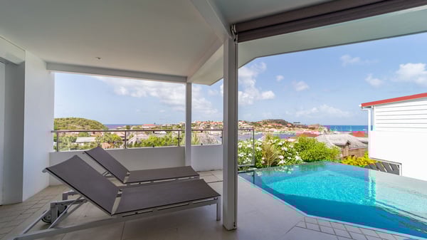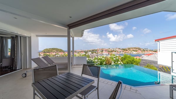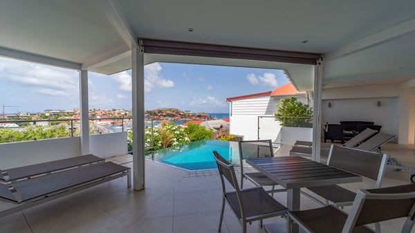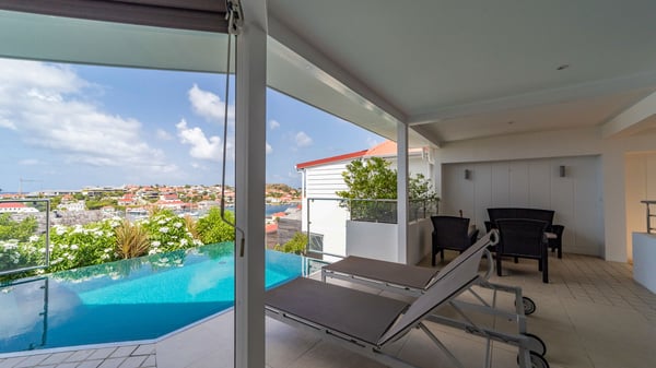 Located in the center of Gustavia, the luxurious villa Wastra combines a refined decoration with luxurious facilities. Only a few minutes from the beach, restaurants and stores, this two-bedroom vacation home is ideal for a family or two couples vacationing together in the Caribbean. The name of the villa means "Full West" in Swedish; actually, the amazing vacation home Wastra overlooks Gustavia's harbour and offers every evening an incandescent view over the sunsets. Very contemporary, this vacation rental features a spacious living room furnished with a beautiful gray sofa covered with cushions under a high vaulted ceiling. A lovely dining room for up to six guests is located at the back and opens onto a shaded patio with a barbecue for delicious grills. The kitchen is very modern and well equipped in white, gray and stainless steel in a refined style. From the air-conditioned living room, the view of Gustavia's rooftops and the ocean is breathtaking. At the front, a lovely terrace offers a panoramic view over Gustavia's lively harbour and yachts coming and going. You will enjoy diving into the beautiful infinity swimming pool and relaxing on the deck chairs. Under the covered part of the deck, there is an outdoor dining area for four guests, ideal for alfresco dinners. In the evening, you'll marvel at the beauty of the sunset over the horizon. Shrubs and banana trees bring a fresh green touch to this enchanting and relaxing setting, in the gentle breeze of the trade winds that blow over St. Barts. The vacation villa Wastra is composed of two air-conditioned bedrooms with private bathrooms located on either side of the living room. In a mineral decor, the bedrooms are furnished with king-size beds and open onto the terrace with a pool. Cushions and silky fabrics make them a truly luxurious space where you will love to rest every evening after days exploring the island or relaxing by the pool. Ideally located in Gustavia and very private, the vacation home Wastra is the perfect place for a most pleasant stay with family or friends in the Caribbean.