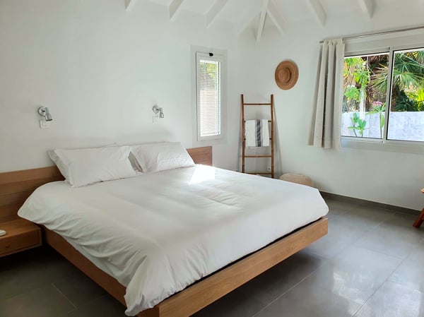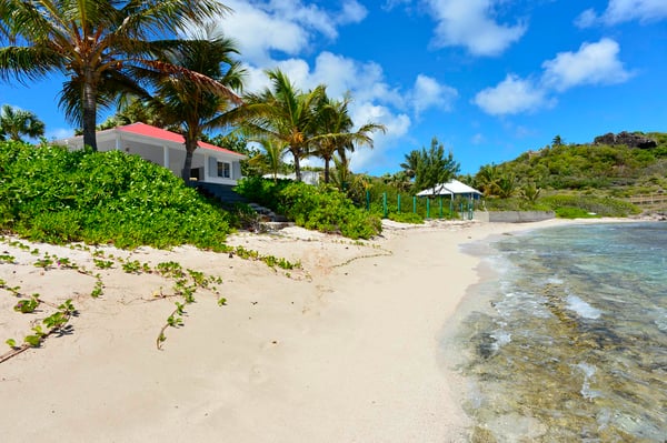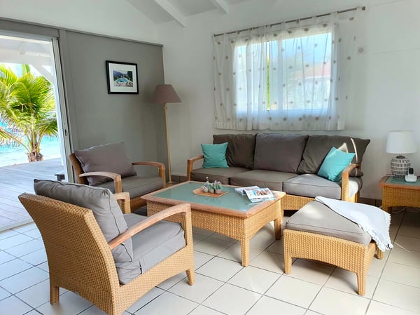 Villa Les Sables indulges its guests with the best of all worlds: a terrace just steps from the sea, green lawns and swaying palms, a refreshing pool, and classic Caribbean comfort. This property's charm and convenient Lorient location make it ideal for both couples and families. Villa Les Sables is composed of separate bungalows set back from the road, each bungalow with its own kitchenette in addition to the main kitchen. The bedrooms are similar in size and accommodation. The living room is in a separate bungalow and opens toward the beach on one side and to the deck and pool on the other.