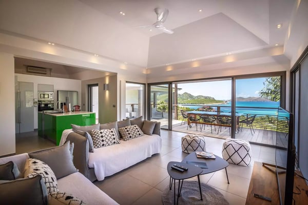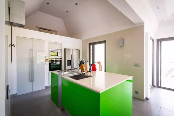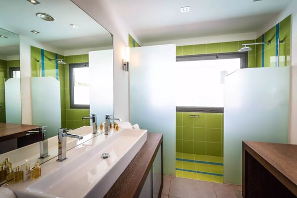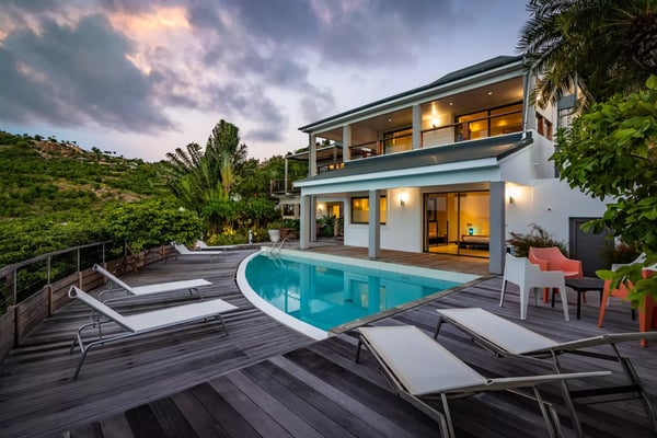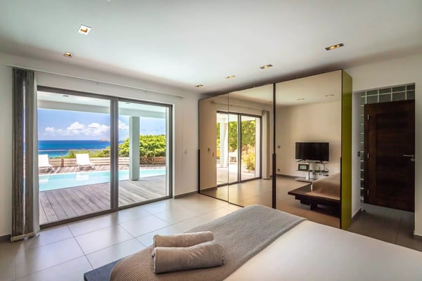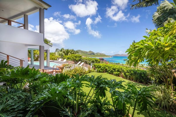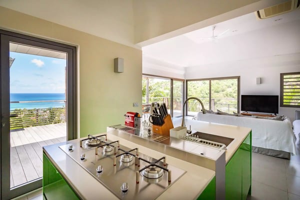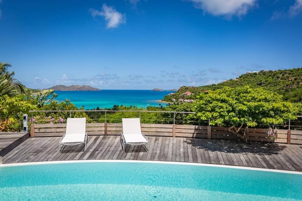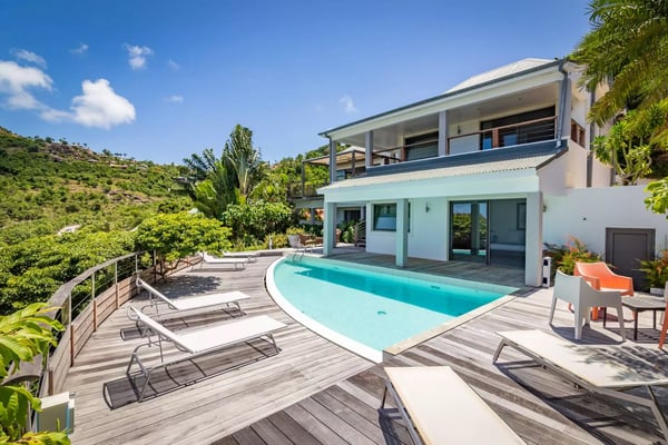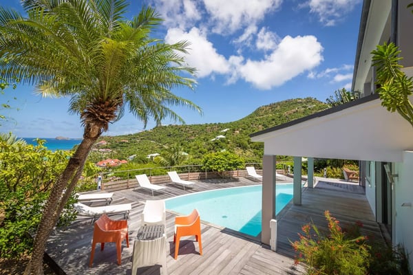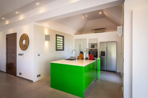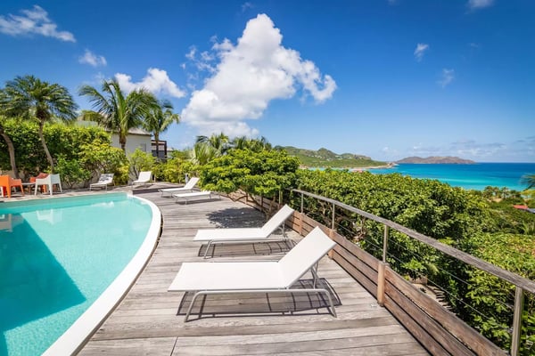 Taking its name from the alter ego of the Greek god Apollo, who was said to be the sun god personified, Villa Phébus is a joyful, exuberant celebration of light, warmth and eclectic design. It’s an unorthodox, inviting place to let your hair down, kick your shoes off, and succumb to the sunshine of the Caribbean. Villa Phébus’ flexible layout makes the rental property appealing for couples, groups of friends travelling together, or extended families on vacation. Here, in this tranquil retreat, you work far less hard than the Phébus of mythology ever did and succumb to the sea views and ocean breezes coming in over St. Jean. Even though it’s an audacious experiment in design with a lime green kitchen island, Villa Phébus is an imminently livable and relaxing home. The views over St. Jean Bay are tremendous, and the design makes the most of those vistas. The villa unfolds across two levels, with everything facing the sea. The upper level comprises a living area as well as a gourmet kitchen. The primary bedroom is on the lower level, by the heated swimming pool and terrace, along with two more bedrooms. One of these has two single beds, making it a fun nest for children. The other bedrooms are dressed in shades of gray and have sleek, minimalist furnishings and large, mirrored closets. Upstairs is a fourth, more private bedroom with access to the terrace that has views in two directions. Like the primary bedroom, it has a spacious bathroom and a two-headed shower. If you choose to venture out, Nikki Beach, St. Jean Beach, and the shopping area are nearby. Or stay in and soak up that sunshine and those views. The main terrace has ample areas for sitting, dining and barbecuing, along with plenty of chaises downstairs by the pool.
