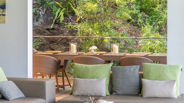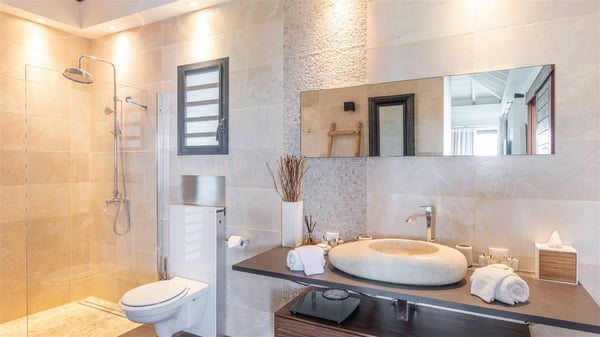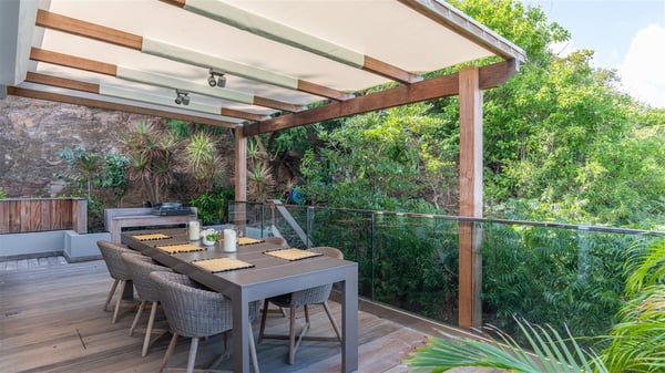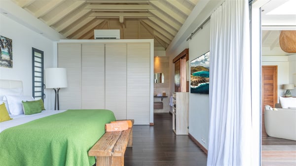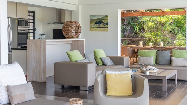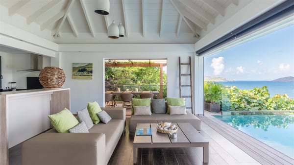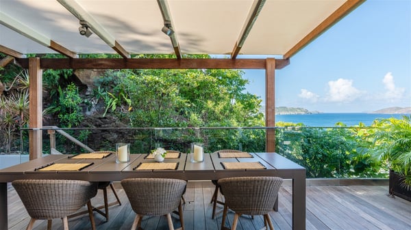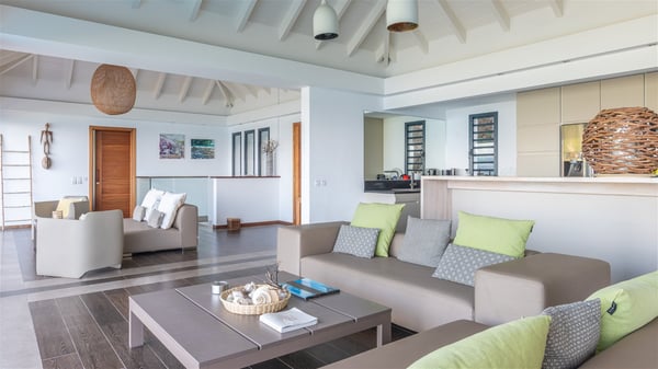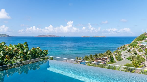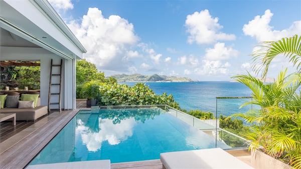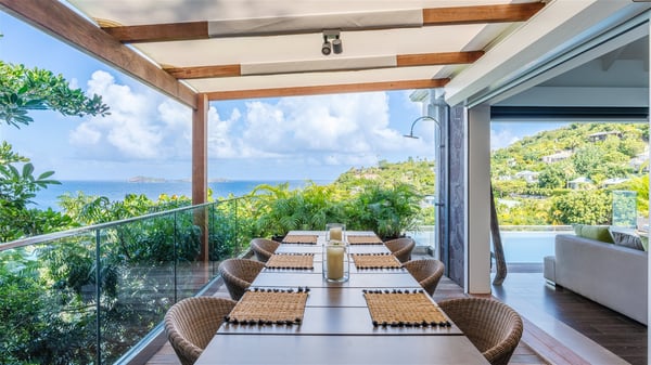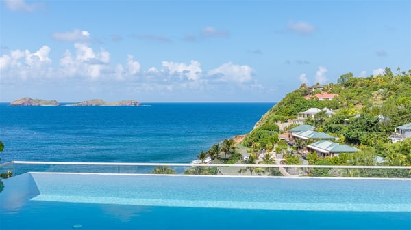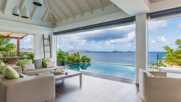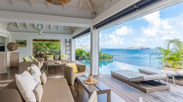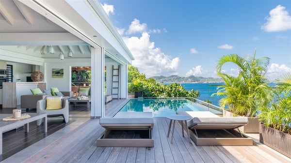 Ideally located at Pointe Milou, the charming rental villa Upside offers a spectacular view over the ocean, the bay of Lorient and the surrounding islands. Breathe in the relaxing atmosphere and enjoy the breezes that lift the surrounding foliage: this home is the perfect place for enjoying the unforgettable sunsets of St-Barths. Built on two floors, the vacation rental villa Upside features privacy areas, which groups of friends or families travelling together will appreciate. The modern and open-plan living room opens onto the terrace, so that guests can enjoy the mesmerizing view at any time. Tastefully decorated with crisp white walls, comfortable sofas, pop-coloured cushions and hanging lights, the sleek design conspires to create a soothing and serene atmosphere. The adjoining dining space can accommodate up to eight guests around a beautiful rectangular wooden table, near the well-equipped kitchen with a breakfast bar. What a pleasure to stroll in the morning in this privileged place breezed by the trade winds... The wide openings bring this perfect feeling of being both inside and outside. Take a few steps to the beautiful terrace and enjoy the breathtaking panorama. There is a beautiful swimming pool seeming to be suspended in the air, with sunbeds as the perfect setup for relaxing. All is idyllic and conducive to daydreaming, with sunbathing sessions on the deck or having a drink around the outdoor living area on the teak terrace. A barbecue is at your disposal for beautiful evenings under the stars. The holiday rental villa Upside in St-Barths has three beautiful air-conditioned bedrooms perfectly set up for your family or friends. Each bedroom is comfortable and offers a breathtaking view over the ocean. They all come with king-size beds and private bathrooms. Two suites are located on the lower level, while another room is located on the main level and opens onto the terrace. The bedrooms are mineral and candy colour-inspired, as a cocoon of well-being you’ll love to find every evening after the fantastic time spent in the amazing and beautiful St-Barts island.