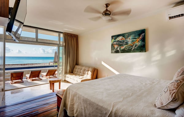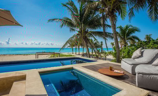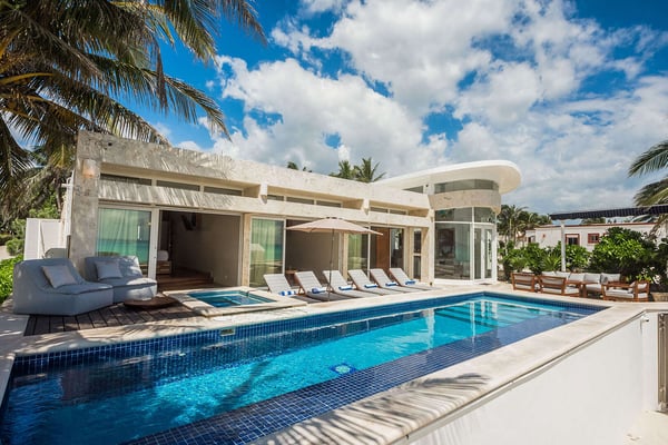 Beach House is a chic contemporary oceanfront private oasis offering four bedrooms in the exclusive gated community of Playacar. This vacation home will provide luxury, comfort, relaxation and location on one of the world's finest beaches! Enjoy the soft white coral sand and crystal clear aquamarine waters of the Caribbean Sea. This is your front yard. Beach House has unique amenities such as a freshwater swimming pool overlooking the beach, a gourmet kitchen fully equipped for on-site cooking, a grill, and four private bedrooms with individual bathrooms that give you privacy along with beachfront access to local adventures and activities. Lounge on your private stretch of beach that extends from the house with a book or take a luxurious massage while listening to the waves and feeling the refreshing breeze off the ocean. Nearby are the Mayan Ruins of Tulum, Coba, and Chichen Itza. Or, ferry across from Playa del Carmen to the island of Cozumel for snorkeling or scuba diving.