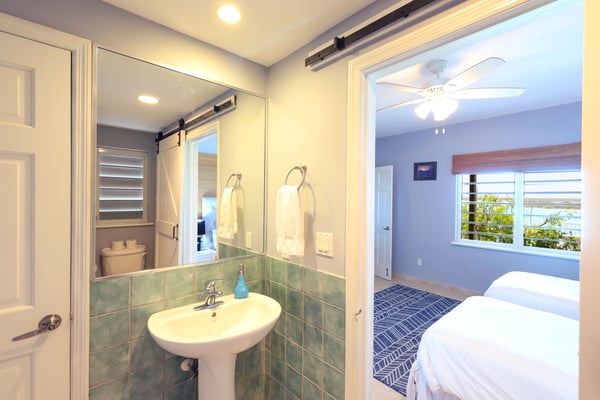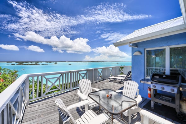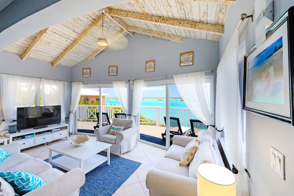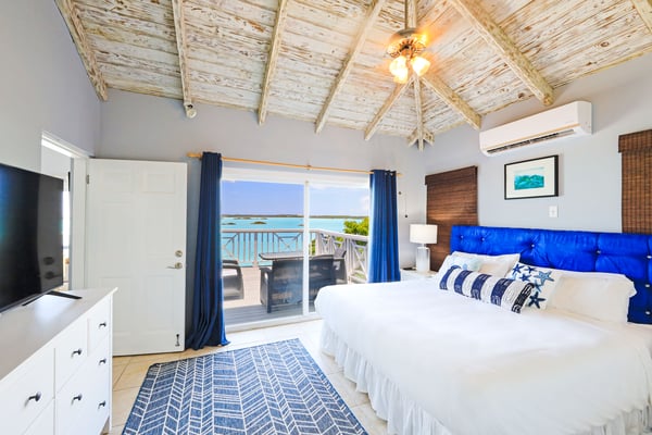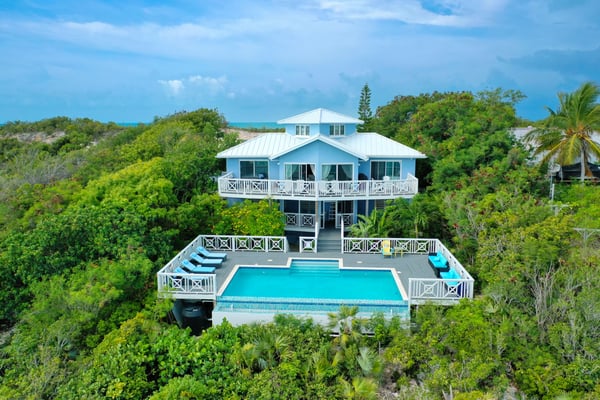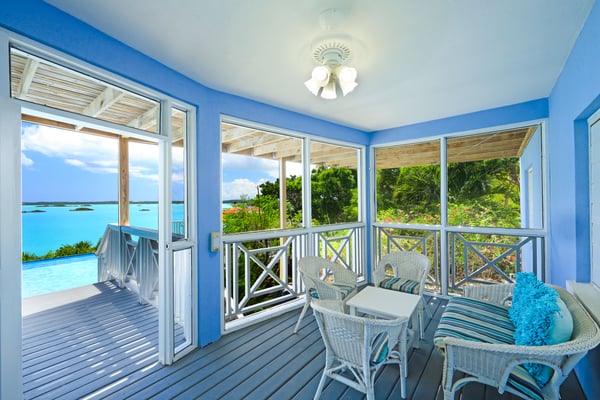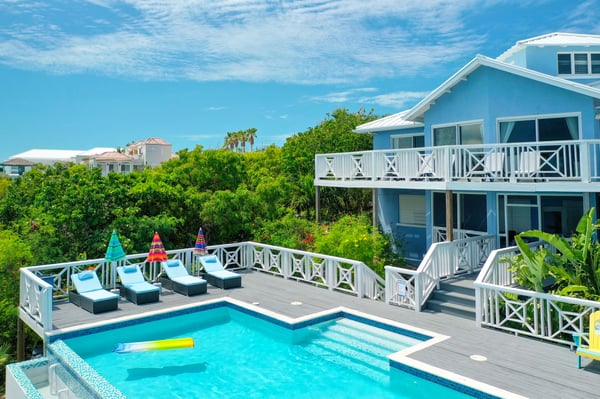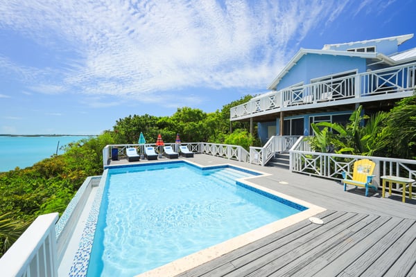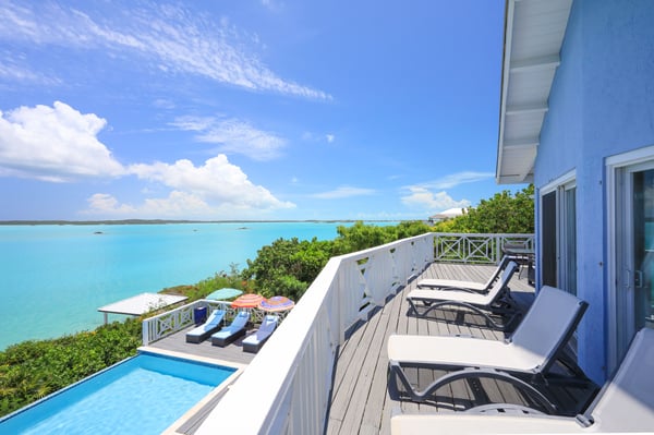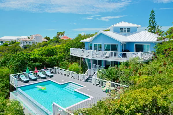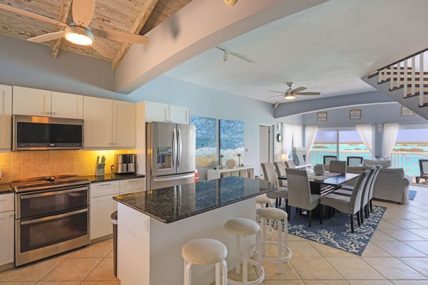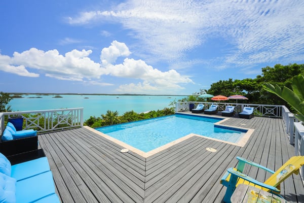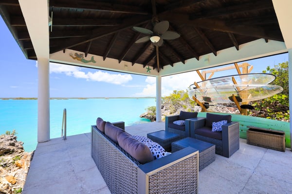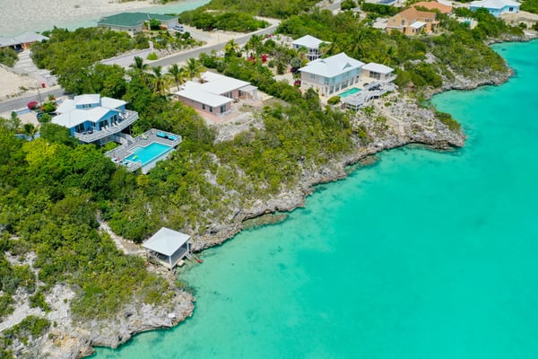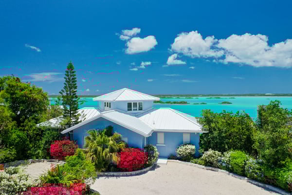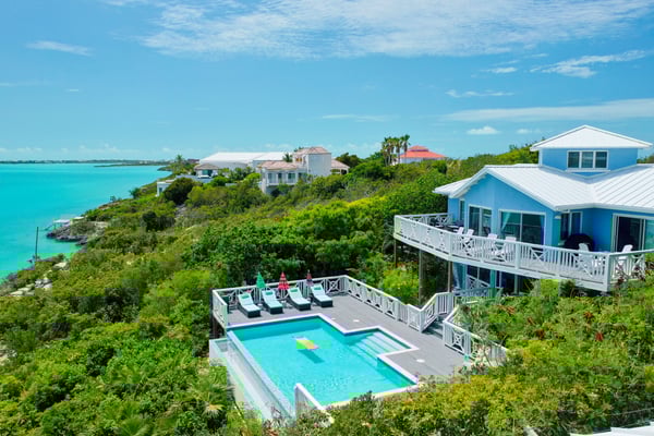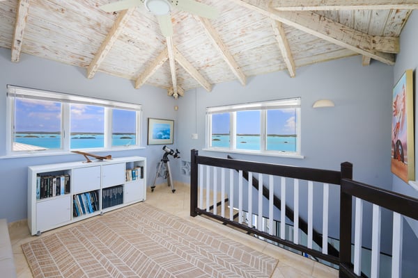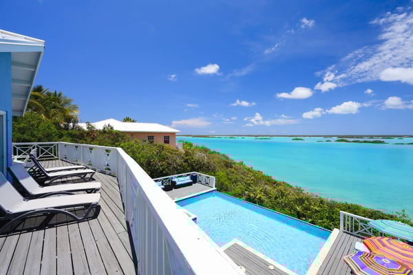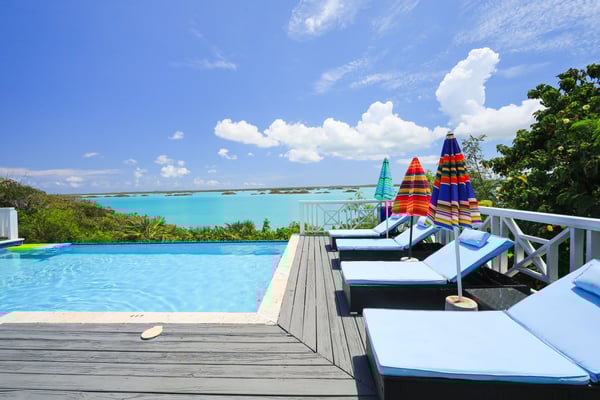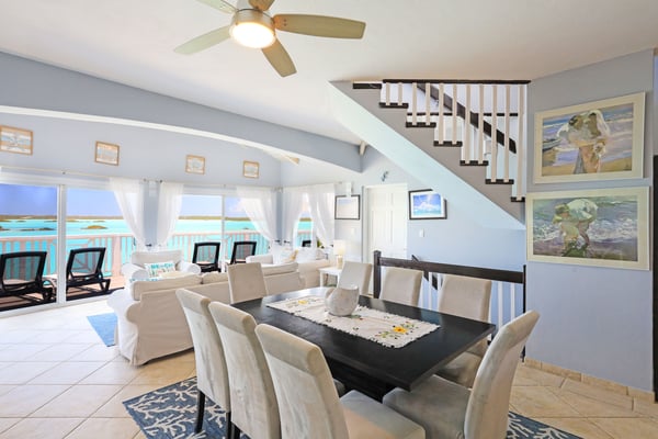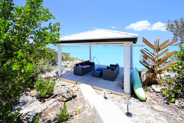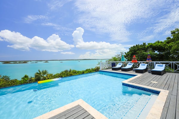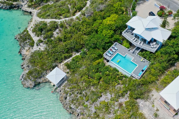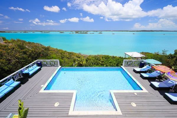 Aventine Villa is beautifully located on the peaceful, turquoise waters of Chalk Sound National Park. Swim out to one of the many small islands in the Sound, use the kayaks to visit Iguana Island, or snorkel the coral reef at the edge of the property – the Sound offers both serene beauty and unlimited outdoor fun. If you prefer, you can swim in the freshwater pool, or lounge in the sunshine on the pool deck. Privacy is guaranteed by a rich garden of tropical and native plants offering bananas, limes and papayas in season. Aventine is light and airy, with high vaulted ceilings, (ceiling fans in every room) and full-width sliding glass doors, providing stunning views of the jewel colours of Chalk Sound. The villa has four large air-conditioned bedrooms, each with its own en suite bathroom. (Three rooms have king-size beds, and one has two twins.) The spacious, fully equipped kitchen features a granite-topped center island with a breakfast bar, and includes a dishwasher, microwave/convection oven, and all small appliances such as a coffee maker, toaster, blender, mixer, etc. The main floor dining area has seating for eight at the extendable table. The lounge has a 42” plasma TV, a DVD player and a free WiFi Internet connection. Enjoy the upstairs reading room, with 360-degree views of the Sound and the ocean. With windows in every wall, you are assured of a comfortable temperature, whether you are searching for cool breezes or warm sunshine. A third lounge on the lower level is ideal for playing games. Outdoors, you will find a large upper deck that wraps around the house and an extensive pool deck, both of which offer shade and sun. A screened-in porch overlooking the pool offers a cool, shady spot to relax, while the waterside deck enjoys sunshine for most of the day. Begin your day with coffee on the upper deck, enjoying the early morning sunshine. Eat lunch at the large poolside table, shaded by the umbrella. Spend the afternoon by the water, and dangle your toes in the Sound. Watch the sun go down over the Caicos Bank from the reading room, then enjoy a cocktail while cooking dinner on the gas barbecue. After dark, stretch out on the loungers to admire the multitude of stars overhead. If you wish to explore the island, you are just a few minutes from secluded Taylor Bay beach, which offers fine white sand and spectacular sunsets. Its gently shelving beach and warm shallow water make it a perfect spot for children. The Chalk Sound area offers other beaches, a restaurant, bars, a gas station and a convenience store, but you are just 15 minutes from all the facilities of downtown, including gourmet supermarkets, spas, a casino, a golf club, and much more.