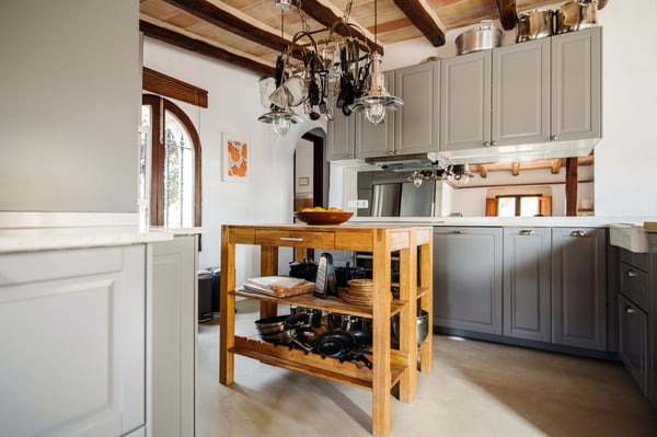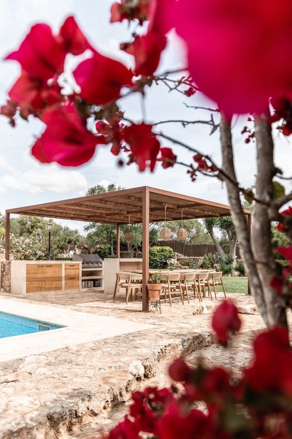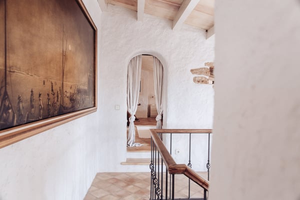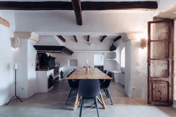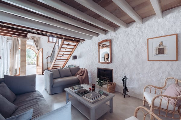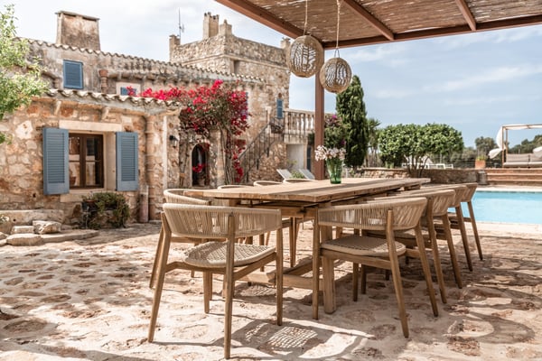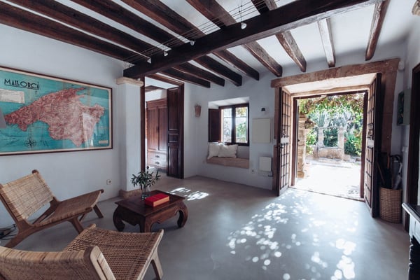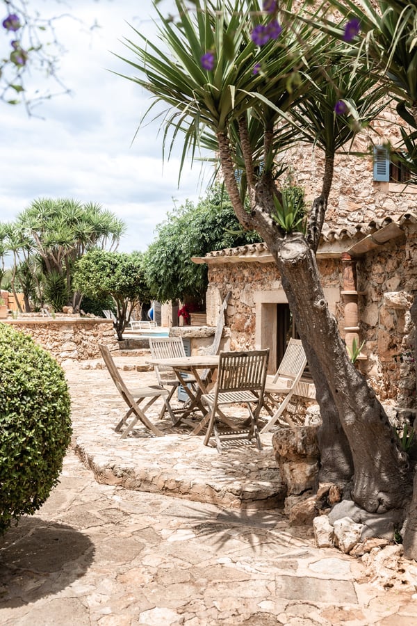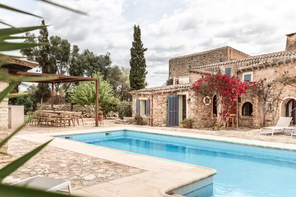 Can Papaya is situated in the beautiful countryside of Felanitx in southeast Mallorca with the stunning beaches of southeast Mallorca within easy reach. Within a 10 min drive, you will reach the villages of Felanitx to the south, Porreres to the north, and Campos to the west, where you will find markets, cafes, and restaurants. Even though Palma is only a 40-minute car ride away and the airport 30 minutes, the house has a feeling of complete countryside tranquility. The somewhat bumpy access to the house makes you feel like once you have reached the house you are in your own secluded universe. The house has over 300 years of history and has been lovingly renovated over the years with the aim of keeping the unique charm of the house. Can Papaya consists of five different apartments connected with each other. It is ideal for large family's, groups of friends, groups of colleagues, or anyone who likes the idea of holidaying together, still with the possibility to have some privacy and own space. All 'apartments' have a bedroom with a double bed, a living room (some with sofa beds), and an en-suite bathroom. The heart of the finca consists of a large kitchen and dining room with fire place, together with a cozy lounge with an open fireplace. The heart of the house is the kitchen, which was recently renovated with the idea in mind to make it suitable to cook for large groups of people. There are two large fridges (small freezer), two dishwashers, oven, microwave and cooker. The kitchen is fully equipped with everything you need. The owners love to cook and have made sure that this is a kitchen where you can do so. Outside at Can Papaya, there is a newly renovated outdoor kitchen with dishwasher, sink, gas hob, and a professional barbecue. Next to the outdoor kitchen, there is a dining table and seating for ten under a shaded pergola. There is a large pool, a Jacuzzi, and all over the garden there are groups of outdoor furniture with chill out areas, providing plenty of places to hide away with a cup of coffee and a good book. The absolute hot spot of the house is the pool house. The house has two built-in sofas, sun chairs, and a table. This is the ultimate chill out area, with permanent shade and undisturbed views of the pool. Cool and comfortable during the day and cozy for socializing in the evening. Can Papaya boasts five double rooms and five bathrooms, perfect for holidaying with family and friends, with the added luxury of your own space and privacy. The activity room has two separate entrances from the outside, where you will find a table-tennis table, yoga mats, training bench, weights, board games, darts, and a TV. There are many great supermarkets close by. One favourite is Eroski Felantix. It is situated 10 min away and has a meat and fish counter.