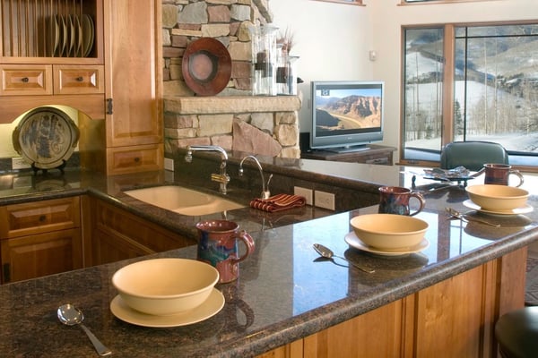 This contemporary western style townhome is conveniently located within a short walk to the Mountain Village core, placing guests near all of the area's best dining and shopping options as well as the Gondola. Its incredible position right on the popular Meadows ski run also ensures guests the ability to experience true ski-in/ski-out access. This home boasts massive floor-to-ceiling windows that offer spectacular views of the ski area and the San Sophia Mountains, and the great room houses both the living area and the kitchen space. The living area is built for entertainment, and it comes with a flat-screen television with a DVD player and an excellent sound system. It also provides access to a lovely private deck with comfortable seating and a nice gas grill. A full gourmet kitchen comes with everything needed to prepare excellent meals, and it features high-end stainless steel appliances, a Cuisinart drip coffee maker, custom cabinets and plenty of granite countertops. Guests may be served meals at the small bar table that seats four on bar stools or at the lovely dining table that seats six. On the upper level of the home, there are two guest rooms that each come with a king-size bed, a flat screen television (one with a DVD player), an en suite bath with a jetted soaking tub and a separate glass steam shower. The other two guest suites are located on the lowest level of the home; one includes a queen-size bed, flat-screen television and an en suite bath with a glass shower and a jetted tub. The final guest room is a bunk suite with four single beds, a flat-screen television and an en suite bath with a glass shower. This level also offers a large laundry room with a washer and a dryer. TMV BL# 005042