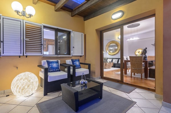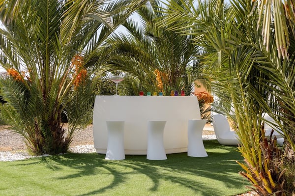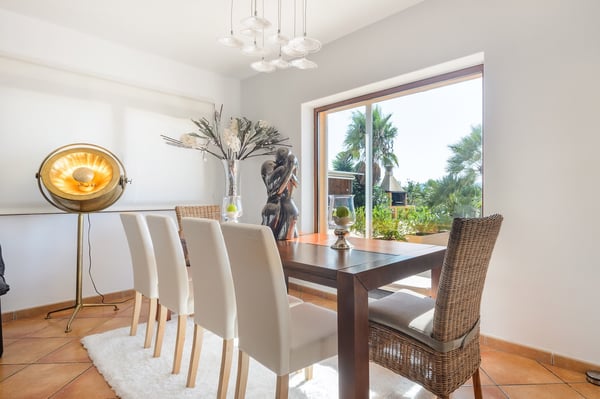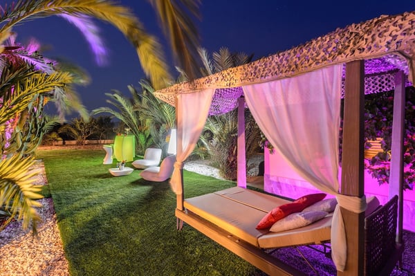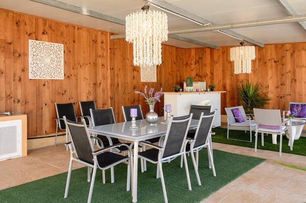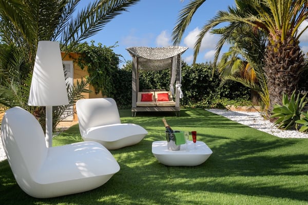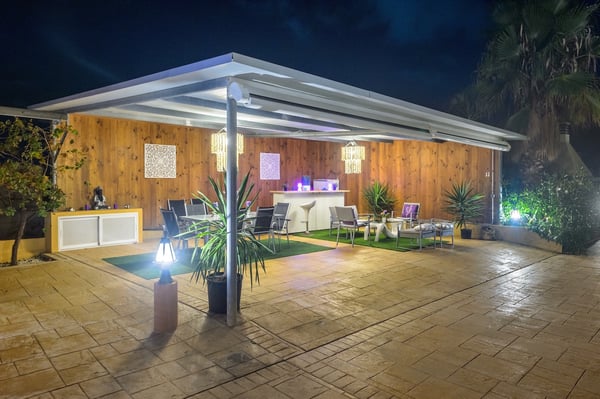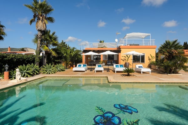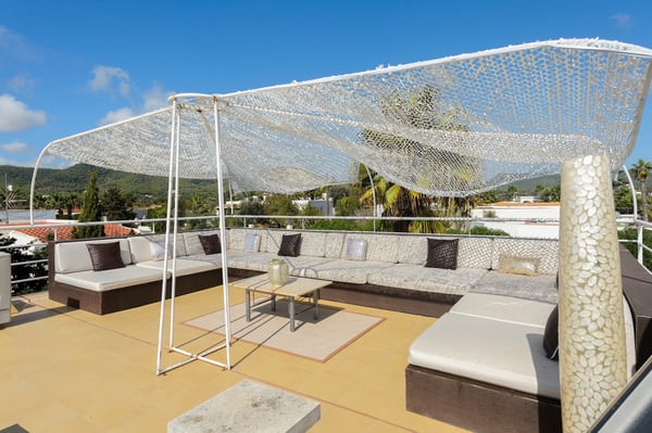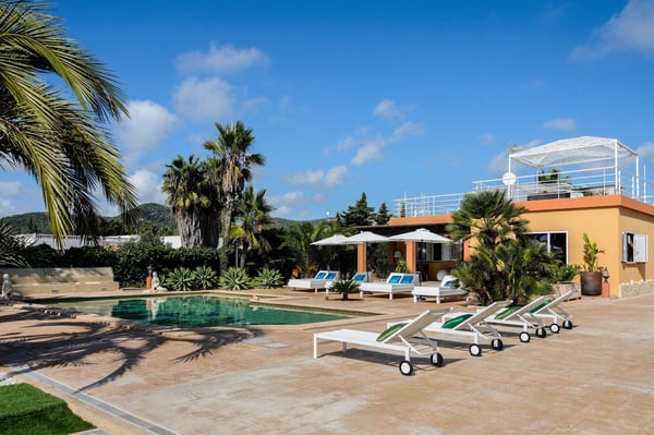 Villa D’Angelo is a short drive south of Ibiza Town and close to the little village of Sant Francesc de s'Estany on Ibiza’s southeast coast, known for the nearby salt pans and picturesque views across to the island of Formentera. Although this location is very convenient for the airport, please be aware it can be affected by aircraft noise overhead. Villa D’Angelo is a fun, sociable property in a large 2,100m2 plot with attractive gardens, a pool, and a large roof terrace. It is conveniently located for exploring Ibiza Town and the rest of the beautiful island of Ibiza. Villa D’Angelo’s 62m2 pool has an integrated jacuzzi and is surrounded by sunny terrace areas dotted with daybeds and loungers – perfect for soaking up Ibiza’s glorious sunshine – as well as a sociable barbeque area. Beside the pool, a lawned area hides behind a line of palm trees. Here, you’ll find an al fresco bar with bar stools and comfy chairs and, by night, the whole area can be lit with colourful mood lighting. A second bar space is to be found in the large summerhouse overlooking the pool, which also boasts an al-fresco dining table, seating eight, and further casual seating. Closer to the house, the terrace features another pair of armchairs and a second al-fresco dining table, seating eight. Perhaps the ultimate chill-out area is the 160m2 roof terrace. With views over the pool and gardens and magnificent vistas across the rooftops to the distant forested hillsides, this is another great space for pre- or post-club socializing. Inside, additional space for entertaining includes a living space with a large black leather L-shaped sofa overlooking the garden, and an interior dining space seating eight. This living area is open-plan to the kitchen. Villa D’Angelo is a great modern Ibizan holiday home with plenty of spaces to socialize, sunbathe or simply chill with friends. License Number: ET-0705-E / ESFCTU0000070100007027530000000000000000000ET-0705-E8
