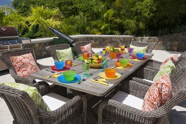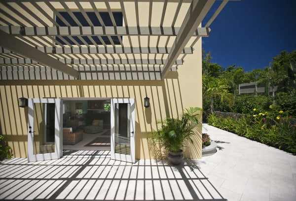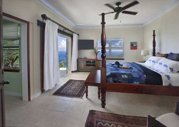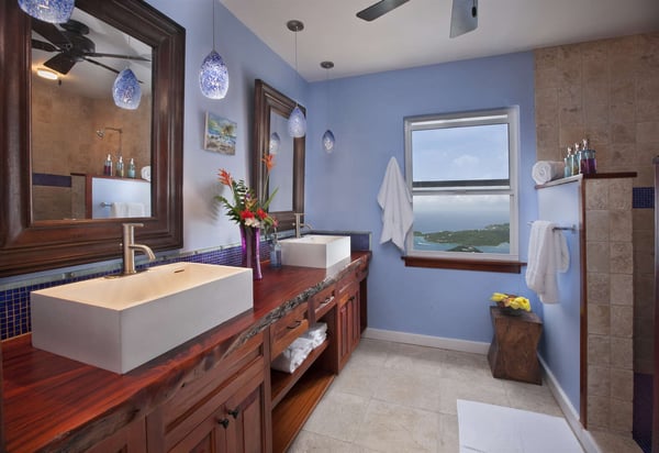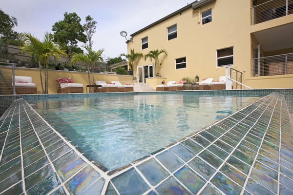Located on a ridge 300 ft. above town, the recently renovated Outrigger Villa, formerly Outrigger House, affords views of the mesmerizing Charlotte Amalie harbor with cruise ships on the Caribbean Sea, yachts, marine ports, downtown and the neighboring Water & Hassel islands' vistas. Featuring 7500 sq. ft. of covered decking, and an infinity-edged pool. There are four equal-sized master bedrooms; one of the master bedrooms is located on the ground floor with easy access (no steps) and the remaining three master bedrooms are located on the upper level. Everyone will have the best bedroom. All four master bedrooms have wall-mounted air conditioning units, a king size Bed, Wi-Fi, wall-mounted HDTV, en suite bathroom with his & hers washbowls, spacious walk-in closets, private balcony with harbor & town vistas. The fifth bedroom was added to the villa after the hurricanes and is located on the poolside of the villa, on the lower level. The bedroom has a queen bed with a twin bunk on top, ensuite bathroom and AC. The kitchen is fully equipped with a six-burner Viking gas stove/oven, a French-style refrigerator/freezer, dishwasher, coffee maker, microwave, toaster, blender & much more. It also has a breakfast nook with pool & harbor views as well as a wet bar (wine cooler, wine rack & sink) which is also accessible from the outdoor terrace & pool areas. There is an infinity edge pool from where you will enjoy harbor and town vistas as well as cruise ships' sunrise arrivals & sundown departures mimicking beautiful giant-sized floating birthday cakes. Wi-Fi is also available in the pool area. The pool is surrounded by eight large chase lounge chairs. The media room area is located on the upper level of Outrigger Villa and equipped with a big screen HDTV with satellite & Blu-Ray / DVD player. The living room is a comfortable seating area with 25 ft. high ceilings good for lounging or leisure reading while listening to your favorite music playing on the Bose sound system. The dining room table accommodates eight adults and there is also plenty of outside seating in the 75 ft. long veranda, including several picnic tables. A list of private chefs and catering services are available from owners. The expansive terrace/picnic areas are perfect for weddings, corporate retreats, birthdays & other celebrations. There is a Weber grill & several enchanting seating wrapped in lush gardens dotted with orchids and hummingbirds. Wi-Fi is also available in the terrace/picnic area. To ensure that you have uninterrupted electrical power, Outrigger Villa has its own generator with an automatic transfer switch (the power does occasionally go out on St. Thomas). Outrigger Villa is located in an exclusive residential area and has its own private electronic gated entrance with a spacious parking area that can accommodate up to 6 cars. Outrigger Villa's location provides easy & close access to historic downtown, waterfront, Frenchtown, duty-free shopping, beaches, golf course, sea aquarium, butterfly garden, water sports, Sky Ride, fine dining, ferry & seaplane docks & the airport. Construction of Outrigger Villa, began in 2012 and was completed in 2013. A lot of thought and planning was put into the building process. Renowned Caribbean Architect, Michael Helm & interior design specialist, Twila Wilson, teamed up in this project to ensure that your stay is a pleasant & memorable one. Caribbean breezes will flow through the many open spaces throughout the property keeping the house at a comfortable cool temperature. Each bedroom's air conditioning system allows you to control your room temperature for maximum sleeping comfort. This property is replacing the former St. Thomas archbishop's home which had a frail wood structure unable to withstand the passing of Hurricane Marilyn in 1995. Most of the stone walls located in the landscape remain untouched. The 1.05 acre property was bought by the builder in 2008 & almost immediately native trees & flowers were planted in the perimeter where the main house used to be. Today, you will be able to enjoy some of the fruits from the old & new trees: seasonal mangoes (May through Sept), & all-year-round papayas, bananas & passion fruit among others. Many of the trees are labeled.