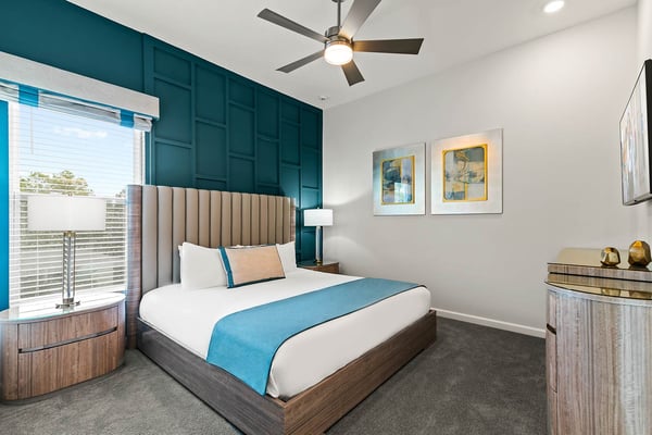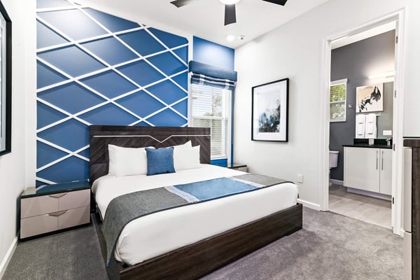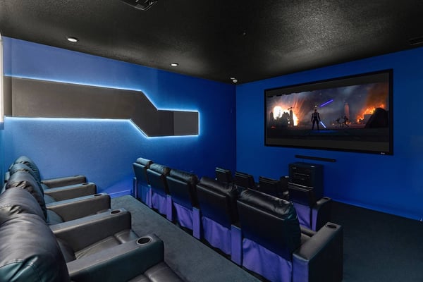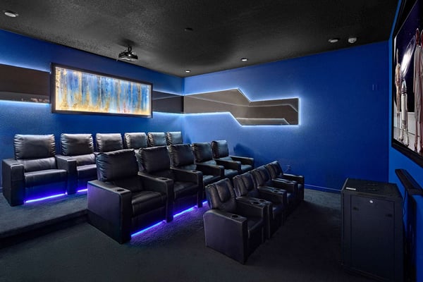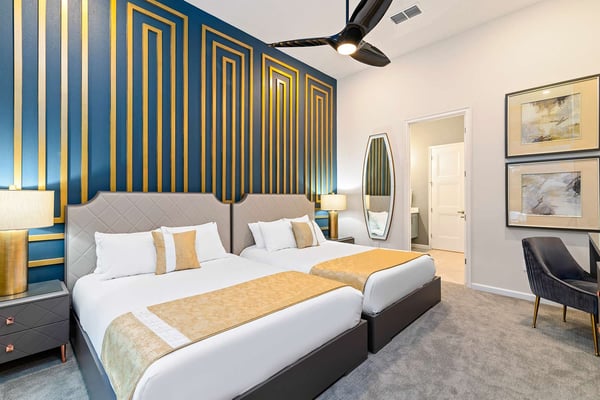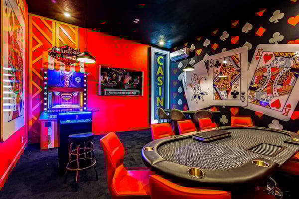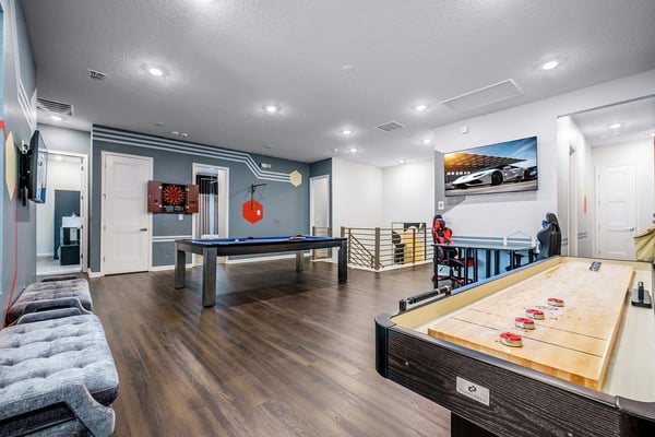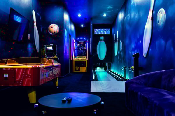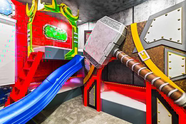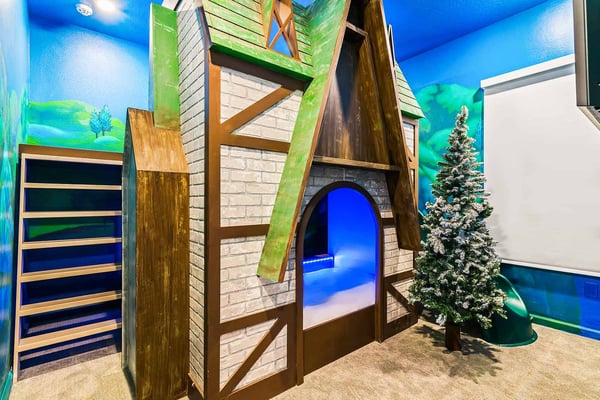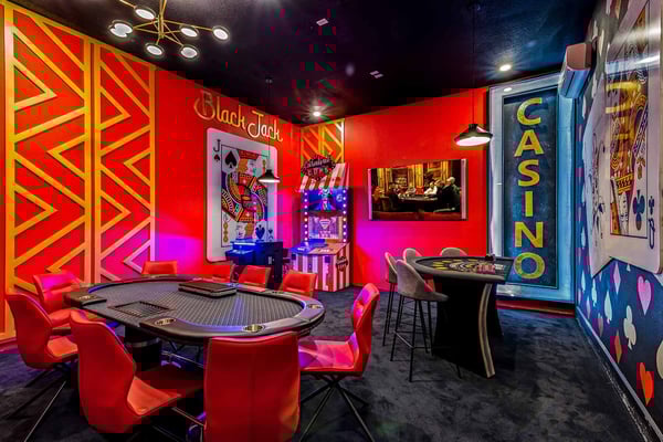Guests staying at this accommodation will have access to the amenities at Solterra Resort. Resort amenities include tennis courts ($), a lazy river ($), fitness centre ($), covered playground, scenic grounds, as well as its 15,000-square-foot Event & Conference Center, featuring fitness classes, entertainment, food experiences, and ticketed events. Why roll the dice on a family vacation when you can guarantee you’ll win big? By booking the Winning Wonderland in Villatel Village, that is. This palatial mansion is a high-roller’s dream come true, complete with a bowling alley, two themed kids’ rooms, a custom casino room, and so much more. This incredible house is designed to impress from the moment you walk through the front door and into the luxe, Mid-Century Modern great room—perfect for enjoying cocktails or bonding time with your crew. The stunning adjacent kitchen features chic blue cabinets, bright countertops, and top-of-the-line appliances. Huddle around the breakfast bar island for apps and snacks, or feast with the whole family at the spacious table in the dining area. Also on the ground floor are three of eleven bedrooms. Each room is stylishly outfitted with Insta-worthy décor: a neutral palette, marble and metal accents, and luxurious chandeliers, complemented with grand en suite baths. Whichever one you choose, you’ll hit the jackpot. Score some R&R and feel like a million bucks in your private outdoor retreat, featuring a swimming pool, jacuzzi, lounge chairs, and water slide, surrounded by an outdoor kitchen and covered patio. What’s more: this house totally ‘doubles down’ on entertainment. The first floor boasts a one-of-a-kind in-house bowling alley, surrounded by a cozy lounge area and all your classic faves to play between strikes–like air hockey, basketball, and Pac Man. Head upstairs for more fun and games in the game loft, featuring shuffleboard, darts, and plenty of lounge space to socialize and hang out with the crew. Train for the competition in the impressive state-of-the-art gym, complete with a stationary bike, Peloton treadmill, Tonal gym, and free weights. When it’s time to wind down, take advantage of the cozy theatre room—with a front row of recliners designed exclusively for the kids. At the closing credits, they’ll make a beeline for the epic-themed bedrooms. The Enchanted Village room will leave kids frozen with excitement as they step into a picturesque European village with charming sleeping quarters that double as a playhouse - featuring a twisting slide designed to make them feel like they’re gliding from the top of a mountain. Next door in the Superheroes Hideaway, kids will feel like real-life superheroes as they climb into their very own suit of armor (which disguises the coolest set of bunk beds), complemented by steel-gray paint and fluorescent lights—giving the impression that they’re in their own underground hero bunker. In addition to the three adult bedrooms on the ground floor, discover six more upstairs–each with en suite bathrooms, plush mattresses, crisp white linens, and luxe Mid-Century Modern décor.