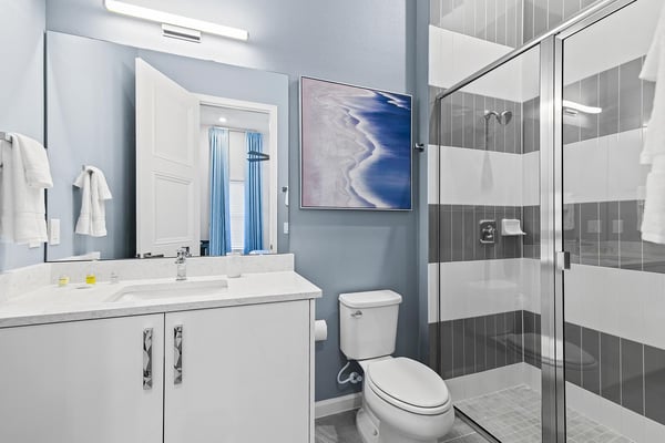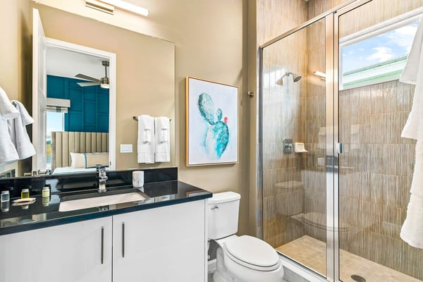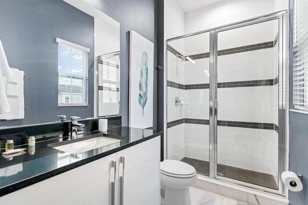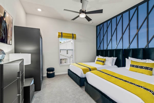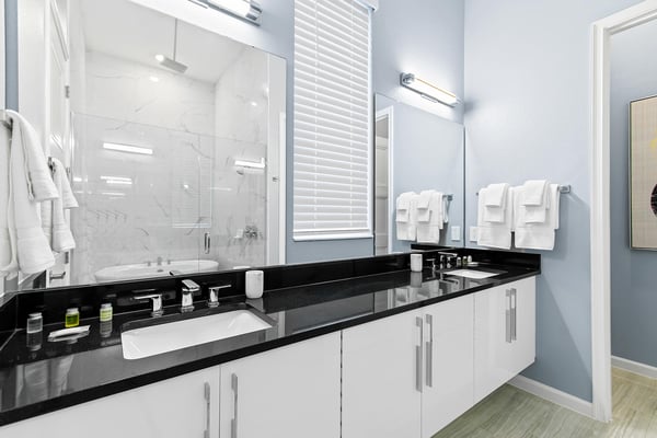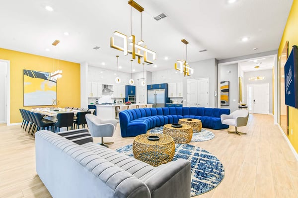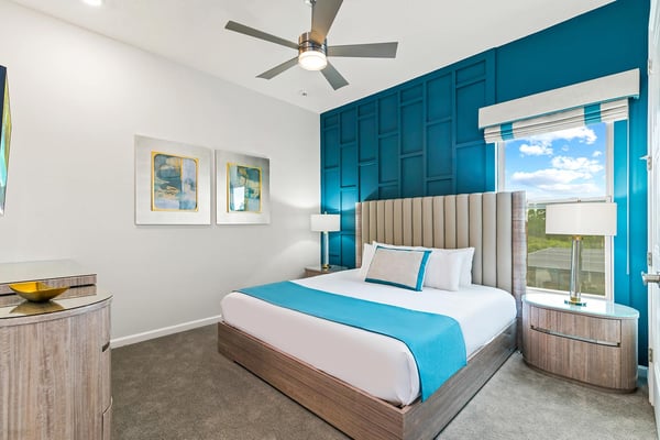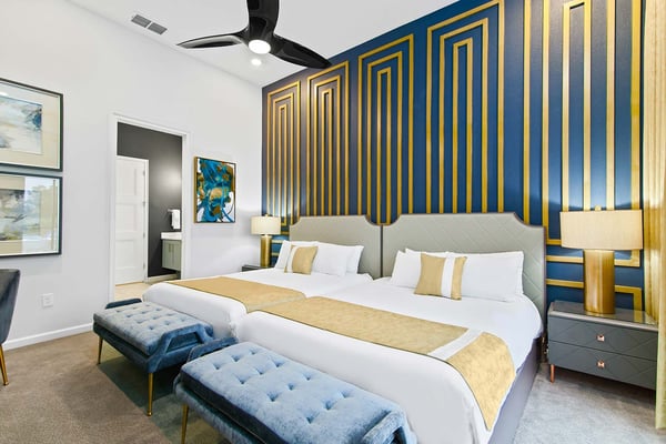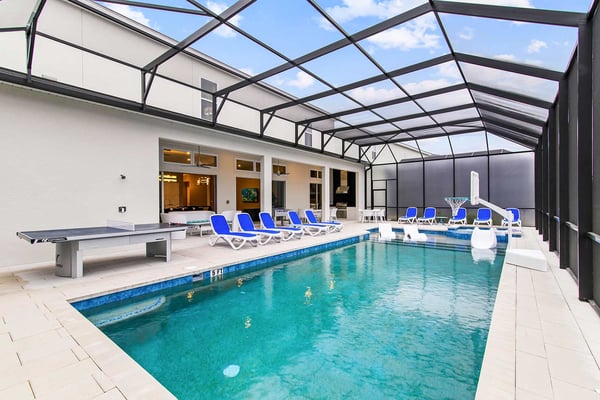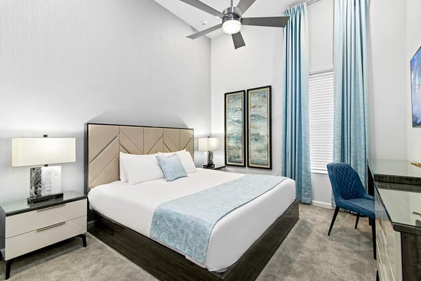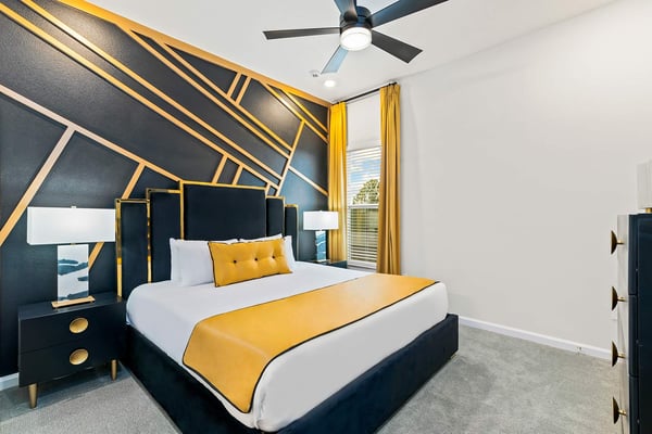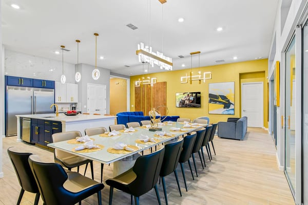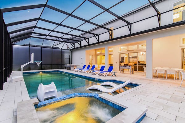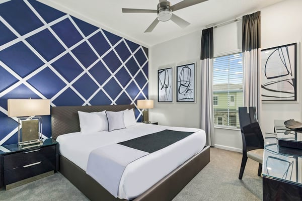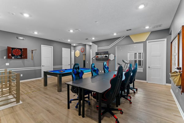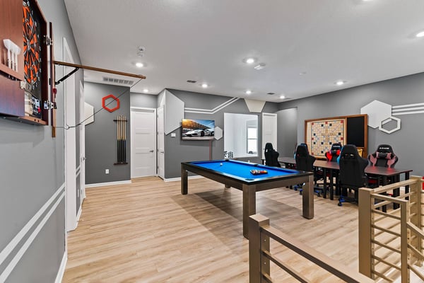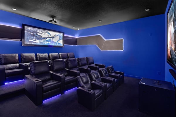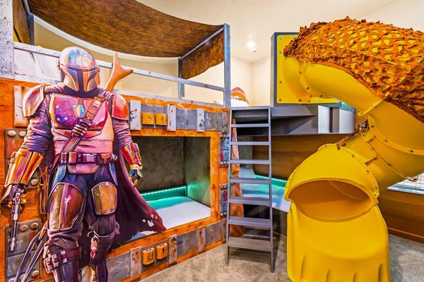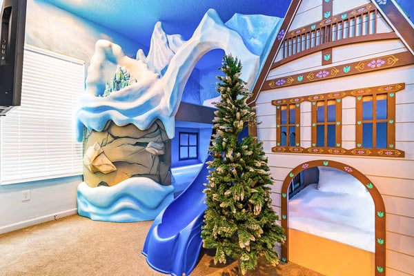 Guests staying at this accommodation will have access to the amenities at Solterra Resort. Resort amenities include tennis courts ($), a lazy river ($), fitness centre ($), covered playground, scenic grounds, as well as its 15,000-square-foot Event & Conference Center, featuring fitness classes, entertainment, food experiences, and ticketed events. Welcome to the coolest house in the sunshine state, complete with an epic, ice-themed bedroom and over-the-top amenities - like a bowling alley, private theater room and spa pool. If you’re ready to officially carve your spot on the ‘cool parent’ list, the luxurious, 11-bedroom Ice Palace is just for you! The incredible amenities begin the moment you walk through the front door. The massive great room is the perfect gathering place for all of your guests. Shuffle between the cozy Mid-Century Modern-style lounging space and the sleek, open-plan kitchen, which boasts flawless blue cabinets, clean white countertops, and all the latest gadgets. Lay down a spread at the adjacent dining room table, built for memorable feasts with the whole clan. Just beyond the living space, the real fun begins, starting with a bowling alley. In addition to two private lanes, this room also plays host to arcade classics like air hockey, Pac-Man, and more! Down the hall, discover your very own Karaoke room, an immersive space featuring backlit LED lighting designed to make you feel like the star of the show! Even more activities await in the upstairs game loft, including a pool table, darts, and more. Relax on the couch or just hang out with friends and family in this sweet social space. The TV and movie buffs in your crew will find their happy place in the state-of-the-art theater room, featuring comfy recliners, surround sound, and a massive screen. If working out is your style of R&R, the state-of-the-art gym—outfitted with a treadmill, stationary bike, and free weights—will be your go-to. After working up a sweat, cool down with a dip in your private spa pool—the centerpiece of your outdoor oasis, which also features a jacuzzi, lounge chairs, water slide, and a covered patio with a fabulous summer kitchen. Even bedtime is cool in this place! Up on the second floor, discover the one-of-a-kind themed bedrooms that will have your kids begging for bedtime. The Frozen Forest room is the ultimate wintry paradise. Kids can climb up to the snow-covered mountaintops (AKA bunk beds) and slide down their very own ice bridge. Next door in the Galaxy Room, explore a lifelike planet made of sand and stone. Tucked behind a faux mountaintop and space machinery is a twisty slide that will transport the kids from the tops of their bunk beds to the “desert” below. Meanwhile, the adults can retreat to any of the nine other impressive bedrooms, each tastefully decorated with modern yet comfortable decor, featuring warm hues, upscale furnishings, and grand en-suite bathrooms.