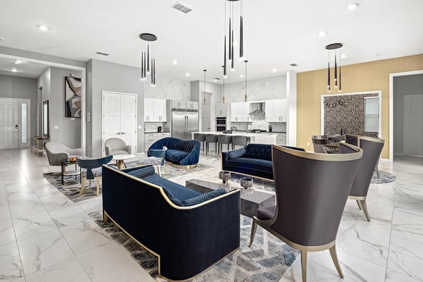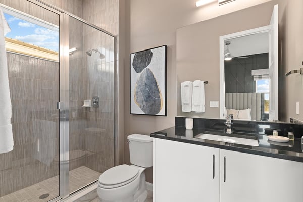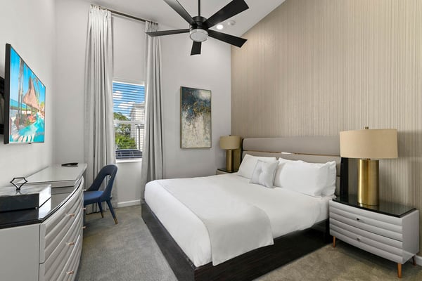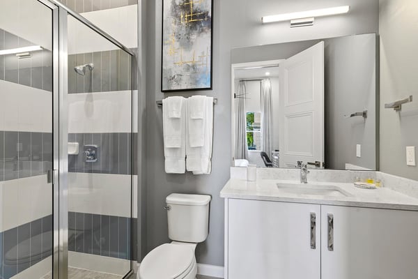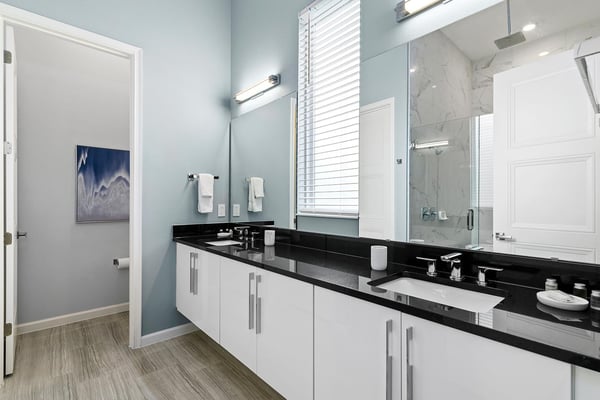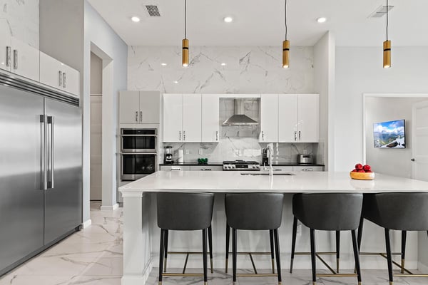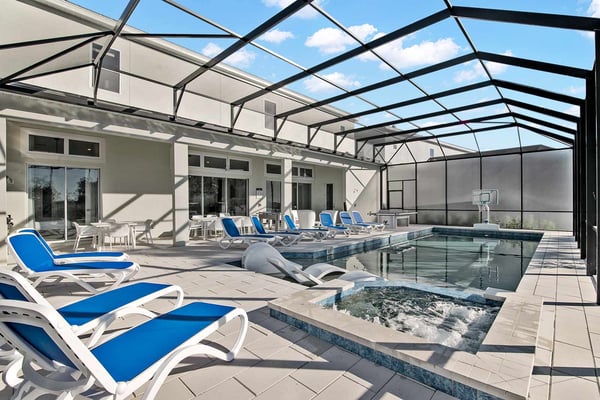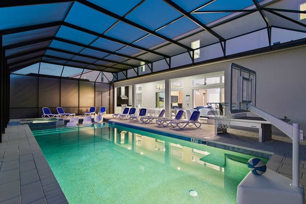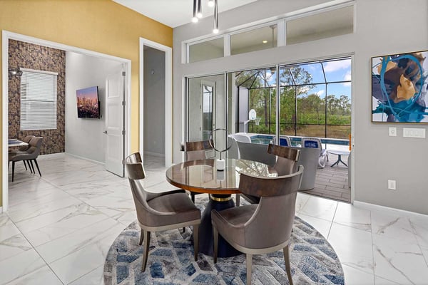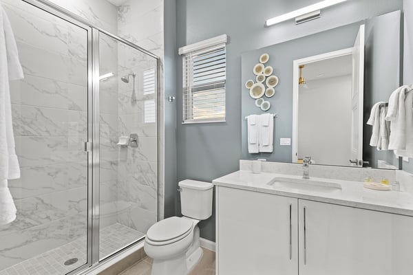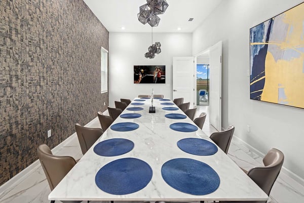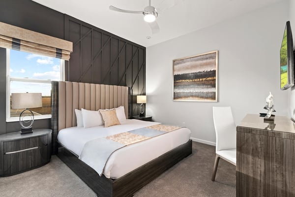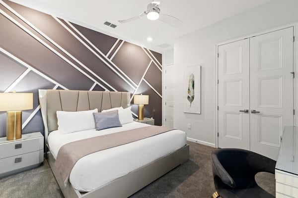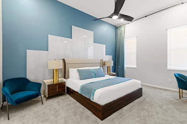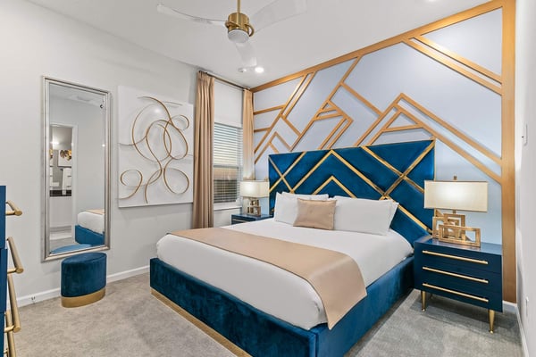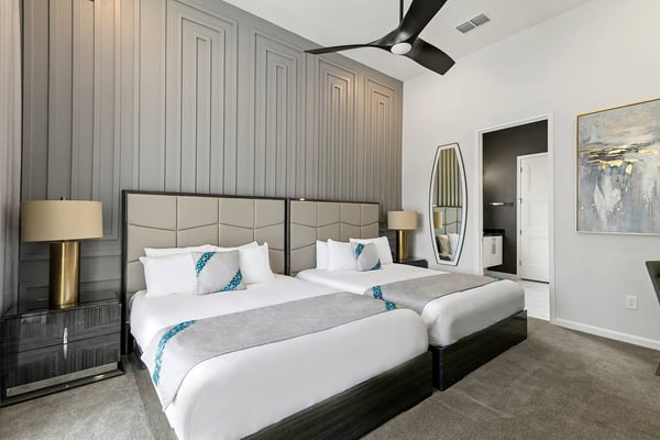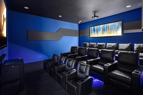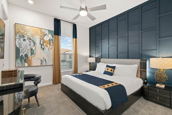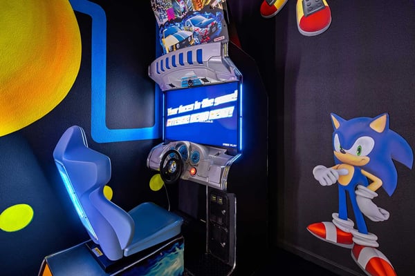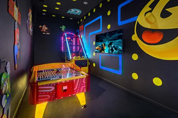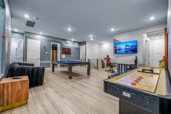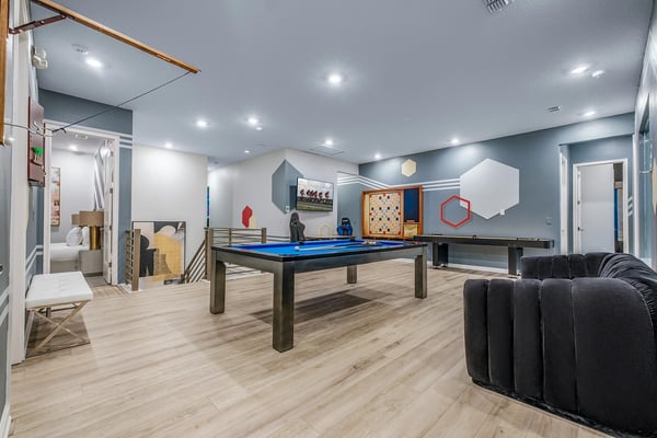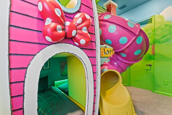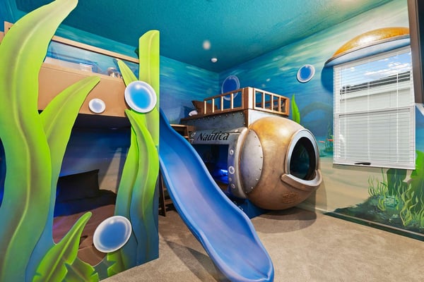 Guests staying at this accommodation will have access to the amenities at Solterra Resort. Resort amenities include tennis courts ($), a lazy river ($), fitness centre ($), covered playground, scenic grounds, as well as its 15,000-square-foot Event & Conference Center, featuring fitness classes, entertainment, food experiences, and ticketed events. Love to ski? The 'powder' is perfect in your very own ski simulator room–one of countless amenities that promise good times and bonding with your coworkers, fam, or friends in this one-of-a-kind vacation abode. Featuring charming, upscale décor reminiscent of a beautiful boutique hotel, and incredible features like a private pool, home theater, and two themed kids' rooms, this 11-bedroom mansion is designed to deliver you and your guests the space, comfort, and pampering you're craving. Just past the grand entryway, the great room of this magnificent home offers a 'hotel lobby'-style backdrop with elegant, comfortable seating and small tables, designed for lounging, socializing, or cheers-ing over champagne. The stunning, open-plan kitchen boasts generous counter space and barstool seating - a great spot for cooking and cocktails. For formal meals, set up your spread in the oversized dining room, which features seating for 16 guests (and conveniently doubles as a fabulous conference room, too)! Ski lovers can hit the slopes without leaving Orlando (or the house!). The garage has been transformed into your own personal, simulated ski slope where you and your guests can impress each other with your freestyle and racing skills. Come down from the 'mountains' and dive into your massive private pool just outside the house. Play Foosball or ping-pong on the patio, or shoot some hoops in a game of poolside basketball. Let the kids fly down the mini waterslide while you watch from inside the Jacuzzi, enveloped in hot, delicious steam. Love outdoor meals? Take advantage of the spectacular covered patio and built-in barbecue in the summer kitchen. Back inside, find even more incredible surprises in the first-floor game room that's filled with classic arcade games. Get your fill of nostalgic fun with favourites including Pac-Man, Pac-Man Basketball, a racing game, and air hockey. Upstairs, the game loft offers even more entertainment options. Lay down a challenge at the pool table, and see who can snag the gold at darts, ring toss, or wall Scrabble. When the fun and games are over, squeeze in your workout in your private gym. State-of-the-art equipment includes a Tonal all-in-one gym, a stationary bike, an elliptical, and free weights. (Note: The treadmill in the gym photo is not in this home.) Reward your hard work with a relaxing movie night in the private theatre room, complete with an 86" TV screen, surround sound, and ultra-comfy recliners. Keep the popcorn and snacks coming! The real showstoppers are the two dazzling kids’ rooms, designed to “transport you” from the deepest depths of the ocean to a vibrant wonderland. Each one features two bunk beds that will spark the sweetest dreams ever. The Ocean Explorer bedroom is perfect for the adventurers in your group. With submarine bunk beds, ocean-blue walls, bubble art, and a slide hidden behind faux seaweed, the kids will be dreaming about life under the sea (if they stop playing for long enough to fall asleep, that is!). Next door, the Mini Playhouse is a mini paradise for your little ones: a whimsical pink fairyland full of fantasy and fun, with a bright “blue sky” overhead. A colorful and inviting entrance leads to hidden bunk beds and a polka-dot twisty slide. Grownup guests get a treat at bedtime, too—with a choice of nine gorgeous, Transitional-style bedrooms located throughout the house. Each one is outfitted with modern décor, top-quality finishes, and luxurious en suite bathrooms. The first floor offers three conveniently located sanctuaries, including one primary king bedroom, one regular king bedroom, and a primary queen bedroom with two queen beds and a double door walkout to the pool area. On the second floor, in addition to the two themed kids’ rooms, discover six more gorgeously appointed bedrooms with king or full beds and private baths.