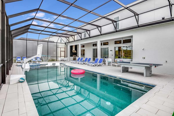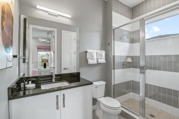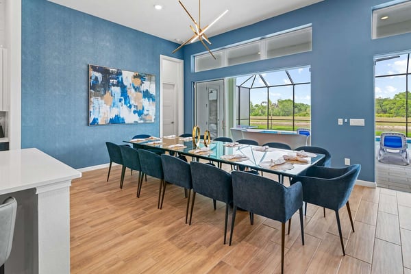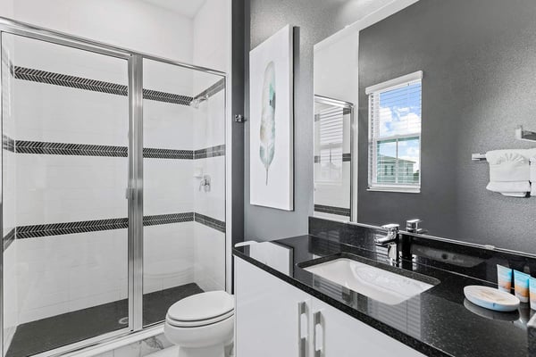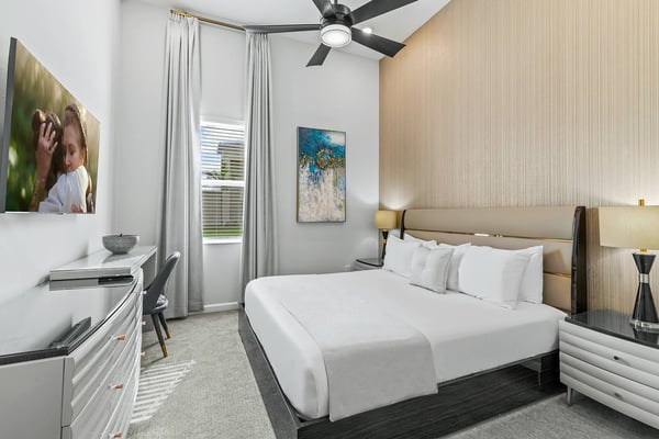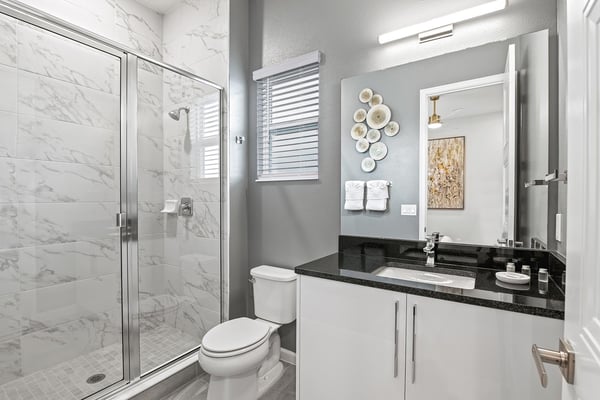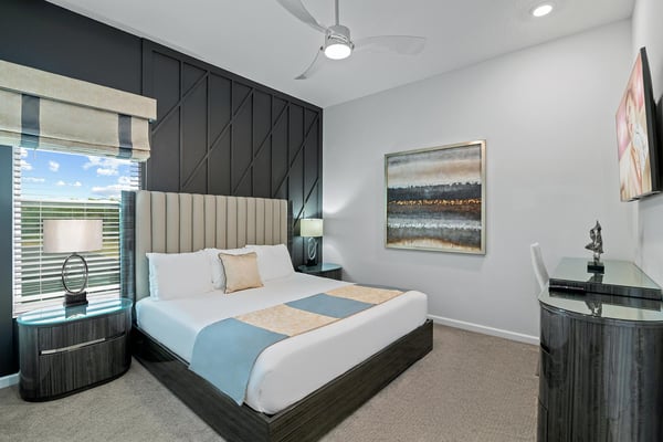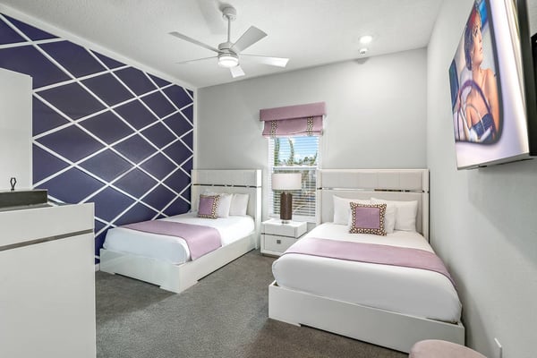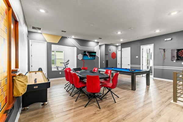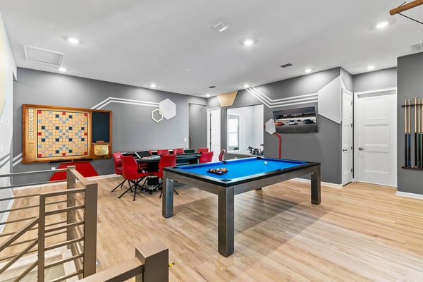 Guests staying at this accommodation will have access to the amenities at Solterra Resort. Resort amenities include tennis courts ($), a lazy river ($), fitness centre ($), covered playground, scenic grounds, as well as its 15,000-square-foot Event & Conference Center, featuring fitness classes, entertainment, food experiences, and ticketed events. Luxury, relaxation, and loads of recreational fun are on tap at the 11-bedroom Mushroom Kingdom at Villatel Village. You and your guests can indulge in this mansion’s nonstop fun and entertainment - including a jaw-dropping sports simulator room, bowling alley, movie theatre, massive pool and spa, indoor and outdoor kitchens, and more. For the little ones, the two themed bedrooms are styled after some of their favourite animated and video game characters - and are bound to fire up their most active imaginations! Your dream vacation starts in the grand foyer of this 7,200-square-foot beauty that sleeps up to 28 guests. Walk straight ahead into the spacious great room that's tailor-made for comfort and connection. Soak up every detail of the Transitional style décor - from a muted, calming colour scheme, to the contemporary artwork and luxe modern sofas and chairs. Steps away, the sleek and fully equipped chef's kitchen is a dreamy place to whip up a quick bite or multi-course meal. The vibe is cheerful and bright with blue and cream custom cabinetry, stainless steel appliances, warm brass fixtures, and light oak-hued flooring. The open-plan dining room seats 16 around the elegant table, while the kitchen island with stools is an ideal station for cocktails and snacks. Your sports-loving guests will be pumped to discover that the garage has been transformed into an athlete's dream sanctuary. The main draw here is the high-tech sports simulator that features virtual golf. This room's stadium seats, high-top tables and chairs, colourful skyline wall art, and life-size renderings of legendary sports figures all set the scene for high-adrenaline fun as you hone your MVP moves! Next, take the competition into the private bowling alley - guaranteed to deliver hours of active fun and a chance to amp up your game. Between rolls, you can grab a joystick and play one of the classic arcade games of your youth, including Pac-Man, a racing game, and air hockey. Just steps outside, take in the Florida tropics from your private screened pool and spillover spa. Gear up for outdoor fun, including pool basketball, foosball, and ping-pong. Watch the kids swoosh with glee down the mini waterslide as you stretch out in a lounger or float in the crystal-blue water. Enjoy the gorgeous weather all day long, showing off your barbecue game in the outdoor kitchen as you prep a feast for a fab alfresco meal. The entertainment continues upstairs, where you'll find a spacious game center loft offering tons of fun with a competitive edge. Choose from a pool table, ring toss, darts, wall Scrabble, and lots more. Make it a movie night with popcorn as you and your gang settle into the ten comfy reclining chairs in your private movie theatre. Gather in front of the 86-inch screen and enjoy the surround sound for a truly cinematic experience. Keep your workout fresh in your very own personal gym, complete with a state-of-the-art treadmill, stationary bike, and free weights. You can even connect via app on the smart TV for virtual training sessions. The coolest bedrooms ever, these two eye-popping themed rooms double as playhouses—and are surefire memory-makers for the kids in your group. The “Mouse House” room is a masterpiece styled after everyone’s favorite animated mouse. Wall art features dancing brooms and a starry night sky—while that famous gloved mouse hand and sorcerer’s hat reveal magic tricks amiss. Colorful ladders ascend to sleeping and play areas, and a bright, curvy slide swooshes kids down to the lower bunk bed level. The “Gamer’s Hideout” room teleports your little ones into their favorite kids’ video games. In this vivid and whimsical space, they’ll join a few beloved animated characters as they explore hidden bunk-bed nooks, climb fanciful stairs, and zip down the twisty, bright green slide. When the grownups in your group are ready to wind down, they can choose from nine beautifully appointed sanctuaries with en suite baths. Spread out over the first and second floors, the choices range from primary king and queen bedrooms to regular bedrooms with a king bed or two full-size beds. Each bedroom’s Transitional style décor—with its contemporary lines, warm textures, and the occasional pop of color—is chic and welcoming. Appointed with the finest materials, the spacious primary suites offer tubs and showers, double sink vanities, and walk-in closets.