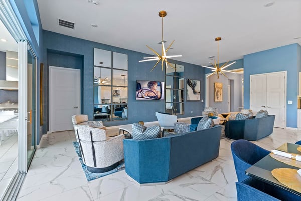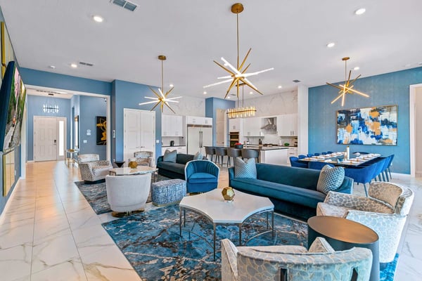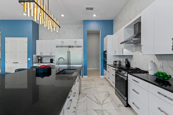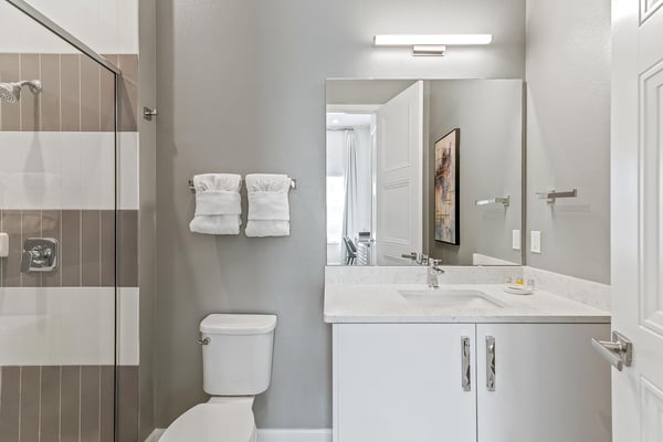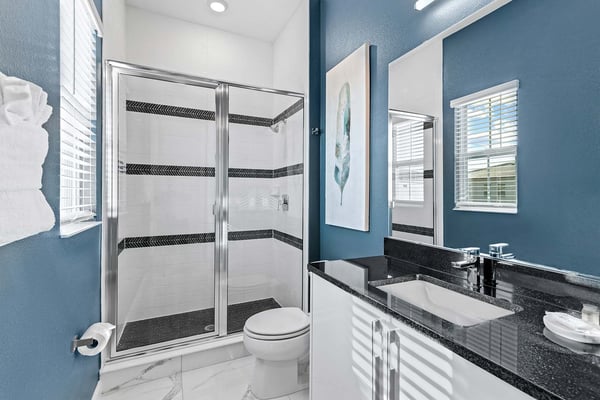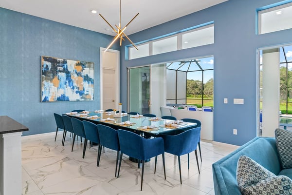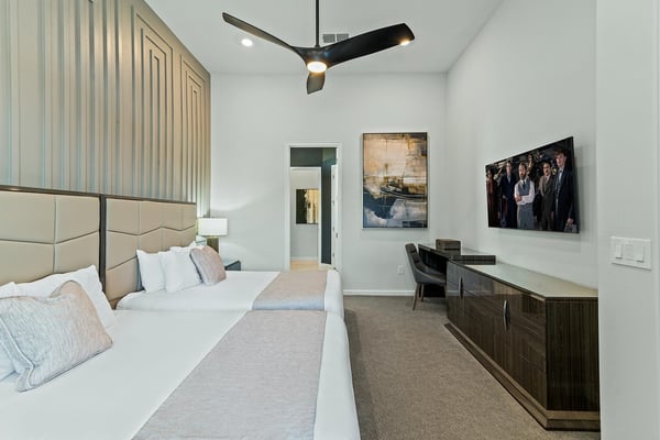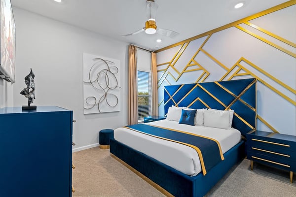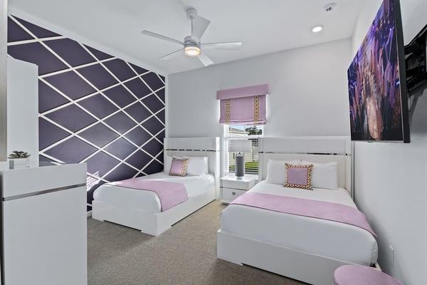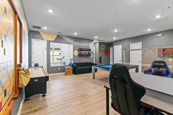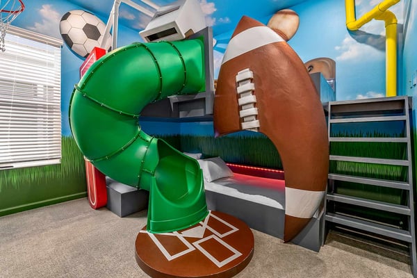 Guests staying at this accommodation will have access to the amenities at Solterra Resort. Resort amenities include tennis courts ($), a lazy river ($), fitness centre ($), covered playground, scenic grounds, as well as its 15,000-square-foot Event & Conference Center, featuring fitness classes, entertainment, food experiences, and ticketed events. Your guests will jump for joy when they discover the luxury and excitement of this 11-bedroom villa with its own trampoline room, bowling alley, private theater, and massive pool! At the Bounce House in Villatel Village—which has not one but two gaming areas—nonstop fun is a #1 priority. And the kids will flip when they get a load of the over-the-top themed bedrooms designed for pint-sized sports fans and little wizards and sorcerers. Prepare to be awed when stepping through the grand foyer and into the spacious great room, which exudes a chic and modern Transitional-style vibe. The heart of this 7,200-square-foot mansion is an inviting spot to unwind together amid comfy furnishings, a big-screen TV, and sleek décor. Beyond the spacious seating area is a top-of-the-line kitchen, which boasts elegant marble countertops, high-end appliances, and an open-concept dining area so you can feast and hang out with your entire crew all week long. Sip your morning coffee at the breakfast bar/kitchen island, or dig into a divine meal in the designer dining room with plenty of seating. Bounce the gang over to the custom garage, which has been transformed into the ultimate fun zone with a massive, bouncy trampoline, colorful wall art, and play area with slides. The first of two gaming rooms, this one pulls out all the stops with a bowling alley to call your very own. As if that’s not enough of a draw, you can also try your skills on a few classic arcade games in this fun-and-games hub. Outside, find even more incredible amenities to enjoy—namely, a sprawling private swimming pool complete with a jacuzzi, lounge chairs, kids’ mini water slide, and patio games including ping-pong and foosball. There’s also an outdoor kitchen and covered dining lanai, so you can lounge and eat by the pool all day and night. With your own private home theater, movie night has never been so much fun. Gather your crew to premiere a family-friendly movie on your very own big screen, complete with cozy recliners. Head to the upstairs loft (the second of two gaming areas) for more good times and friendly competition. Enjoy a pool table, darts, ring toss, wall Scrabble, and more. In the private gym, get your workout on with top-of-the-line equipment including a Peloton treadmill, stationary bike, and a Tonal gym. The kids’ jaws are sure to drop when they discover this mansion’s two themed bedrooms with en suite baths. Doubling as play and sleep areas, these havens are expertly designed to tap into their incredible imaginations. The Wizarding Room is an immersive wonderland for little wizards, witches, and sorcerers. They’ll feel like they’re at a famous witchcraft boarding school when they discover the hidden bunk beds and a slide that’s like riding a broomstick. Next door, the Sports Palace room captures the hearts of aspiring athletes with its stadium-styled bunk beds, colorful décor, and a super slide. Playtime here is a major sporting event for your little MVPs, and bedtime is stress-free because the kids will never want to leave this sporty hideout. When it’s time to turn in, nine more luxurious bedrooms cater to grown-up tastes with luxe Transitional-style décor, grand furnishings, and high-end en suite baths. On the first floor, find three conveniently located sanctuaries, including two primary bedrooms with king-size beds, and a primary queen bedroom with a double door walkout to the pool area. On the second floor, in addition to the two themed kids’ rooms, discover six more gorgeously appointed bedrooms with en suite baths.