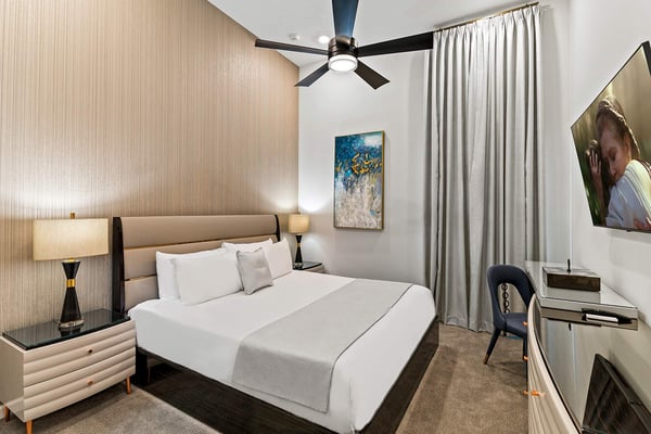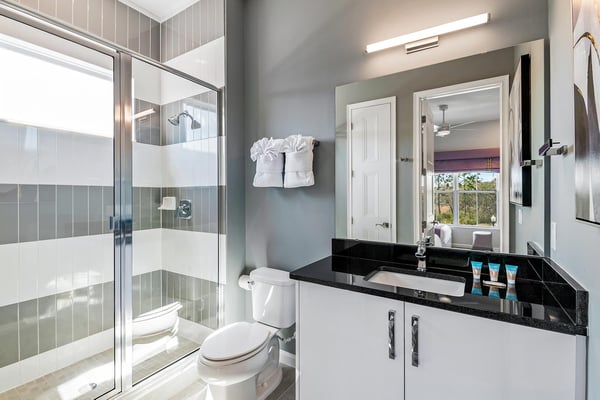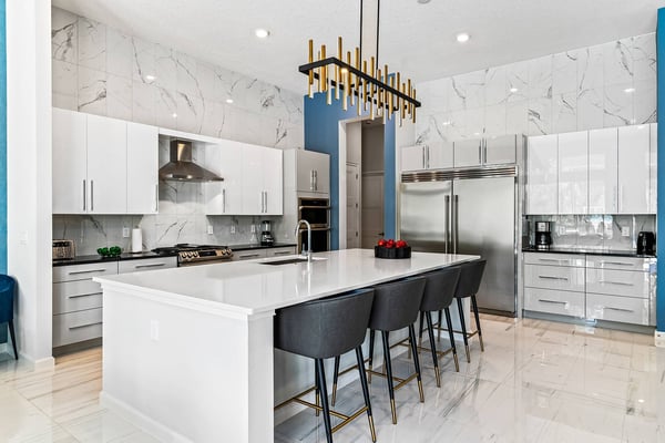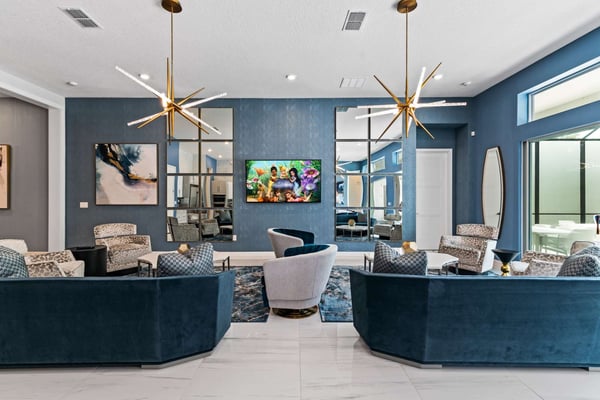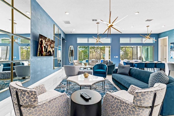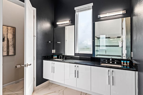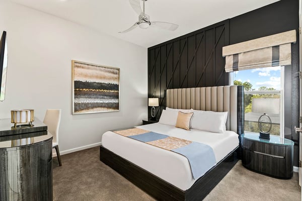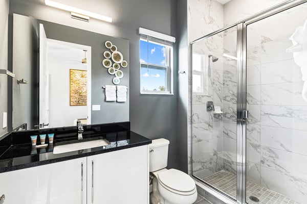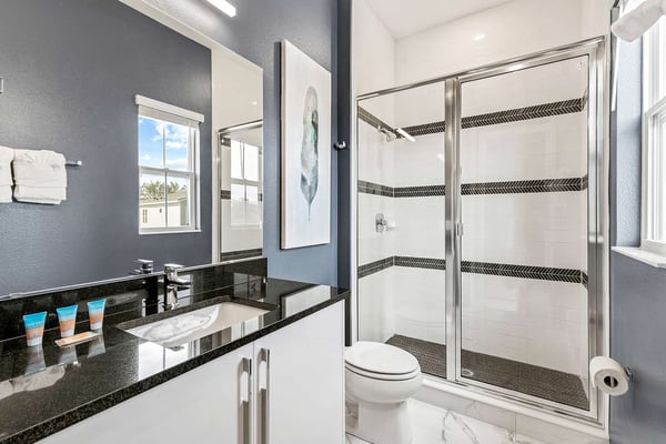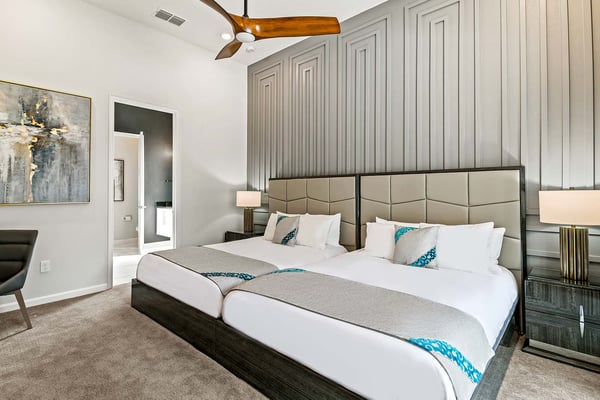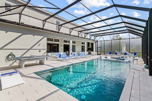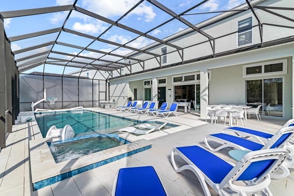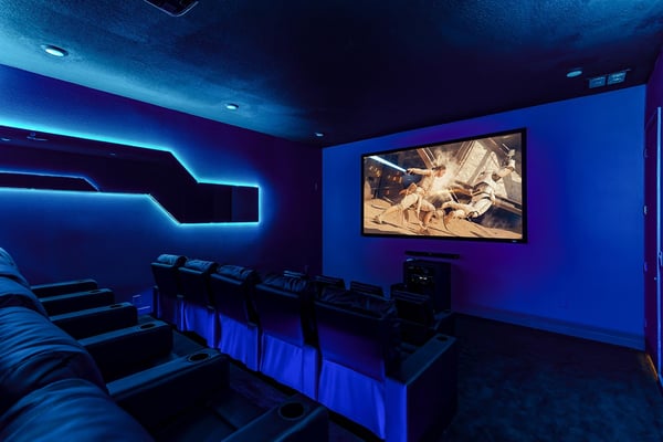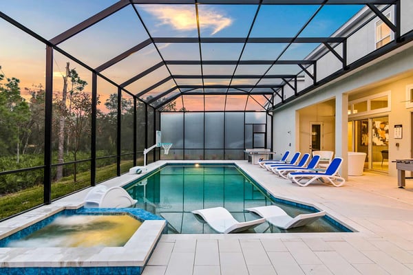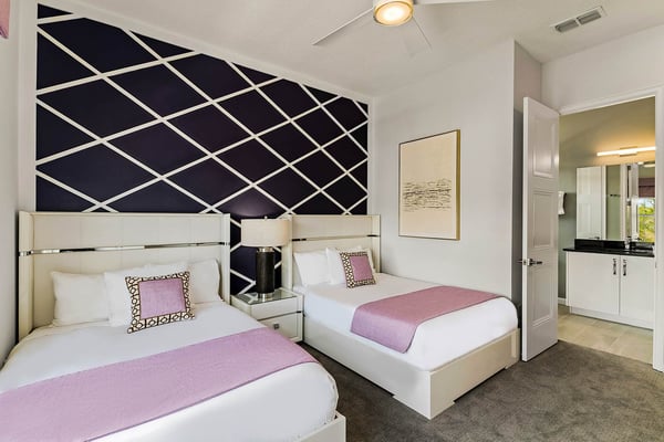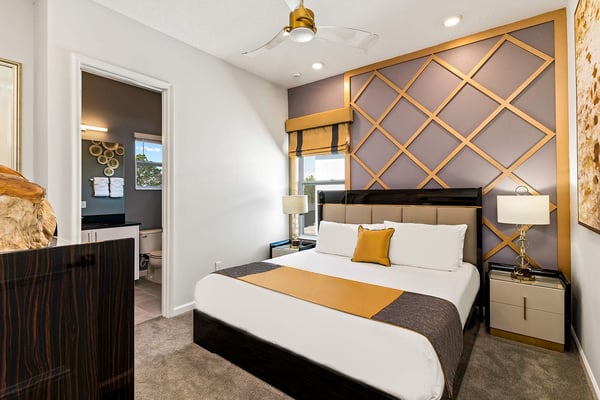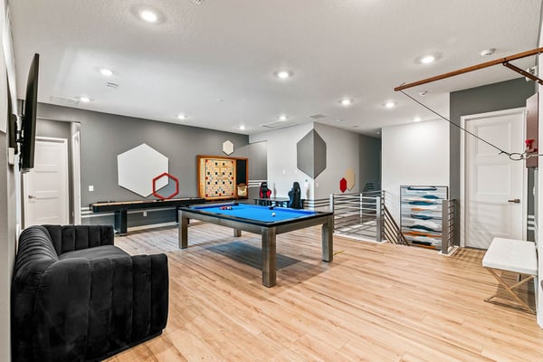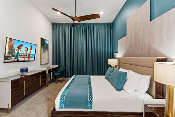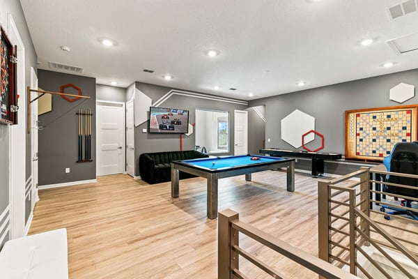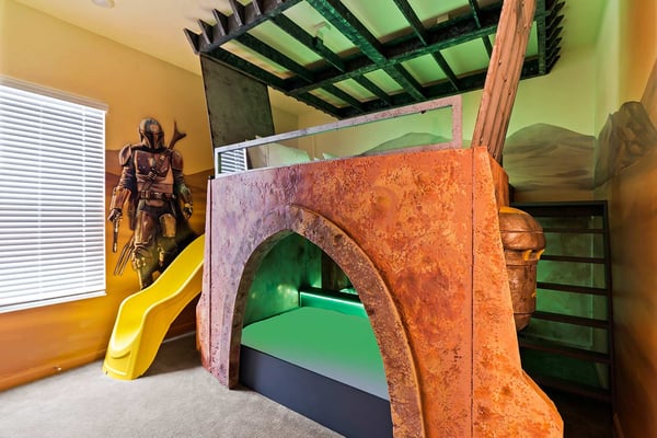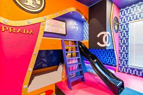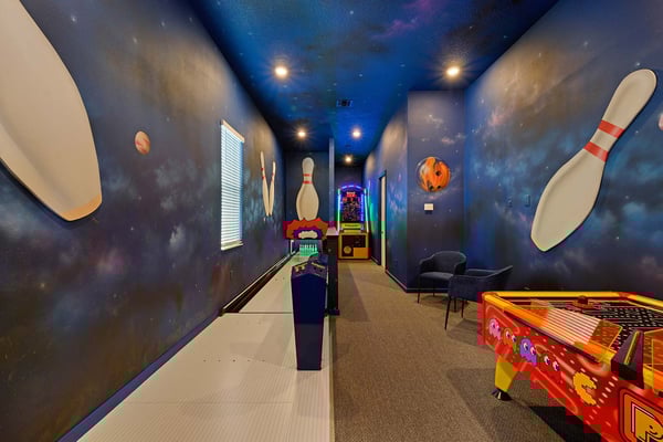 Guests staying at this accommodation will have access to the amenities at Solterra Resort. Resort amenities include tennis courts ($), a lazy river ($), fitness centre ($), covered playground, scenic grounds, as well as its 15,000-square-foot Event & Conference Center, featuring fitness classes, entertainment, food experiences, and ticketed events. This vacation paradise boasts 11 stunning en suite bedrooms, grand living spaces, and totally unique features—including a fabulous themed playroom, personal theater, high-end gym, bowling alley, and a huge pool with a spa. This villa will transform your wildest vacation dreams into a reality! Jaws will drop as you enter the eye-popping great room, a grand socializing space outfitted with stunning Transitional-style décor. This contemporary room boasts an abundance of seating options and a massive TV: the perfect backdrop for lounging or entertaining guests. The adjacent, top-of-the-line kitchen features classy marble countertops, high-end appliances, and a sleek, spacious island with seating for enjoying mealtime (or game night) together. Inches away, an open-concept dining area offers a ton more space for a sit-down feast with the entire crew. Throughout the ground floor, explore all of this home’s premium upgrades, including a private bowling alley built into an oversized arcade room. Expect memorable laughs and playful banter as you and your crew rock and bowl, and challenge each other to a game of air hockey, basketball, and more! Take in the city sights in this adorable Mini City play space, replete with a grocery store, ice cream shop, toy cars and gas station, arcade games, and even a 'Town Hall' - which houses a trampoline inside! The kids will spend hours getting lost in this 'real world' reimagined in pint-size. (The trouble will be getting them back to the *real* real world… and into bed!) The game loft upstairs plays host to even more incredible entertainment (and friendly competition), like shuffleboard, darts, and table games. Dial up the heat even more with a workout in the gym, which features a stationary bike, a Tonal gym, and an elliptical machine, all overlooking views of the surrounding lush greenery. After working up a sweat, cool off with a dip or a drop-down the water slide into your spa pool, before retreating to the jacuzzi and lounge chairs for some R&R. Plus, take advantage of the other poolside amenities, including an outdoor kitchen, covered patio, and table games. The luxe theatre room is the perfect treat to top off an action-packed day. Sit back and relax with a bucket of popcorn on the plush recliners that are practically as comfy as beds. You're best off waiting to snooze in one of nine ultra-luxurious sleeping quarters. Choose from king and queen primary bedrooms, regular king bedrooms, and one bedroom with two full beds. Each room is decked out with drop-dead décor, fabulous finishes, and an en-suite bathroom. The kids will be begging to go to bed once they spot the two immersive themed bedrooms. The Parisian Paradise room will transport them from the hot Florida sun to the fashion runway, brought to life with chic furnishings and wall décor. Next door, the Secret Galaxy room will transport your little ones to a lush green planet in a galaxy far away. Here, they can climb kid-sized ladders to explore treehouse dwellings (aka bunk beds), while a twisty slide whisks them back to earth. They’ll love sleeping as much as playing in this intergalactic forest home with its leafy canopy overhead.