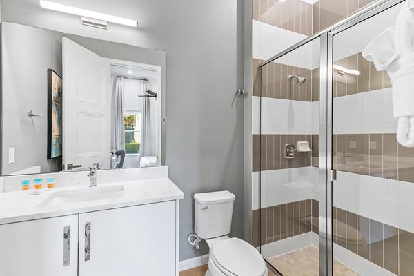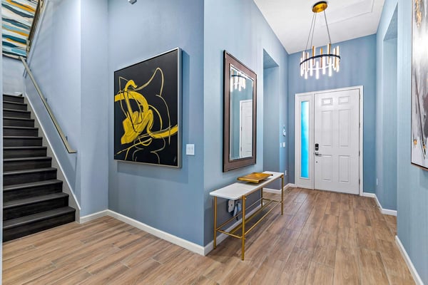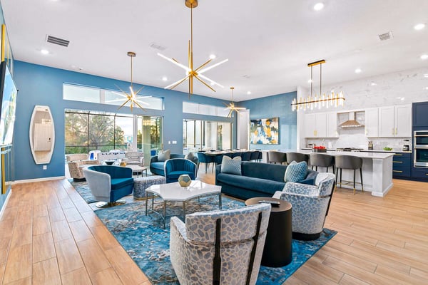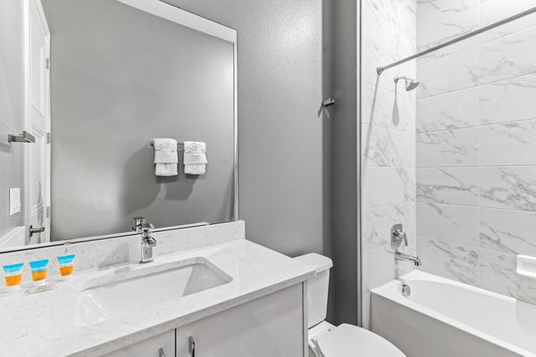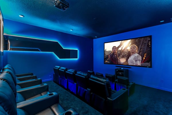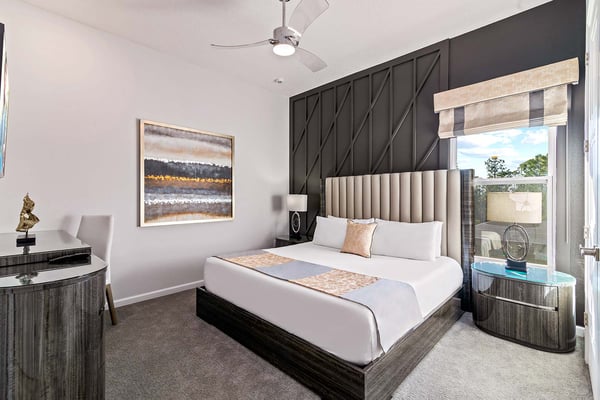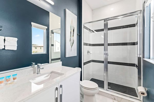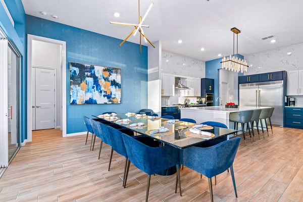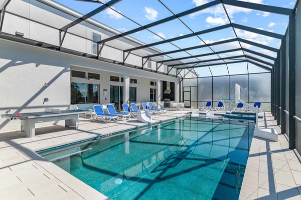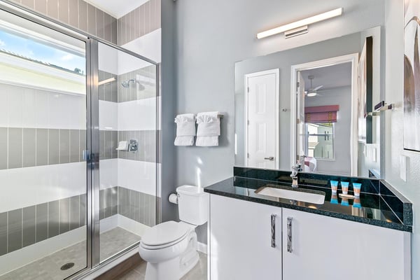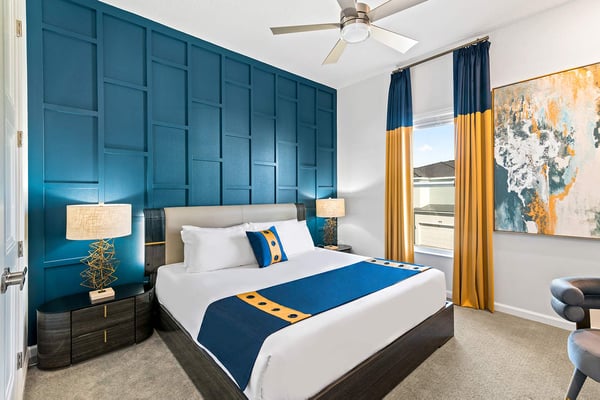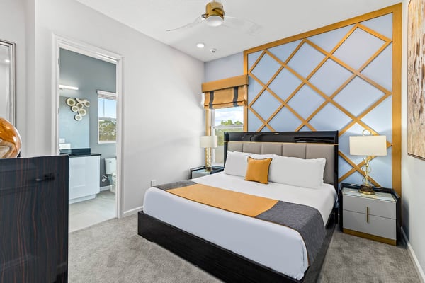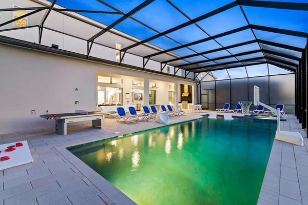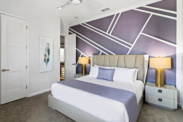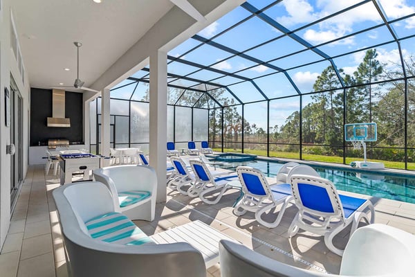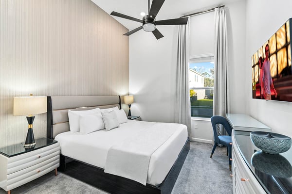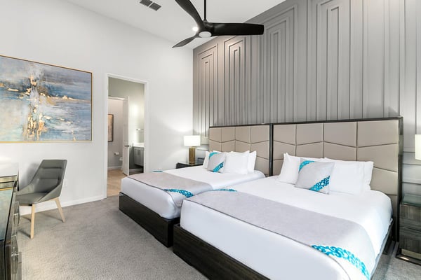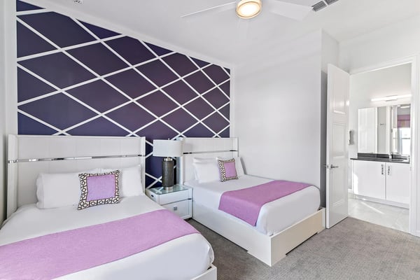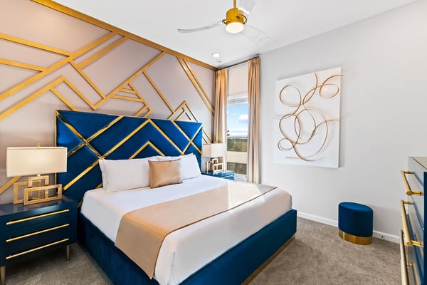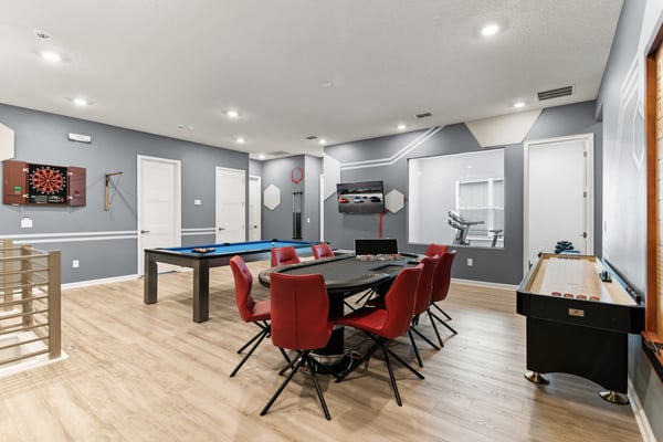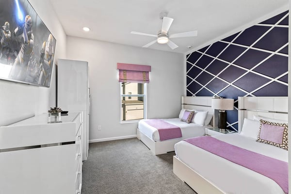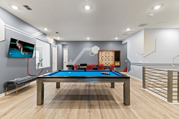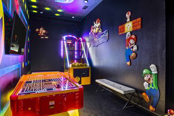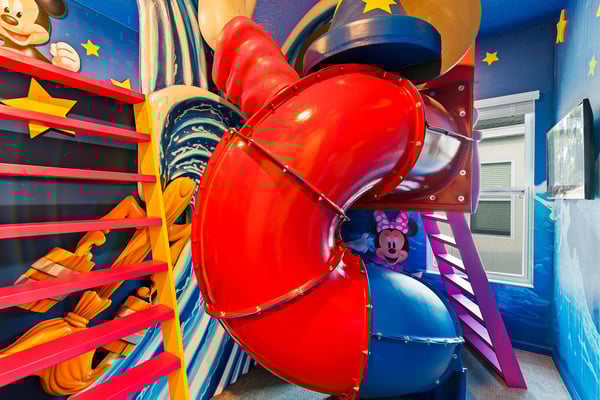 Guests staying at this accommodation will have access to the amenities at Solterra Resort. Resort amenities include tennis courts ($), a lazy river ($), fitness centre ($), covered playground, scenic grounds, as well as its 15,000-square-foot Event & Conference Center, featuring fitness classes, entertainment, food experiences, and ticketed events. Experience an entire universe of fun surprises and luxe amenities at the 12-bedroom Galaxy Getaway mansion at Villatel Village! Your party of up to 34 guests will be starry-eyed over the out-of-this-world (literally) galaxy-themed arcade with a tiki bar. Whip up jedi-worthy drinks while facing off in epic arcade games reminiscent of your favorite sci-fi franchise. The fantasy continues in the theater, gym, private spa pool and jacuzzi, huge living and dining spaces, outdoor kitchen, and more. The grand foyer of this phenomenal Transitional-style mansion opens into the great room: a chic-yet-functional lounge and social space featuring comfy furniture, an oversized TV, and plenty of space to move about. Take your lounging outdoors to your private, screened pool and spa. This tropical oasis is perfect for relaxing under the sun, cooling off in the refreshing water, or turning up the heat with a game of pool basketball, foosball, and more. When lunch or dinner time rolls around, fire up the summer kitchen for some alfresco dining and an icy cocktail on the covered poolside deck with tables and chairs. Back inside, the designer chef's kitchen with breakfast bar seating features stunning, top-of-the-line equipment and finishes—like stainless steel appliances, elegant blue and cream custom cabinetry, stone countertops, and bright light flooring. Plus, it’s fully stocked with the cooking gear and gadgets you need to prepare a quick snack or an entire meal! The first of two indoor recreation rooms, the game room on the first floor, will wow the arcade game lovers in your group. Enjoy 24/7 access to joystick favorites like Pac-Man and Pac-Man Basketball, or try your skills at air hockey or a classic racing game. Head over to the galaxy-themed tiki bar and get ready to battle it out on the Battle Pod and myriad other themed games–while sipping delicious neon cocktails (Planet Hoth Toddy, anyone?). Dark walls and ceilings spotted with twinkling stars and celestial landscapes will bring your wildest fantasies to life. Next, head upstairs to discover entertainment like none other. The game loft offers something for everyone, from shuffleboard to wall scrabble, pool, and lots more. Host a family night to remember in the private home theater. Fair warning: you may not be able to stand up from the fifteen ultra-comfy reclining chairs (including 11 for adults and 4 minis for the little ones)—luckily, the theater is open 24/7! No need to skip your workout on this vacay. The private gym is a perfect place to reenergize with the latest treadmill, stationary bike, and free weights. Enforcing bedtime will be a breeze when your little ones step foot into any of the three themed bedrooms—one on the ground floor and two on the second. Be transported to a faraway universe in the Galaxy Room—this mansion’s special “12th bedroom” and certainly its most impressive hideaway. In this fantastical oasis, colorful wall art brings to life savannahs, mountains, and grasslands, and the custom bunk bed will make the kids feel like they’re tucked away in a hidden cave in the sky. Not to worry, they can return to earth by sliding down the curvy escape slide! The eye-popping Wintry Wonder room will send your snow princesses burrowing into one of the two beds hidden away in the Nordic cottage, surrounded on all sides by wintry wall art and lifelike snow. Over in the Furry Fantasy room, the kids will join their favorite animal characters in an enchanting, colorful space, where dancing brooms, mushrooms, and fairies come to life in vivid wall art and décor. Climb the ladder to the elevated playhouse and slip down the curvy red and yellow slide into a bedroom that doubles as the ultimate playhouse. Meanwhile, you can settle into any of the three deluxe ground-floor bedrooms, including two primary with en suite bathrooms. The second floor plays host to six more beautifully appointed bedrooms with en suite bathrooms—each complete with spacious closets, warm-yet-stylish décor, and ultra-comfortable furnishings.
