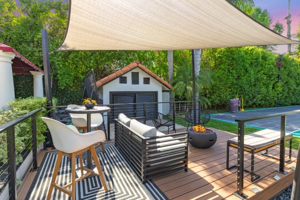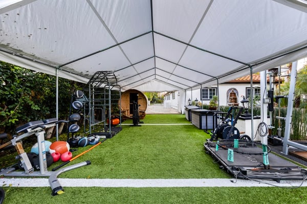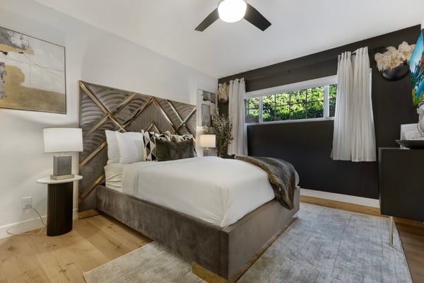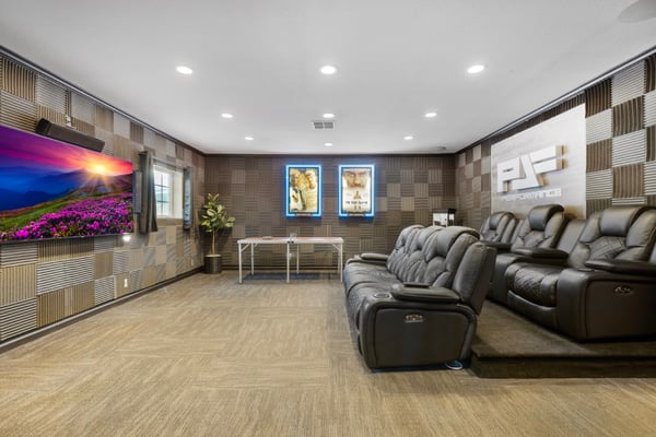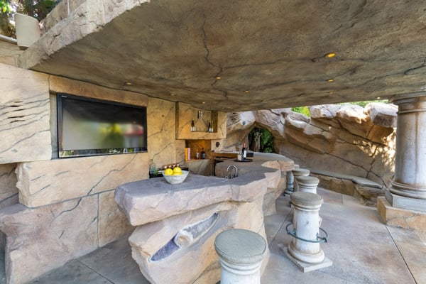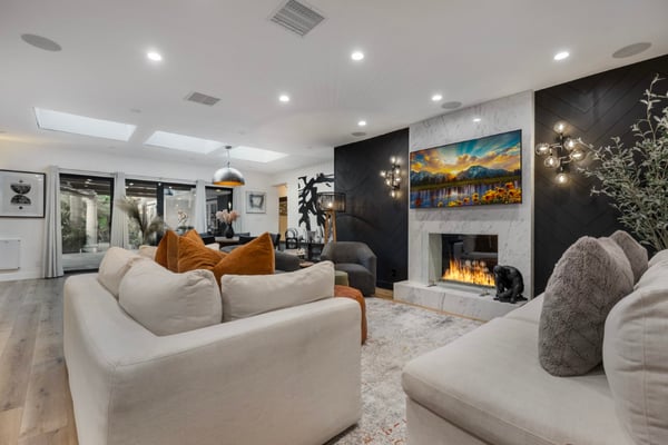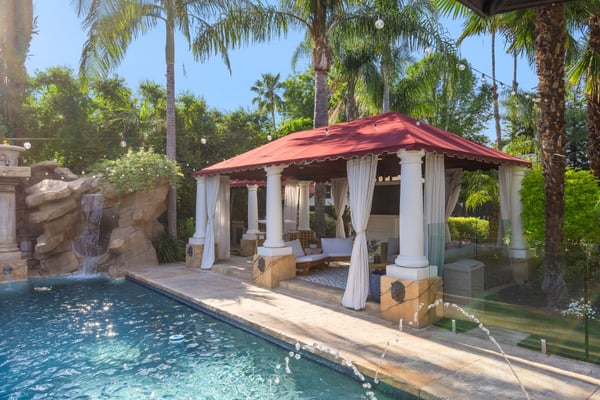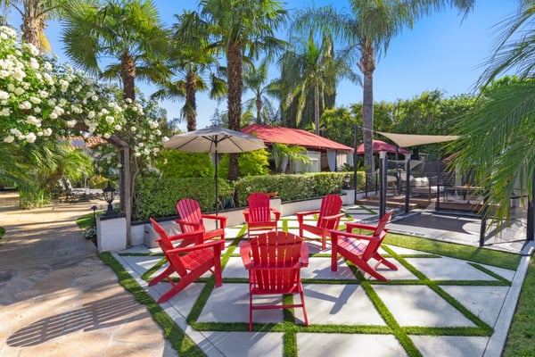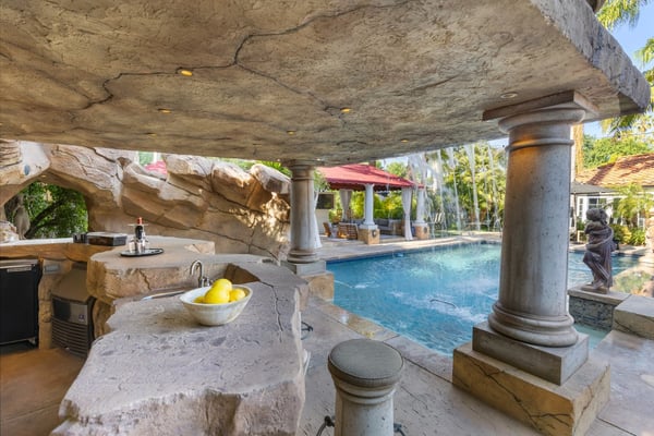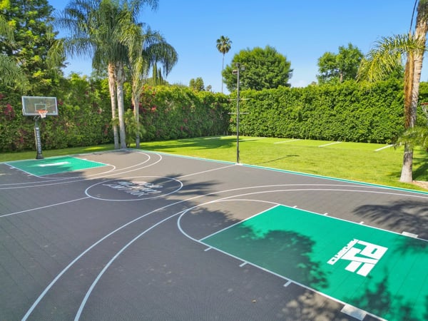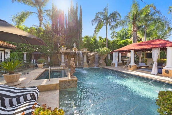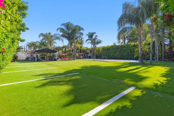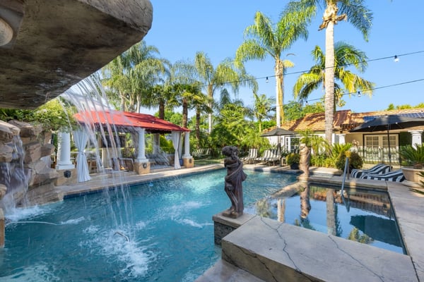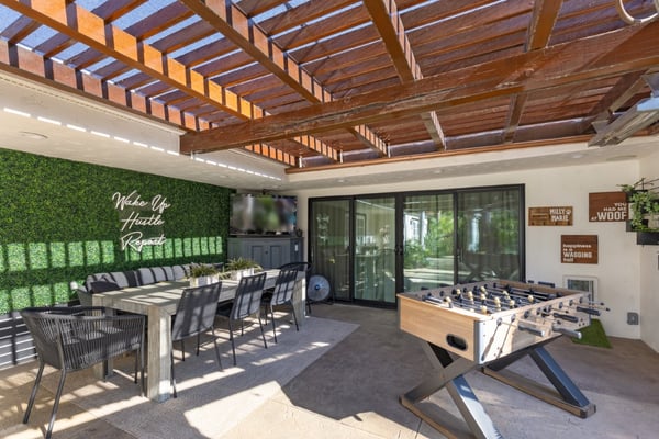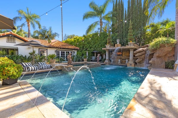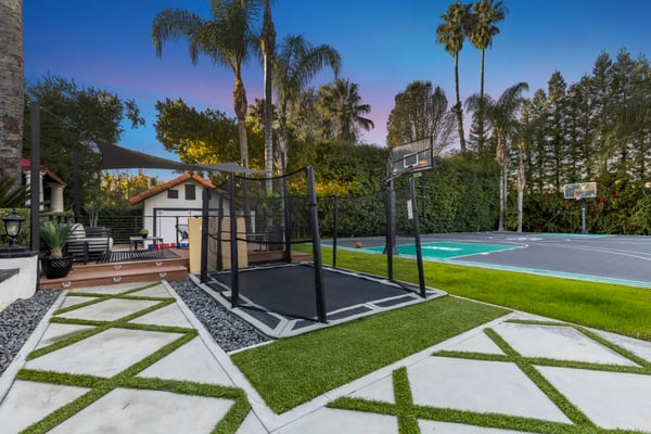 Step into the backyard and discover your own private oasis. Dive into the massive pool, complete with a mesmerizing waterfall, or lounge on the expansive grass lawn that calls for barefoot picnics and spontaneous soccer games. The outdoor area is designed for relaxation and entertainment, featuring a cozy lounge, a fully equipped bar, and a BBQ grill for those perfect evenings under the California sky. Why go out when all the entertainment you could ask for is right at your fingertips? Challenge your friends to a game of basketball on the full court, share laughs over foosball, or jump to new heights on the trampoline. For movie lovers, our theatre room promises unforgettable movie nights with your favourite films. Inside, the modern aesthetic combined with comfortable furnishings creates a welcoming atmosphere where everyone feels at home. Each space is thoughtfully designed to ensure your stay is as relaxing as it is enjoyable. With its private, gated entrance, you're invited into a world where your comfort and enjoyment are our top priorities. Erwin Estate isn't just a place to stay—it's a place to play, relax, and make memories. Whether you're looking for a fun-filled family getaway, a retreat with friends, or a serene spot to unwind, our home in Woodland Hills is the perfect backdrop for your next adventure. Please note: no garage access HSR25-001903