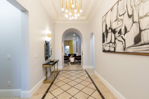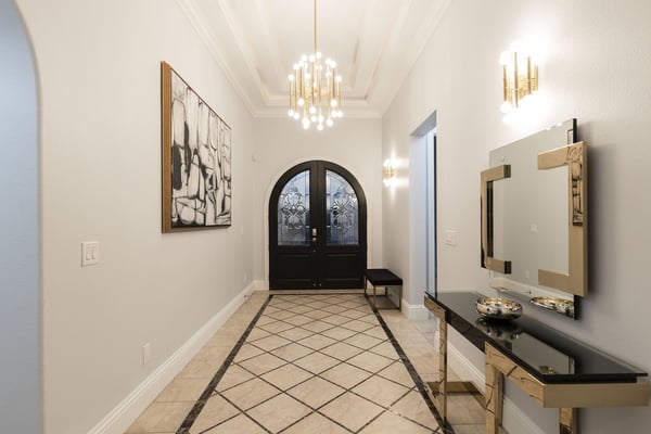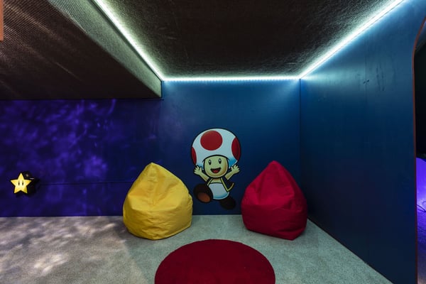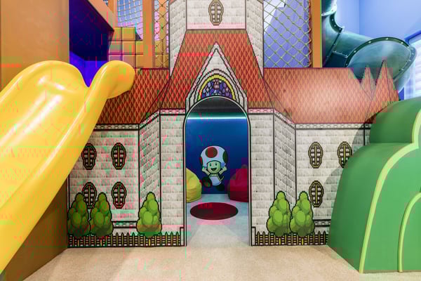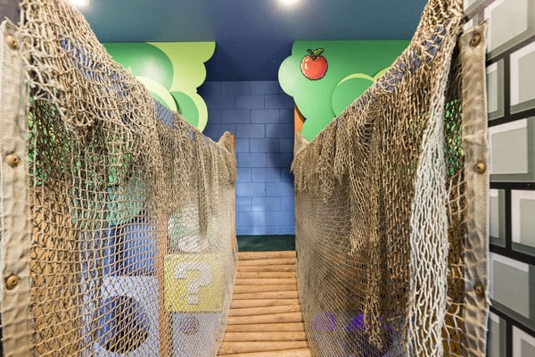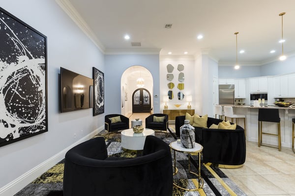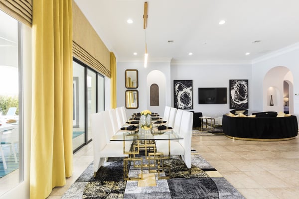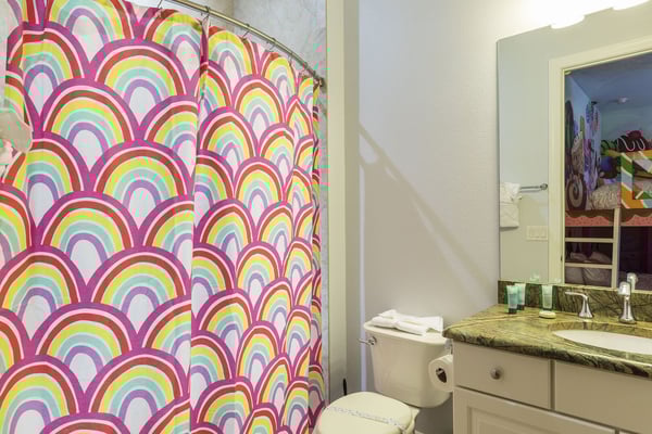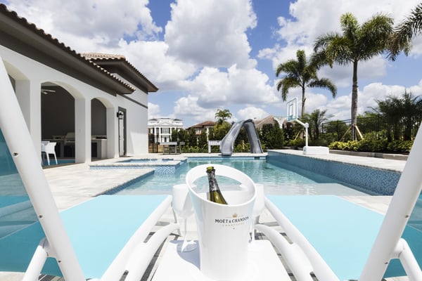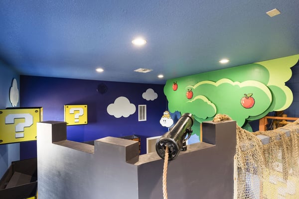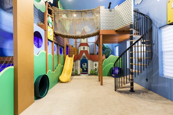 Step into a world of chic design and luxurious comfort in this stunning vacation home, where Art Deco touches infuse every corner with glamour. As you enter through the beautifully tiled entryway, you’re welcomed by an exquisite open living room and modern kitchen, both adorned in a sophisticated palette of gold and black. Oversized club chairs and a plush couch invite you to unwind and soak in the elegant atmosphere or gather around the flat-screen TV for a cozy movie night. The kitchen is a gourmet’s paradise, offering ample space and top-of-the-line appliances that inspire culinary creativity. Whether you’re preparing a quick snack or a gourmet feast, this kitchen is equipped to handle it all with style and ease. But the delights don’t stop there. This home is packed with entertainment options that will thrill guests of all ages. The home theater, featuring tiered seating and a PS4 video game console, sets the stage for epic movie marathons or gaming sessions. Meanwhile, the multi-story Mario-themed playroom is a child’s dream come true, complete with slides, tunnels, and a rope climbing course, providing endless fun and adventure. The bedrooms are designed with ultimate comfort and luxury in mind, each featuring its own flat-screen TV and spacious en-suite bathroom. The primary suite is a true standout, dressed in elegant black, white, and teal hues, with a tufted velvet chaise that’s perfect for stretching out with a bestseller, making you feel like royalty. Meanwhile, the children have their own magical escape in the Candyland-themed bedroom, complete with a fun slide that adds a touch of whimsy and excitement to their stay. The outdoor space is just as impressive, offering an expansive patio that’s perfect for entertaining or simply enjoying the beautiful Florida weather. The summer kitchen and gourmet grill make outdoor dining a breeze, while the abundance of seating ensures everyone has a place to relax. For those seeking some friendly competition, there are foosball and billiards tables, and the magnificent pool, complete with a kid’s slide and spillover spa, promises hours of fun for the whole family. This home truly combines luxury, comfort, and endless entertainment, making it the ideal setting for an unforgettable vacation.