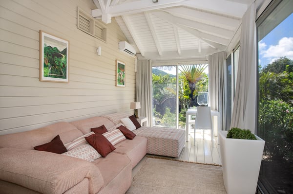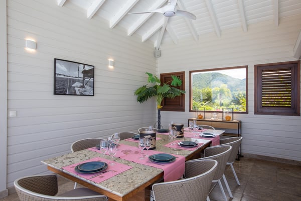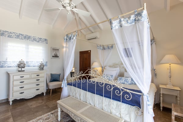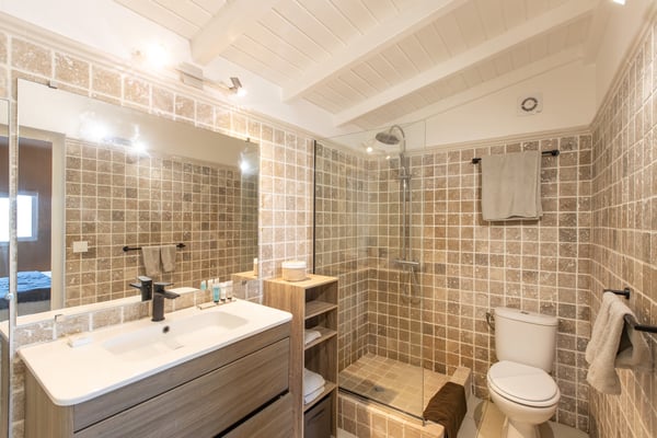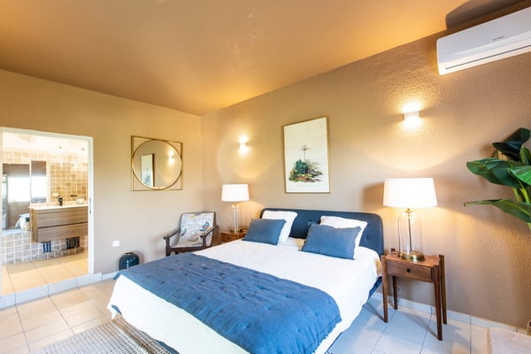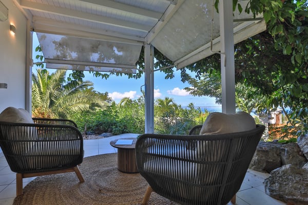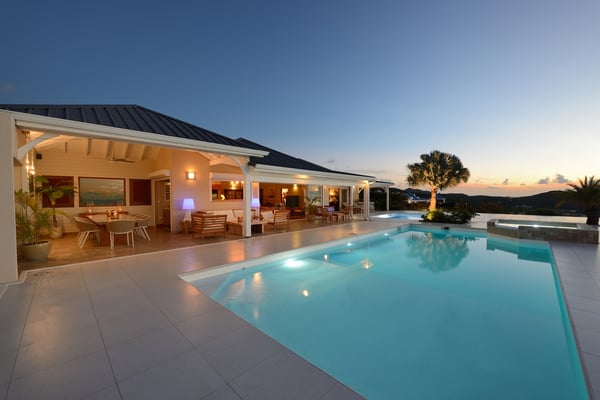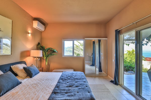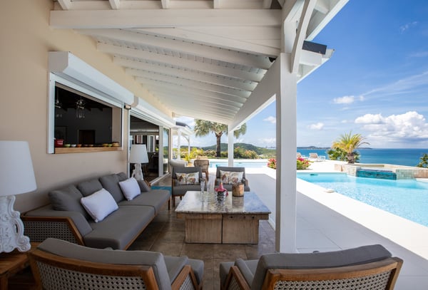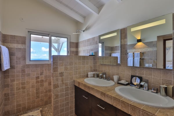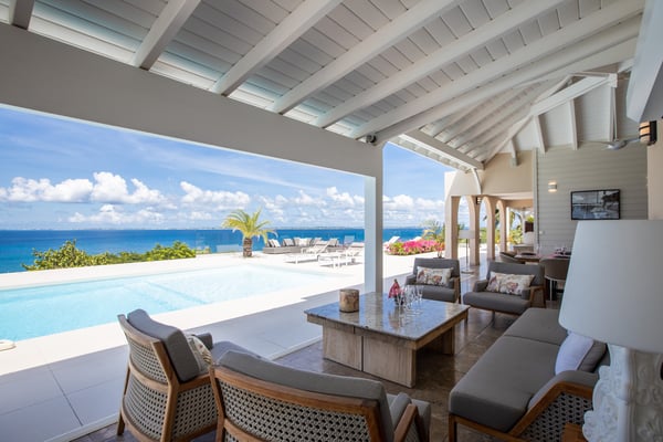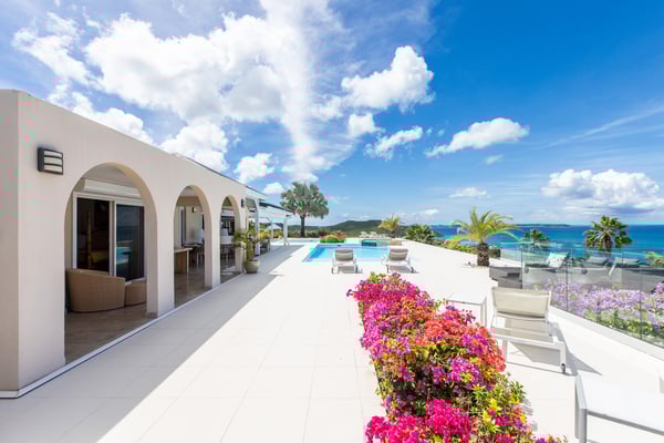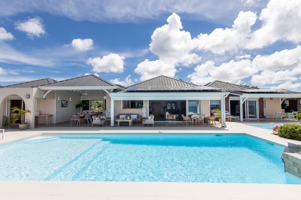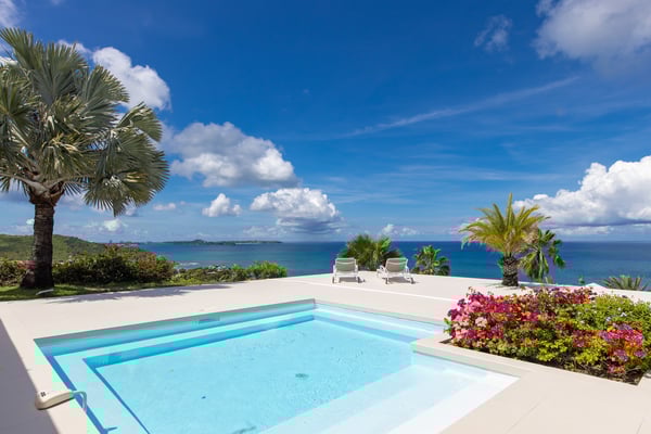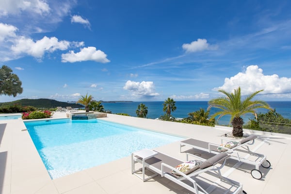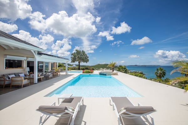 Villa Dreamin Blue, the most beautiful view of Saint Martin, which offers you a breathtaking panoramic view of the Caribbean Sea, sunrise, and sunset. Villa Dreamin Blue is a luxurious property that offers a truly remarkable experience in St. Martin. With its five bedrooms and five bathrooms, this villa provides ample space for relaxation and enjoyment. The highlight of the villa is its unique view of the Caribbean Sea, the coastline, and the neighboring island of Anguilla. The spacious terrace, adorned with palm trees and tropical flowers, features two heated pools and a bubble bath, offering a perfect oasis for ultimate relaxation. Three of the bedrooms offer stunning views of the Caribbean Sea and direct access to the pool terrace, allowing you to take in the beauty of the surroundings at any time. The fifth bedroom, located below the house and accessible by a path around the house, offers additional privacy for a peaceful stay. This unique room will allow you to fully enjoy your getaway with its breathtaking sea view and small private terrace, ideal for moments of relaxation and contemplation. Villa Dreamin Blue also boasts a fitness room equipped with an infrared sauna, providing a space for guests to maintain their wellness routine during their stay. The villa's location is also ideal, as it is only a 15-minute walk from the beach of Happy Bay and the popular beach of Friar's Bay. These beautiful beaches offer opportunities for sunbathing, swimming, and enjoying water activities. Also, immerse yourself in the excitement of Grand Case, the “gastronomic capital”, where renowned restaurants will awaken your taste buds. Stroll the lanes lined with elegant boutiques before diving into the vibrant nightlife just a short drive away. Villa Dreamin Blue thus offers a perfect balance between luxury, gastronomy, and entertainment. Villa Dreamin Blue is a dream villa, offering luxurious amenities, stunning views, and a prime location. Whether you choose to relax by the pools, explore the nearby beaches, or savor the culinary delights of St. Martin, this villa ensures an unforgettable stay. It can be rented as a two, three, four or five-bedroom villa, providing flexibility to accommodate your specific needs.
