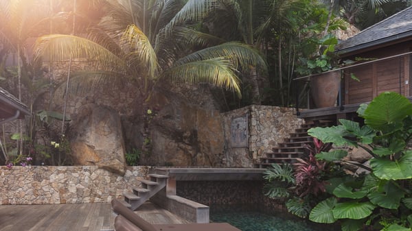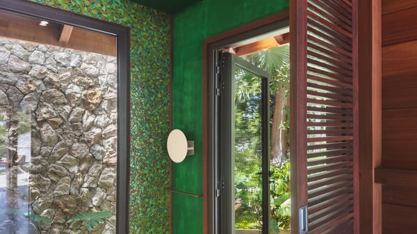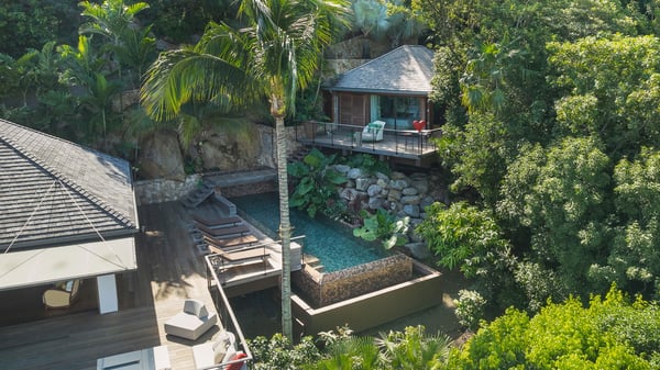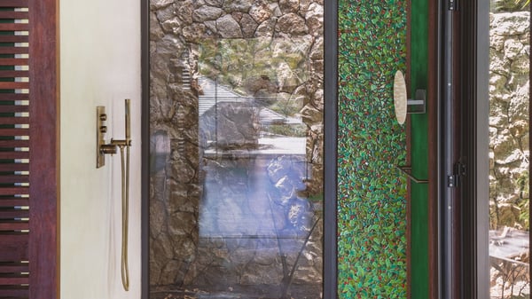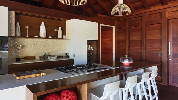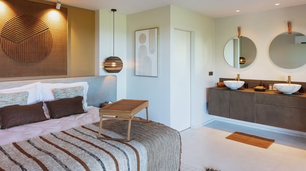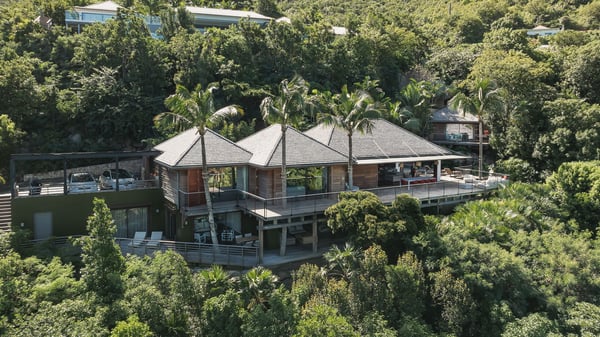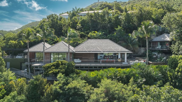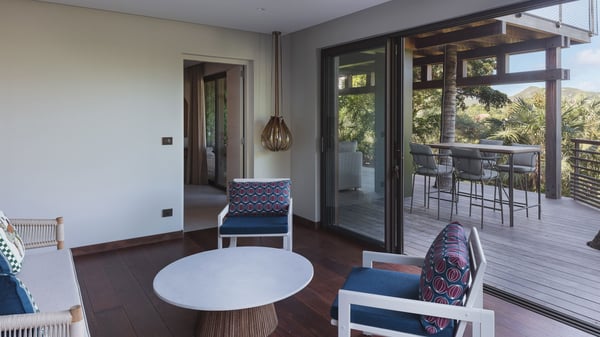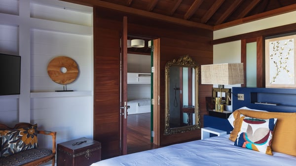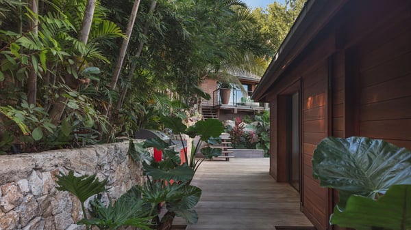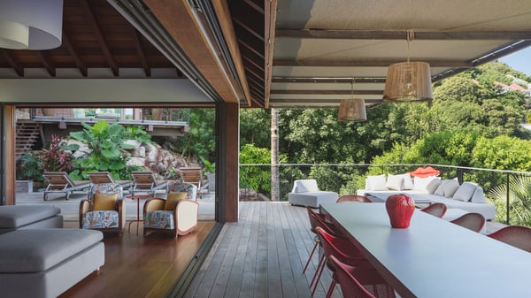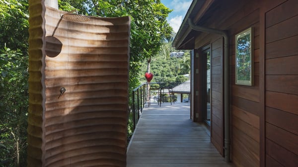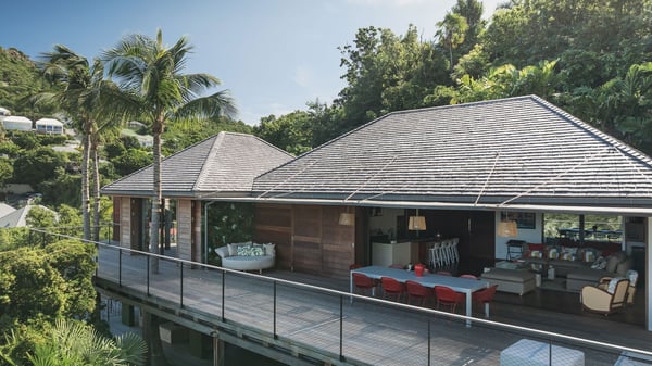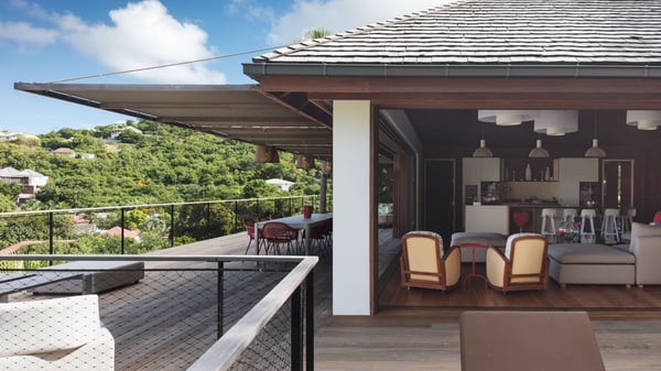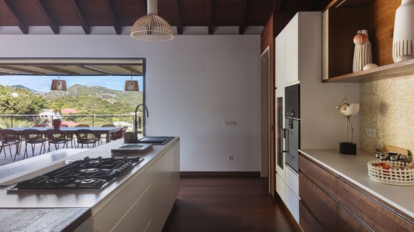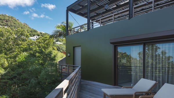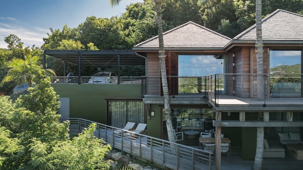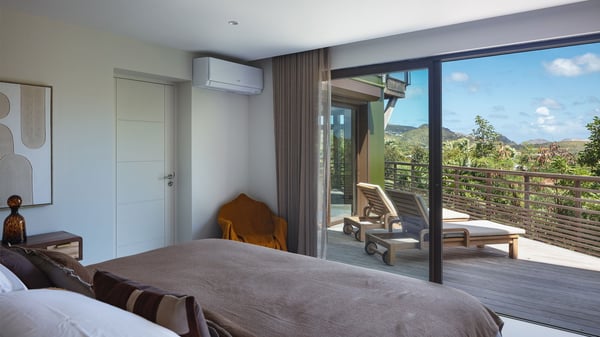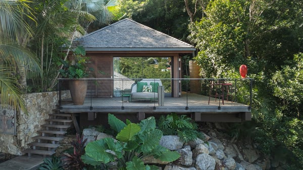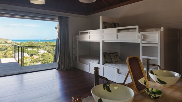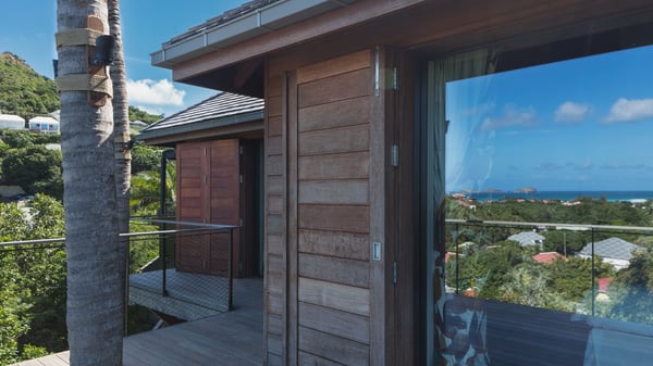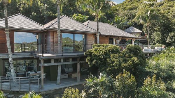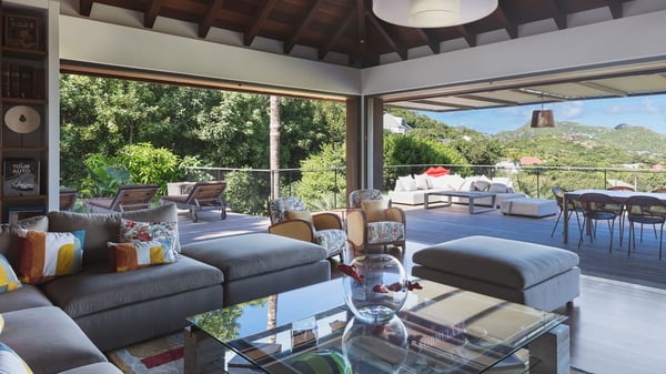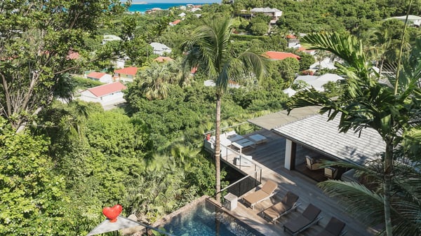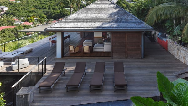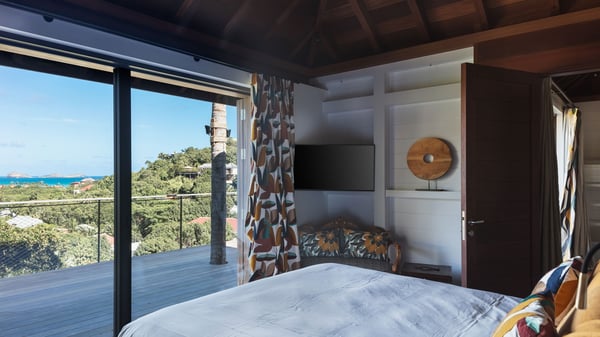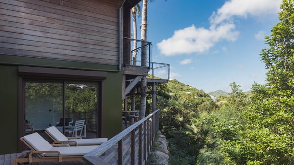 Villa SENNA is a stunning five-bedroom property with a swimming pool, ideally located in St-Jean. Nestled in the lush environment of St-Barths, this vacation home accommodates up to twelve guests in bright, airy spaces. With its high-end amenities and breathtaking views of the landscape and ocean, Villa Senna is the perfect place for an unforgettable stay in St-Barths. Built across multiple levels, the villa rental Senna welcomes its guests in a most refined, luxurious style, with exceptional comfort. The living area is bright, letting in the natural light through expansive openings, creating a serene and inviting atmosphere. The lounge features a plush sofa and armchairs with vibrant cushions beneath the high, exposed-beam ceiling. The open design allows for a refreshing sea breeze, ensuring moments of pure relaxation in utmost luxury. The fully-equipped kitchen, complete with a breakfast bar, extends from the living space and faces the rolling hills of St-Barths. Surrounded by the amazing tropical beauty, the soothing ambiance invites you to marvel at the Caribbean spirit in a luxurious setup. Villa Senna’s terrace opens onto the island’s lush scenery, offering a partial view of the crystal-clear waters. Under the covered part, you’ll find the al fresco dining area and the outdoor lounge, ideal for unwinding while watching the idyllic scenery. To the side, the heated swimming pool is framed by natural stone and wood, creating a tranquil spot for delightful moments of relaxation. There are also comfy sun loungers, the perfect spot to sip a cocktail while enjoying the beauty of this beautiful retreat. Villa Senna consists of five air-conditioned bedrooms, each with an en-suite bathroom—some with outdoor showers—and partial ocean and garden views. One of the bedrooms is located in a separate bungalow, just a few steps above the pool. Two bedrooms are on the main level, one with a king-size bed and the other with 4 bunk beds. Tha two other ones, with king size beds, are on the lower level and share a lounge area and a kitchenette. In a luxurious, Caribbean-inspired décor, each bedroom is a peaceful haven, inviting you to fully embrace the island’s natural ambiance. An area dedicated to sports is also at your disposal during your stay. Ideally located in St-Jean, the vacation rental Senna is a dream destination for an exceptional getaway for up to twelve guests in St-Barths.