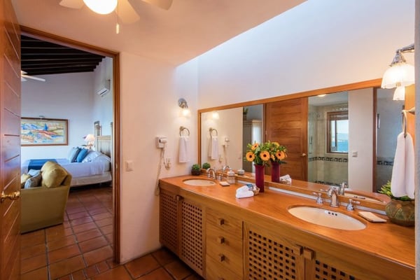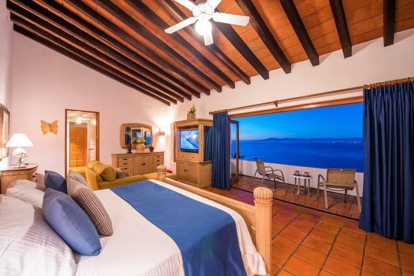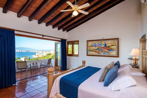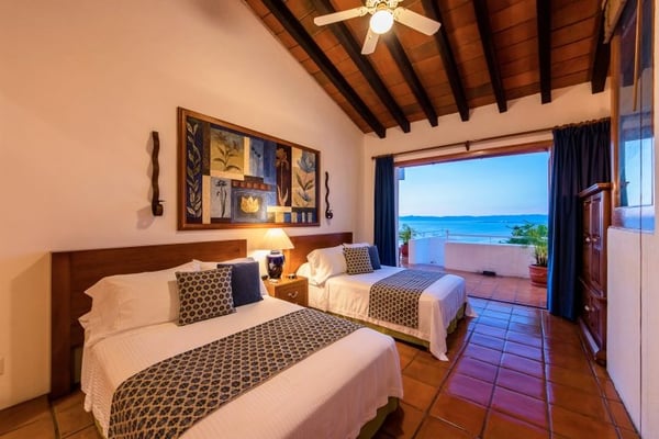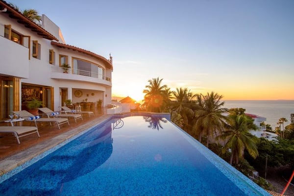 This Luxury Villa vacation rental is called Casa la Palma and features a contemporary style that simply feels like understated elegance. Casa La Palma sets the tone for this Puerto Vallarta Villa rental, with the Sierra Madre Mountains in the background and breathtaking views of Banderas Bay and picturesque Puerto Vallarta. Casa la Palma is located in the exclusive area of Conchas Chinas and just minutes into the Romantic Zone in Downtown Puerto Vallarta. This impressive vacation rental features four-bedroom suites each with private en-suite baths. Off the primary bedrooms, there is a twin bedroom ideal for teens or young children. This bedroom would share the primary bathroom. The main level great room is a common gathering place for guests and is open to the dining room, which leads out onto the luxurious outdoor terrace and heated infinity pool. The state-of-the-art gourmet kitchen features top-of-the-line appliances. Come and relax and enjoy all the amenities and services offered at Casa la Palma and enjoy the Magic of Puerto Vallarta.