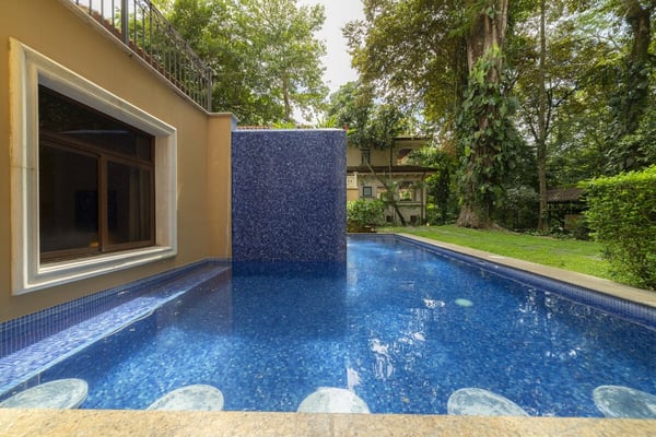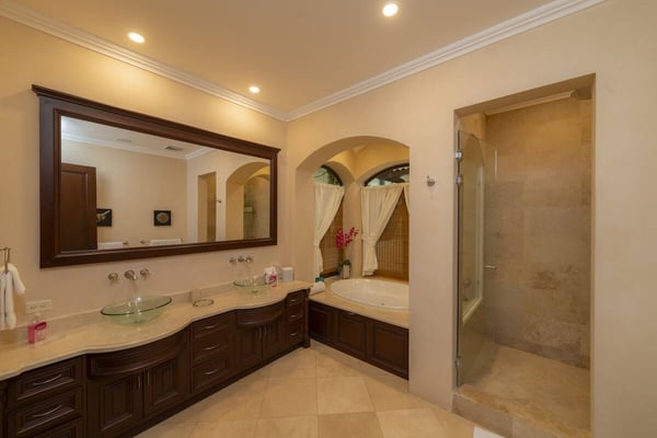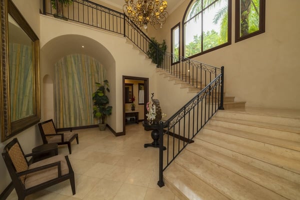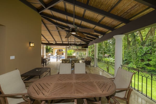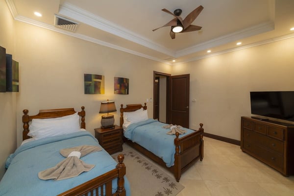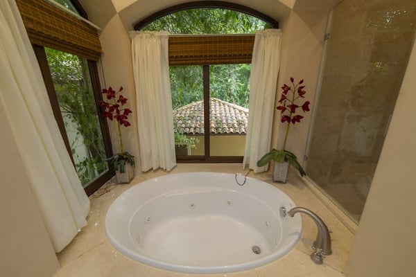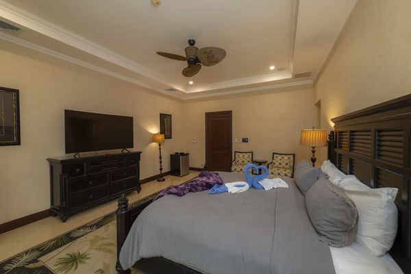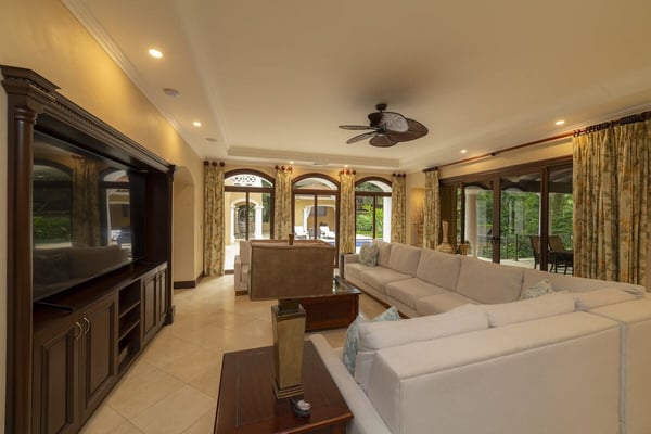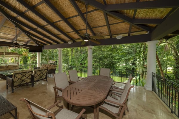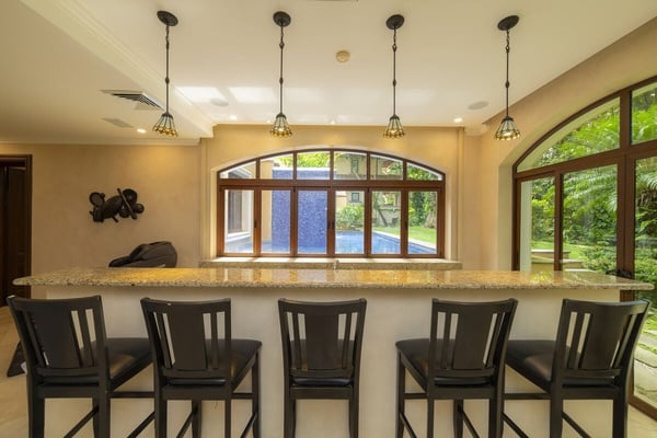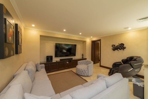 Book a stay in Casa Zafiro, Costa Rica, for a rejuvenating holiday complete with luxurious amenities and breathtaking views. This 11,000 square feet, seven-bedroom private villa is located in the exclusive Eco Golf Estates of Los Sueños Resort. With the capacity to comfortably accommodate 14 guests, Casa Zafiro delivers a holiday experience that feels luxurious and intimate for those traveling with friends or family. With lush jungle views on one side and stunning views of the golf course on the other, you get to enjoy varying hues of soothing green while lounging by the private two-level pool, or enjoying a drink at the pool bar. Other amenities include a relaxing jacuzzi, an expansive terrace with a BBQ area and HDTVs for unforgettable gatherings. A game room with a bar and pool table, and a home theater offer additional opportunities to spend quality time with your loved ones. At night, you can retire in the beautifully appointed bedrooms, each with its own bathroom for ultimate privacy. A unique outdoor gazebo offers a serene space for massages amidst nature for those seeking ultimate relaxation. Designed by Federico Castro, Casa Zafiro combines elegance with comfort, making it the perfect getaway. Casa Zafiro is located within Los Sueños Resort, Costa Rica's premier destination for luxury and adventure. The exclusive Los Sueños Beach Club, Marina Village, La Iguana Golf Course, and world-class day spas are all just a short golf cart ride away. The resort also offers a variety of gourmet restaurants and vibrant bars to choose from, ensuring there’s something for everyone. Whether you're exploring the lush surroundings or enjoying the resort’s premium amenities, Casa Zafiro provides an unparalleled vacation experience.