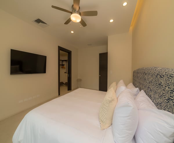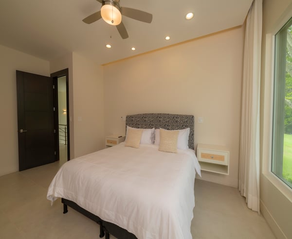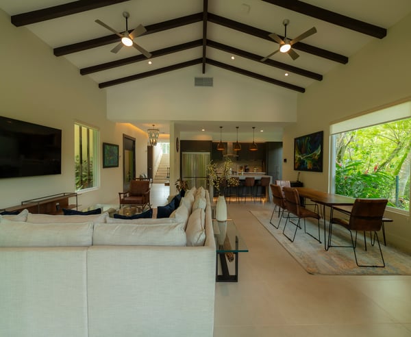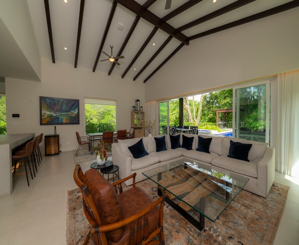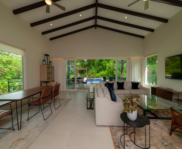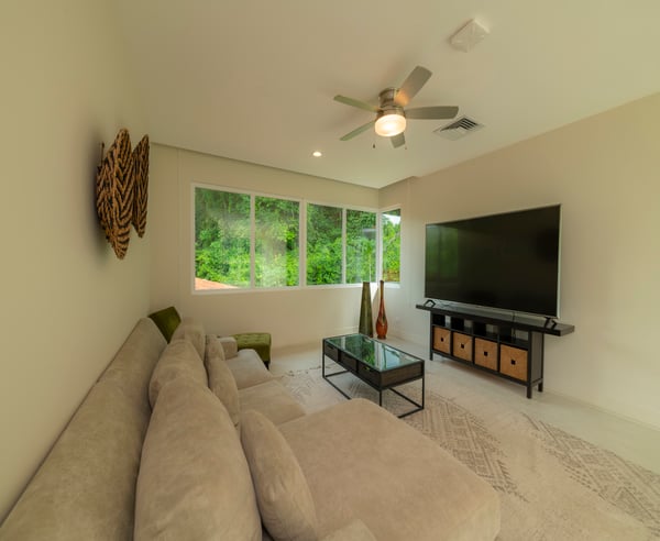 Casa Forest is a stunning private residence in the new Forest Estate community. It features four bedrooms and four and a half bathrooms. The location is perfect, with a breathtaking rainforest and a golf course surrounding it. You'll love the contemporary finishes throughout this spacious two-level home. The living room and open kitchen feature large floor-to-ceiling retractable sliding doors that lead to a beautiful patio, pool, and jacuzzi surrounded by nature. The primary suite is conveniently located on the ground floor, while the second level offers three more bedrooms, each with a private bathroom and a second living room. Large windows and sliding doors provide ample natural light throughout the villa, and a glassed-in staircase leads to the second level. Conveniently located only a few minutes from the resort's center, the villa is nestled in a peaceful setting, surrounded by tropical trees and rainforest-covered mountains. The Los Sueños developer built this exquisite villa.